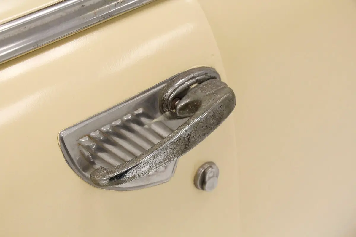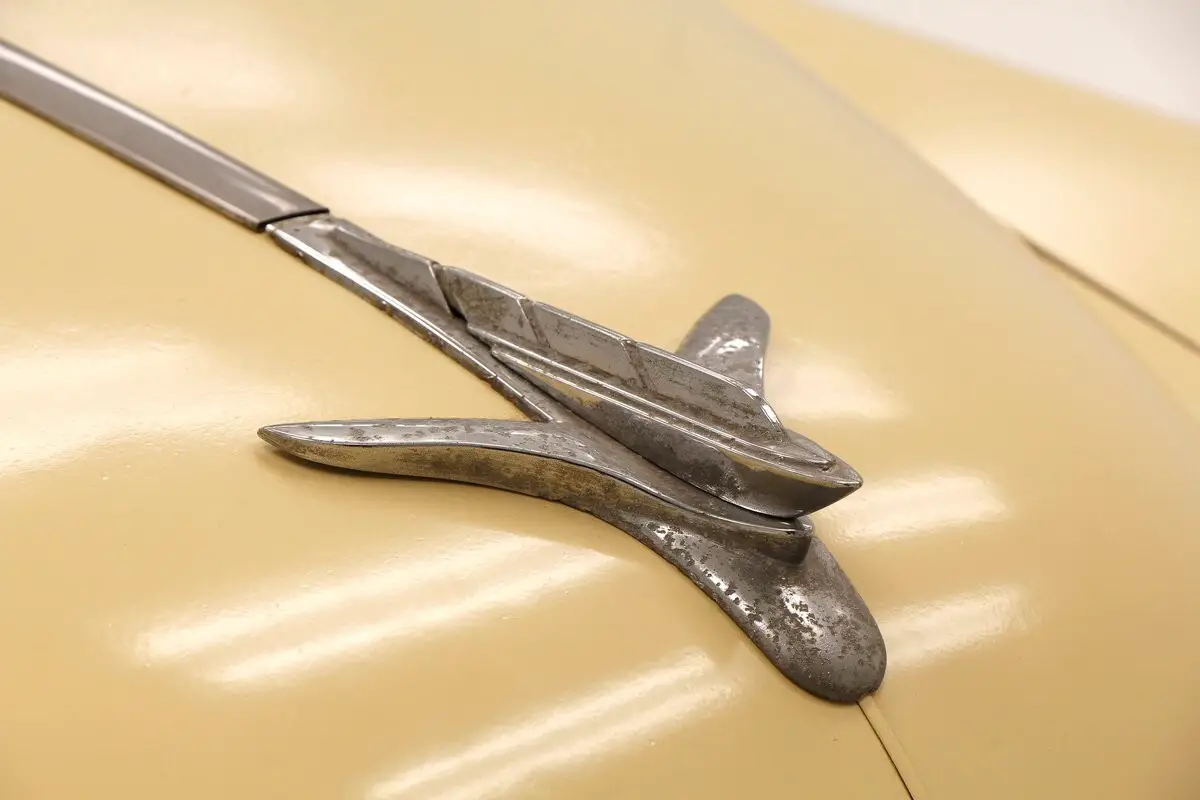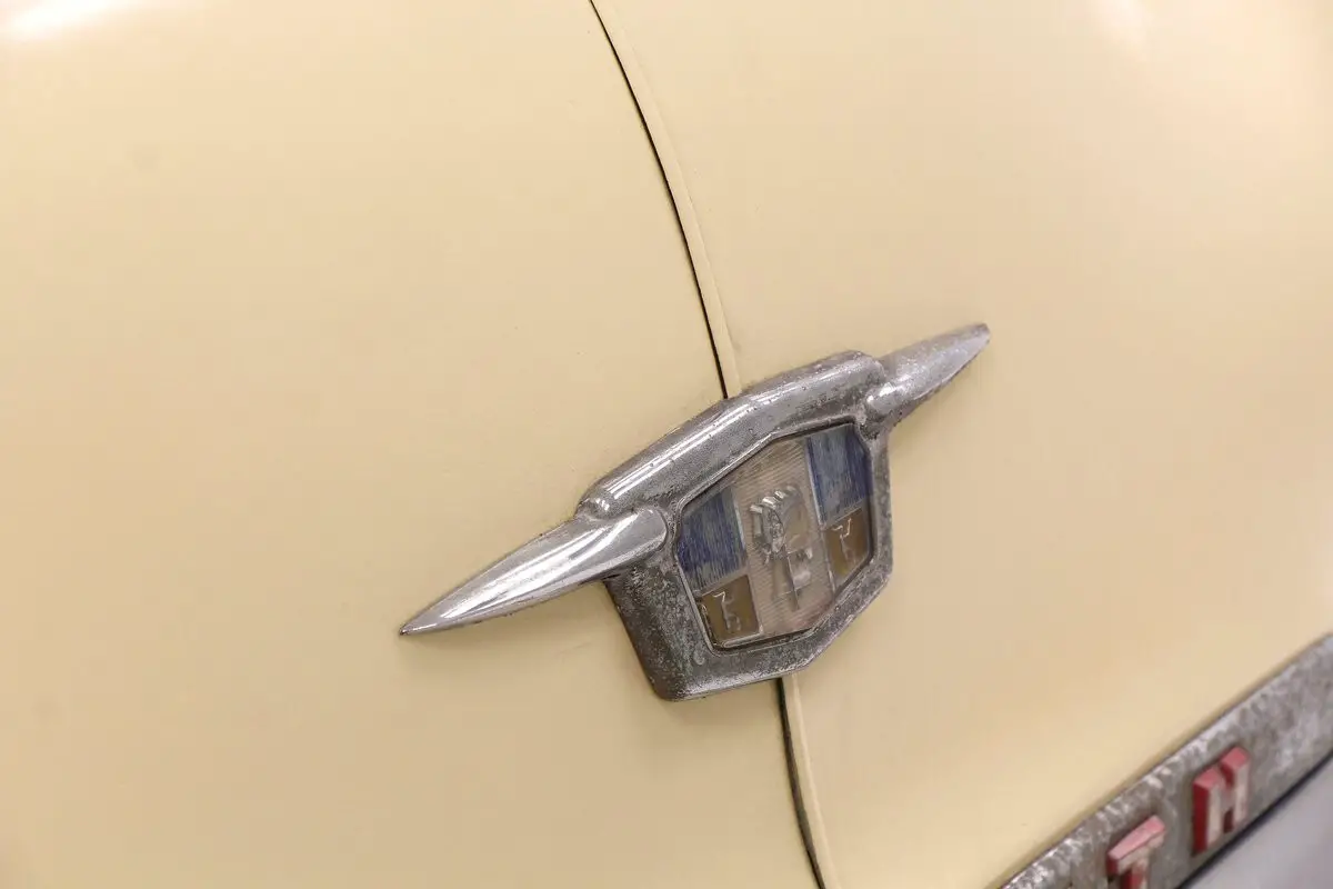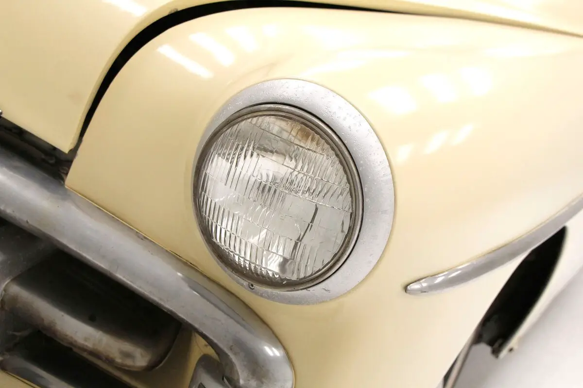 Straight rust free steel exterior panels have inconsistent gaps, with doors and trunk not closing totally properly. Yellow paint in reasonable shape showing a bot of fading and dulling but no rust on the exterior of this car. All trimmings have dulled and show pitting throughout. A round bulbous design makes this otherwise utilitarian car show some respect for itself with said design. In 2 door form it's fairly sporty for 1951. Glass is all there and window trimmings are faded and dulled as well. Chromed moon style caps are covering all 4 corners which have versos and sundry tires attached to each corner.