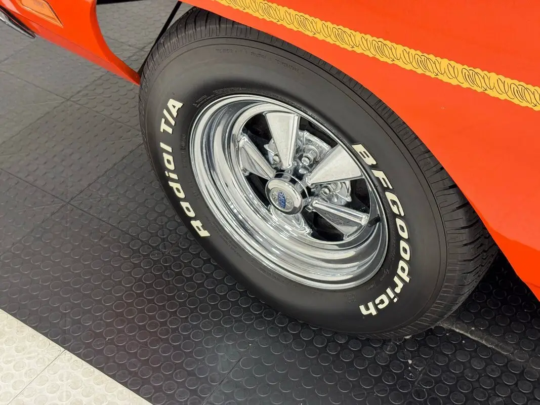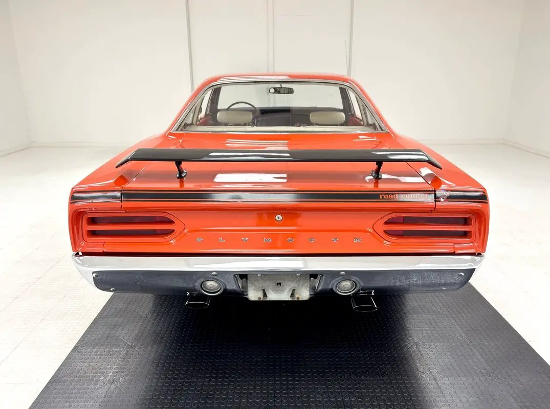 This one's got all the fun exterior cues. Plymouth written on the rear fenders large enough to see from the top of the stands at Talladega, the black band across the decklid rim, the wide black stripe on the hood, and trail of orange dust emitting from the quarter panel scoop and forms a side stripe behind the Road Runner bird smiling his way forward up front. In the very front, that face created by the quad headlights in the shapely grille over the larger marker light embedded in the chrome bumper is the epitome of muscle. Machismo is further enhanced by the hood pins, power bulge, and rear wing. 15-inch Cragar SS carry staggered size tires that are less than six years old. Imperfections include some minor pitting on metal bits, scratches, bubbles, imperfect filler fixes, less than perfect gaps, and waviness throughout due to filler.