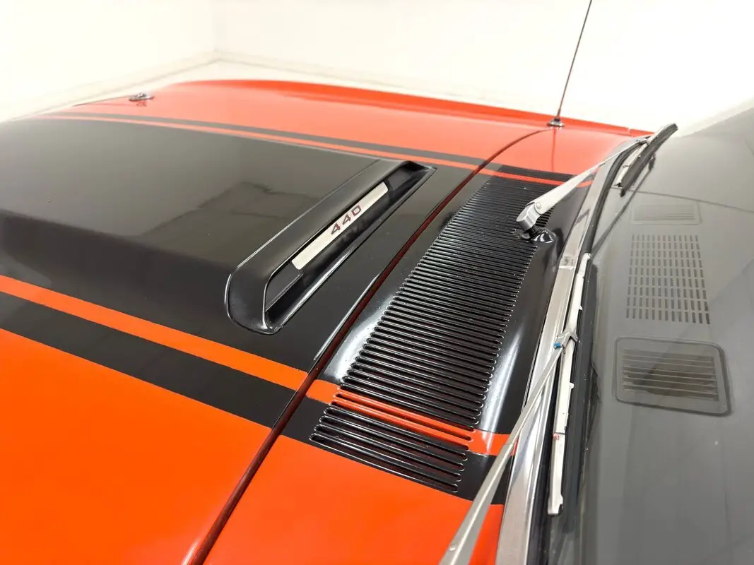 Under the hood sits a clean 440ci V8 with finned Mopar performance valve covers and an aluminum radiator. It's topped by a 4-barrel carburetor and mated to its numbers matching A833 4-speed manual transmission. The 8 ¾" differential has 3.55 gears according to our consignor but the axle tag indicates 3.21 ratio. Drum brakes are equipped at all four wheels.