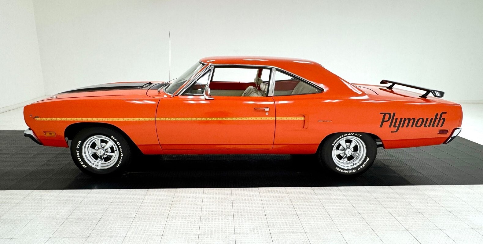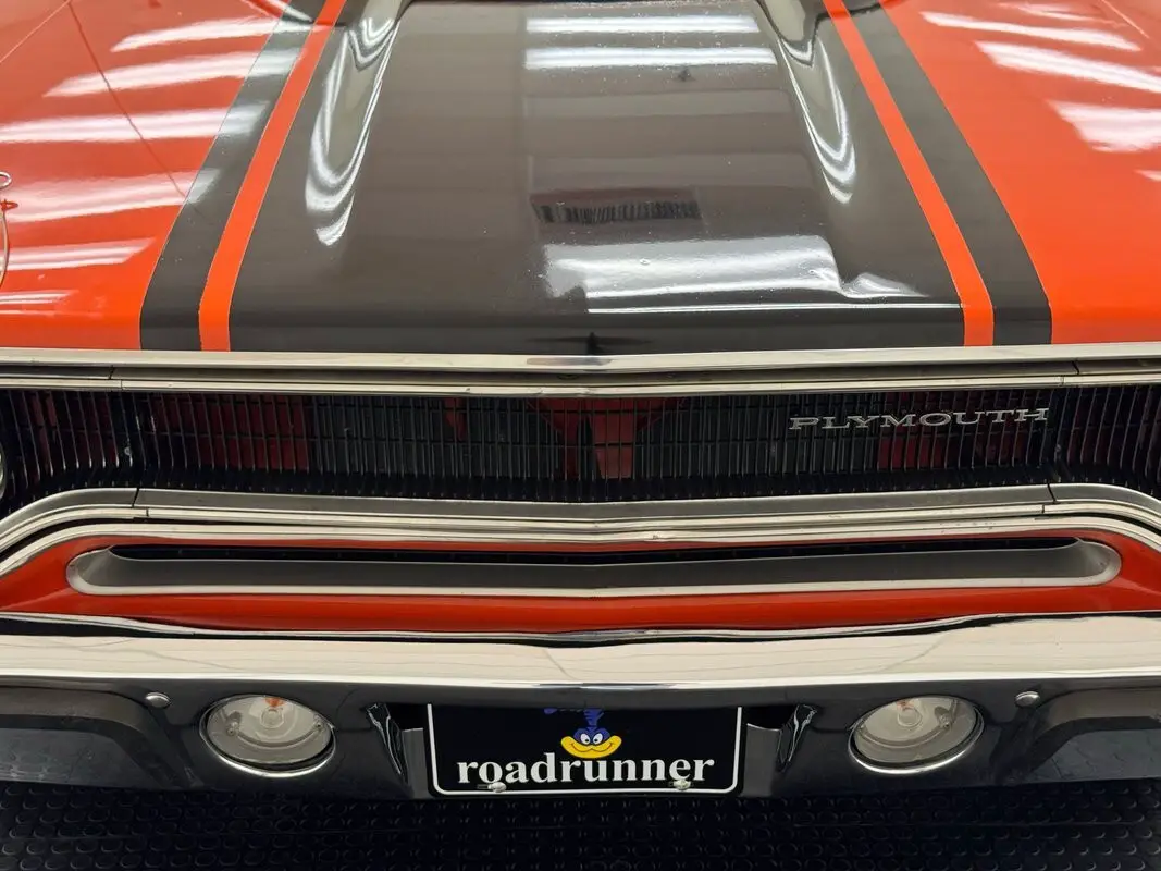 This one's got all the fun exterior cues. Plymouth written on the rear fenders large enough to see from the top of the stands at Talladega, the black band across the decklid rim, the wide black stripe on the hood, and trail of orange dust emitting from the quarter panel scoop and forms a side stripe behind the Road Runner bird smiling his way forward up front. In the