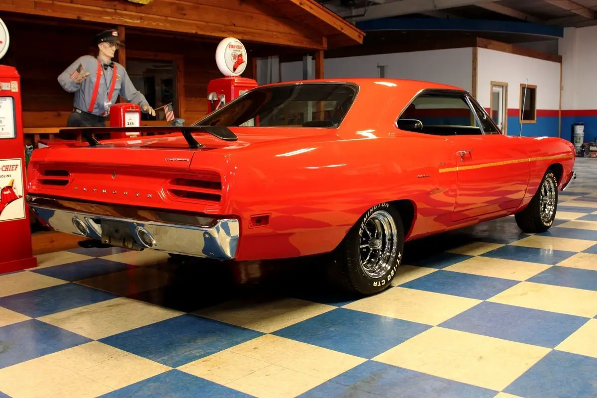 440 cui Mopar V8 engine (casting# 2536430-6). Automatic 727 transmission with column shift. 8 3/4 rear end with 3.23 gears. Painted Rally Red (code FE5) with Black Hood stripe Road Runner Dust Trail striping. Black with Silver Trimmed Vinyl bench seat interior. Power steering. Dual exhaust with manifolds. Front sway bar. 4 barrel carburetor. Dual snorkel air cleaner. Factory gauge cluster. Remote driver-side mirror. Front / Rear lap belts. Bulge hood. Rear spoiler. 15" Magnum wheels with Radial tires.