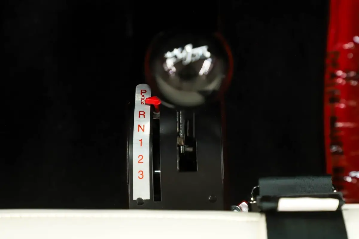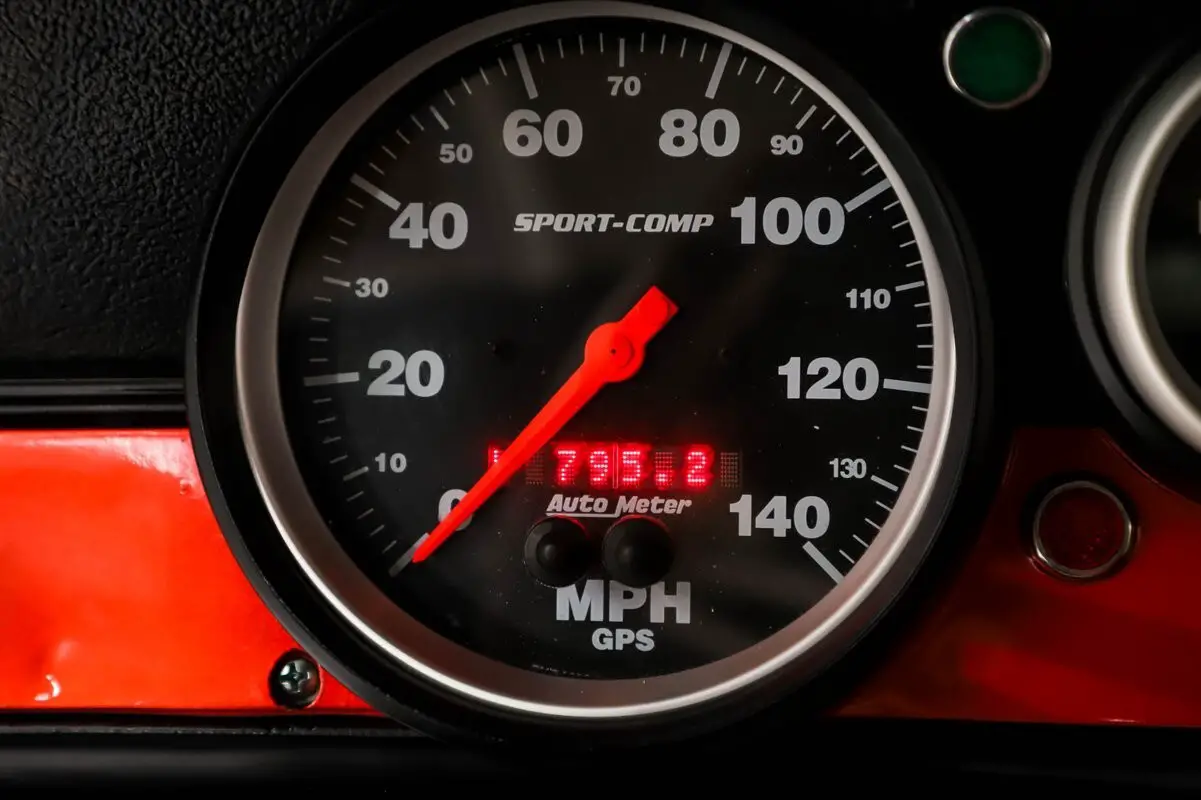 INTERIOR: The pearl white interior is very refreshing. The upholstery fits snug on the recushioned seats. The armrest is a very comfortable feature. The door panels and armrests were replaced. Overhead is a crisp white headliner and visors. Down on the floor is sound deadener under the carpet and a slapstick shifter to bang those gears with. The dash is decked out with a new dash pad, Sport Comp gauges, GPS speedometer, custom heater controls, and a 12 volt receptacle. There's a Custom Autosound stereo system with an amp, kick panel speakers and 6x9s in back. And upgraded fuse panel and most of the wiring was replaced. The metal trim was color matched to the exterior.