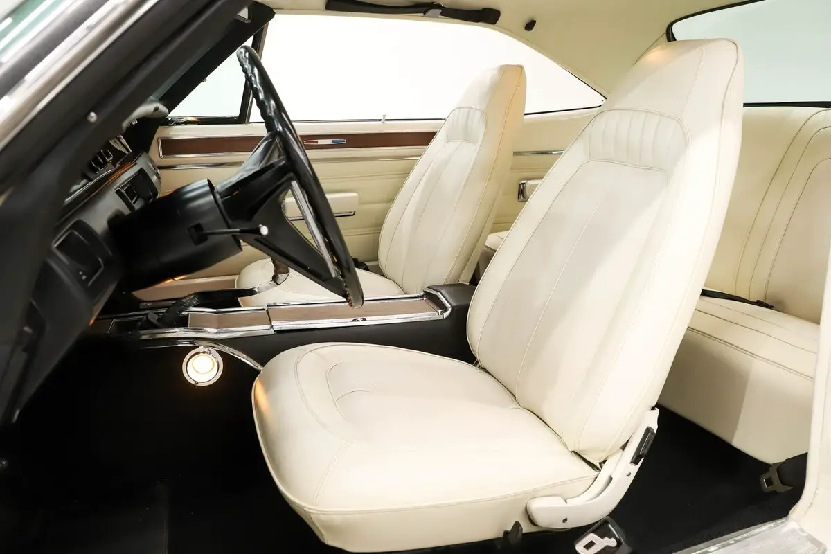 EXTERIOR: It's a Road Runner in disguise! Super cool raised hood with a 383 callout and black stripe. Beautiful clean and straight metal all the way down the side of the body with smooth contours and crisp lines. All the panels are aligned correctly with good consistent gaps. The doors close easily with minimal effort, even if the windows are up. The Alpine White paint was neatly applied then polished to a smooth and slick finish. The black vinyl top looks totally fresh. All the chrome and bumpers are shiny and sparkly. The honeycomb style front grille is in great shape and the headlights were upgraded with high intensity units. All the glass is crystal clear. It has four brand new chrome Magnum 500 wheels: 15x7s in front, 15x8s and back.