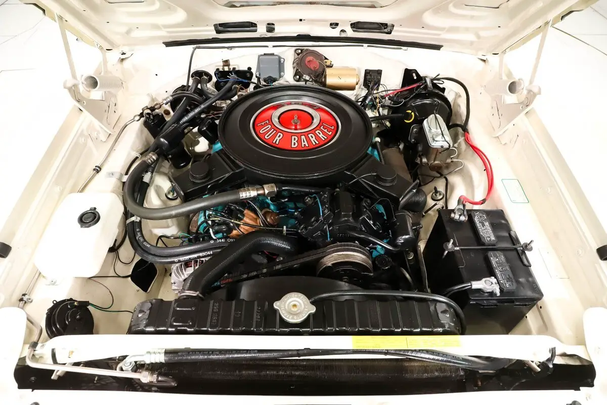 UNDERSIDE: It looks like it was flipped on a rotisserie because the underbody is all clean metal painted glossy Alpine White. The steering and suspension look to have been rebuilt. It has newly converted disc brakes in front, the brake lines also look new, and the e-brake is hooked up. Totally new fuel system including the tank. Nicely installed and new exhaust system with Cherry Bomb full size mufflers. Looking up at the date code correct engine it is absolutely spotless. It also has the original VIN number matching 4-speed transmission and a 8 ¾" rear end out back.