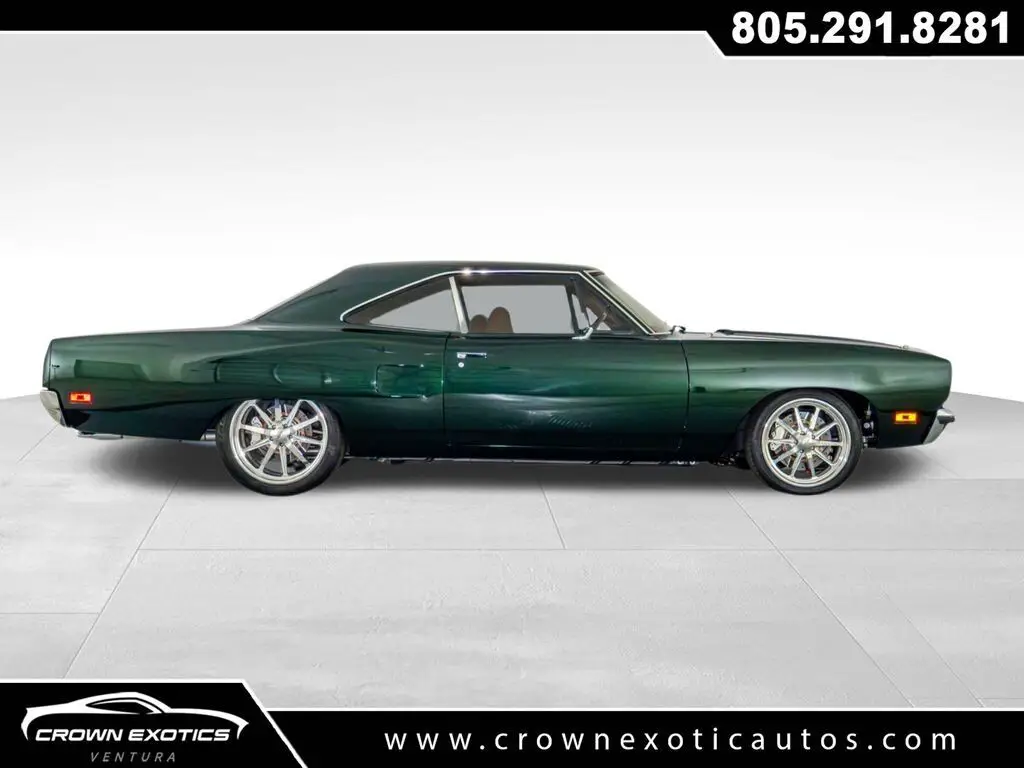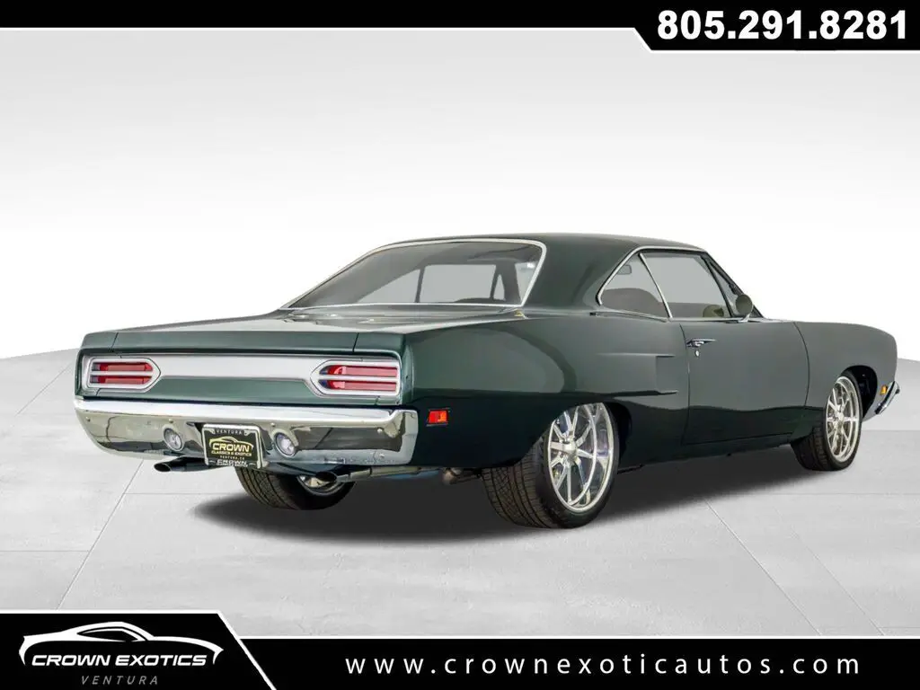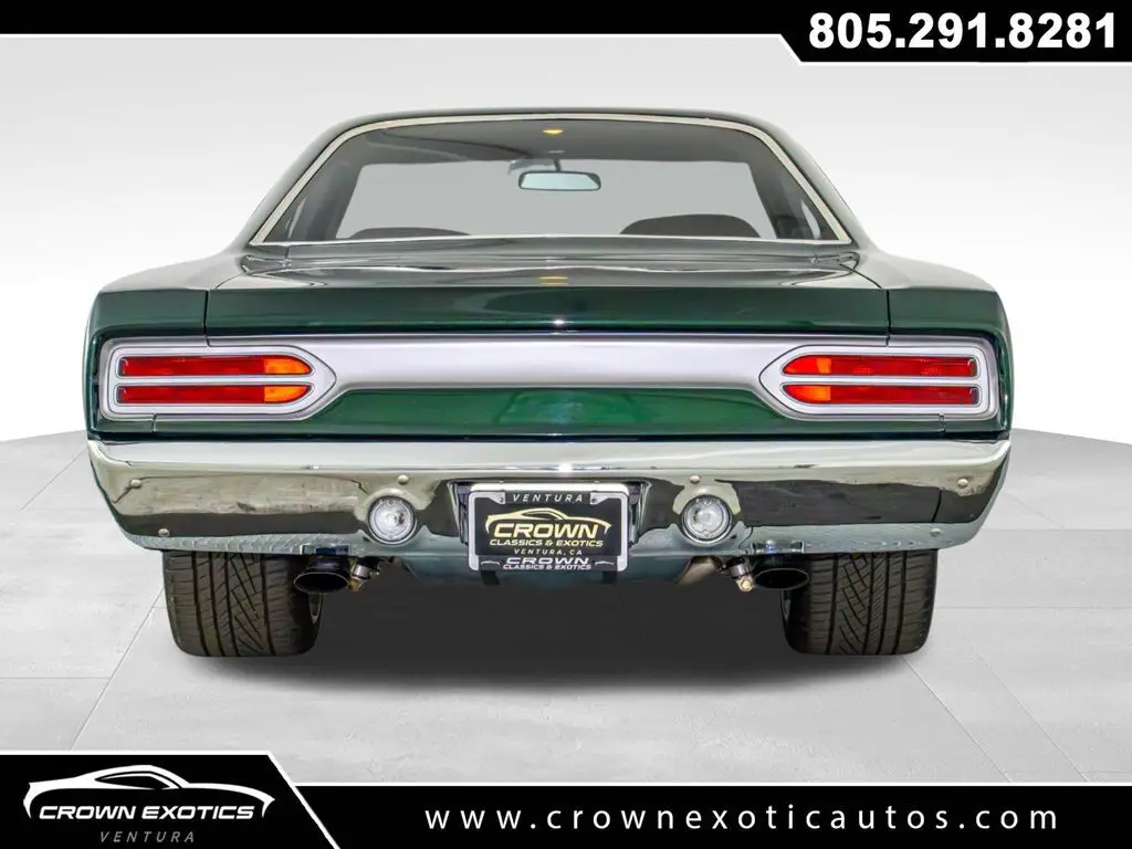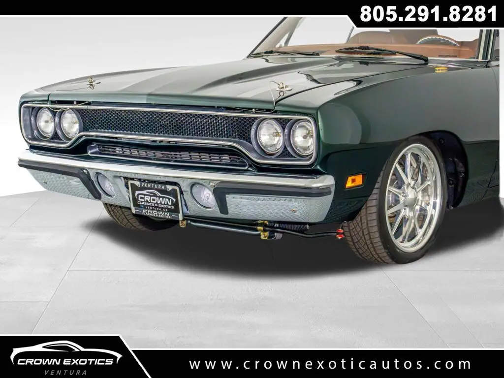 This Road Runner has been painted a custom-mixed green thats accented with silver graphics. The paintwork is said to be in concours condition, with no swirl marks and no blemishes. Details of the bodywork prior to painting are unknown, but the seller reports great attention to detail in the panel gaps and overall straightness of the sheetmetal. No rust in the body, either. The glass and seals are said to be new, and the exterior chrome and additional trim appear to be in great condition, per the provided photos.