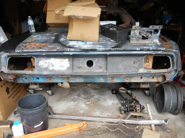 Was very badly rusted through and I have started to remove the old floor. The car originally had a trunk rack that was removed years ago. Water apparently leaked through and rotted out the trunk floor. I have removed the old floor. The rear frame rails are very solid.
