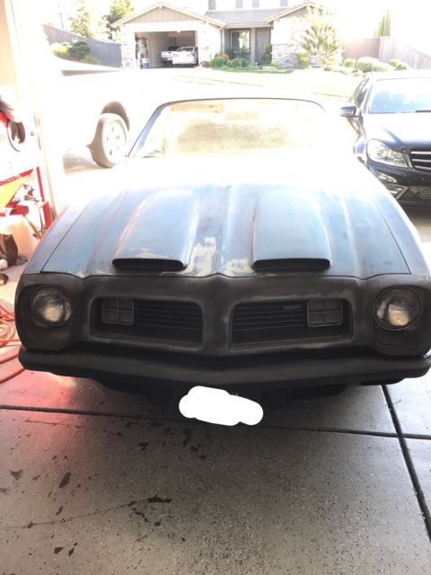 For sale is 1975 Pontiac firebird project, has a Pontiac 350 motor with 350 transmission. Car was originally a manual but swapped over to an automatic at some point in time. Runs and drives great. Has oil leak. Has typical rust in rear quarters and trunk, interior looks great other than tear in drivers seat. Car also has a formula hood, great father son project, all it needs to be a driver is to finish body work and a paint job