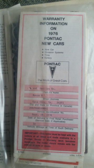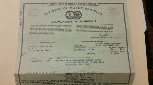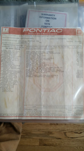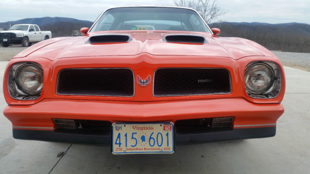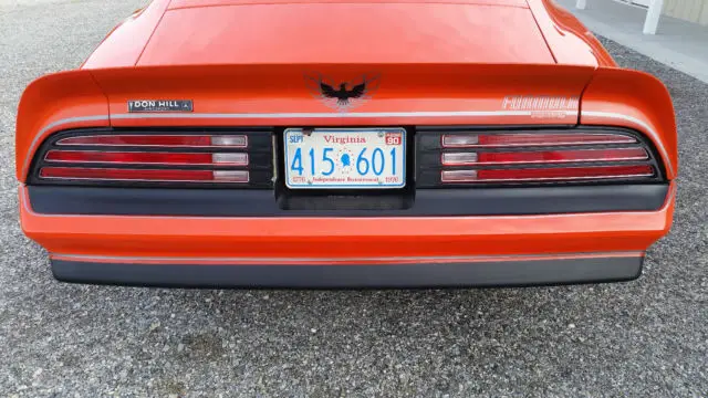 FOR SALE IS AN AMAZING CAR. THIS IS A TIME CAPSULE, ONCE IN LIFE TIME OPPORTUNITY TO BUY A COMPLETELY ORIGINAL FIREBIRD FORMULA 400. THIS CAR HAS ONLY 10362 MILES. IT HAS ITS ORIGINAL TIRES, EXHAUST, BELT, SHOCKS, HOSES, BRAKES, GAS TANK, BRAKE LINES AND GAS LINES, PAINT, WHEELS, EVEN THE VIRGINIA LICENSE PLATE IS ORIGINAL TO CAR. CAR BOUGHT NEW IN KINGSPORT TN. ATDON HILL PONTIAC. THE OWNER LIVED IN GATE CITY VIRGINIAABOUT 20 MILES APART. HE DOVE THE CAR UNTIL 1990AND PUT10329 MILES ON IT. WAS SOLD AT ESTATE AUCTION AFTER HIS DEATH AND HAS BEEN INSIDE SINCE THEN CAR HAS BEEN DRIVEN 33 MILES IN 27 YEARS. MOTOR HAS NOT HAD A BOLT TURNED ON IT. THE OIL HAS BEEN CHANGE, NEW PLUGS, AND AIR FILTER, ONE FAN BELT,AND MASTER BRAKE CYLINDER CHANGED. I DO HAVE ALL THE ORIGINAL PARTS, PLUGS, AIR FILTER, ONE FAN BELT, AND MASTER BRAKE CYLINDER COME WITH THE CAR. THIS CAR COMES WITH ALL DOCUMENTATION. FIRST THE ORIGINAL WINDOW STICKER (NOT COPY) THEN DEALER COPY OF STICKER, ORIGINAL VIRGINIA TITLE DATED 10/04/1976, WARRANTY BOOK WITH OWNERS NAME AND ADDRESS DATED 9/28/1976 WITH IO MILES ON CAR. TO PROVE MILES HAVE EVERY VIRGINIA STATE POLICE INSPECTION CERTIFICATES FROM 1976 T0 1989 FROM 154 MILES TO 10329 MILES. ALSO HAVE ORIGINAL DMV RECEIPT WHERE TAXES WAS PAID 9/30/1976 140.00 DOLLARS. HAVE 9 OF 14 REGISTRATION CARDS WITH OWNERS NAME AND ADDRESS AND TAG NUMBER WHICH IS STILL ON CAR. HAVE A FEW OF COUNTY RECEIPTS FOR COUNTY STICKERS (SCOTT COUNTY). CAR STARTS UP AND DRIVES NICE. THIS CAR HAS NOT HAD ANY BLACK PAINT OR UNDERCOAT SPRAYED UNDERNEATH. EVERTHING IS CORRECT AND ORIGINAL TO CAR EXCEPT THINGS LISTED ABOVE. THE ONLY THINGS THAT DONT WORK ARE AM RADIO AND CLOCK, EVEN THE DOOR BUZZER AND SEAT BELT LIGHT STILL WORK.I DO NOT HAVE THE ORIGINAL BATTERY. ALL ORIGINALOWNERS MANUALS ALSO WITH CAR. PLEASE CALL IF YOU HAVE QUESTIONS ABOUT CAR 540-230-2800.IT IS PRICED TO SELL. A REAL TRUE ORIGINAL CAR. THANKS FOR LOOKING. IF YOU HAVE INTEREST INMORE PICTURES I HAVE A LINK I CAN SEND YOU WITH 150 PICTURES JUST SEND ME AN EMAIL ADDRESS TO SEND TO.