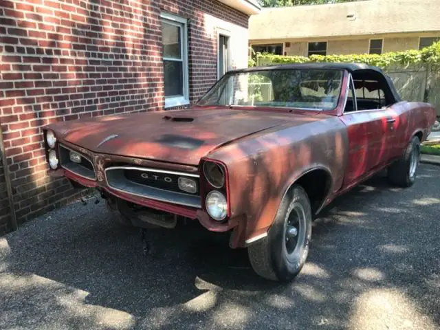 1966 Pontiac GTO Convertible: body was taken off the frame, originally red with black interior, documented original rebuilt matching 389 motor, automatic trans, new suspension, power top and power steering, floors are in very good condition. Car could use new trunk pan. Needs a new paint job and interior work done. Car was NEVER started. Comes with too many parts to list. I have clear title in hand. Located in Deer Park, NY. (11729). Additional pictures are also still available. Please call Lou for any questions or other info: 516-721-3951.