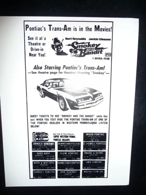 FOR SALE IS THISVERY NICE REPRODUCTION OF A RARE1977 FULL PAGE PRINT AD TAKEN OUT BY ALL OF THE WESTERN PENNSYLVANIA PONTIAC DEALERS DURING THE SUMMER THAT 'SMOKEY AND THE BANDIT' WAS PLAYING IN THEATERS! DEALERS OFFERED MOVIE TICKETS FOR ANYONE WHO TOOK A TRANS AM FOR A TEST DRIVE!!!