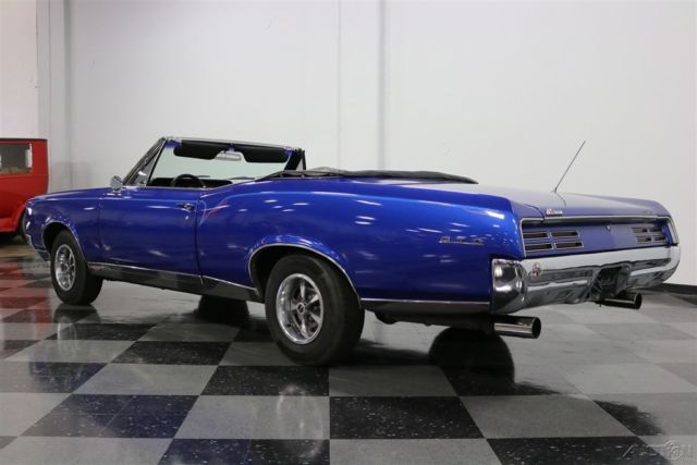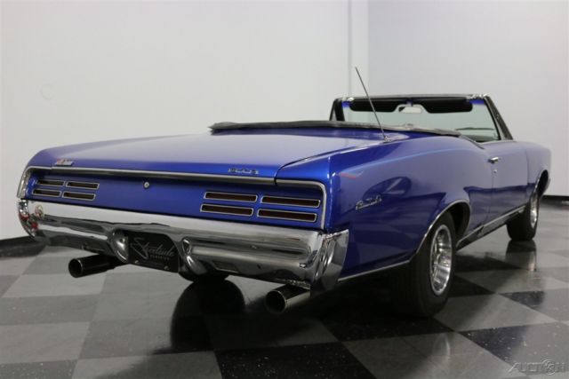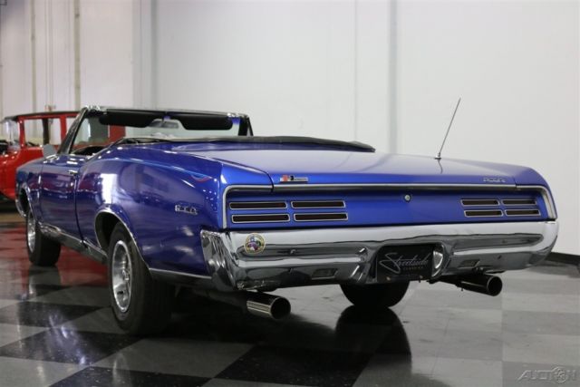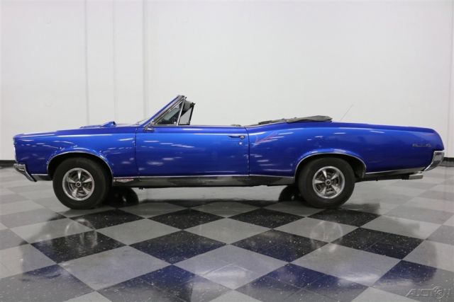 With its undeniably appealing exterior, this 1967 Pontiac GTO Convertible will have no shortage of admirers wherever it may roam and its promise of miles and miles of open air driving excitement is evident right away. This is a nice example of one of GM's best loved vintage muscle cars in good form while also carrying plenty of upgraded power under the hood to go along with all its visual magnetism. Deep blue paint takes the place of its original gold shade, providing such a good fit for this vintage Pontiac that it looks very much like it could have been its original color while offering a nice shine. Pinstriping runs the length of the sides, still featuring sharp edges. The array of trim this Pontiac wears is very much on point - take a look at the rocker panels with their GTO badges located just behind the front tires. In back, the taillights - with their distinctive eight lens configuration - sit between clean badging and the straight, unblemished bumper, with a pair of generously sized exhaust tips extending outward just below to provide a great look. A shift light sits in place of the usual tachometer inside the hood mounted enclosure, which itself is one very cool vintage styling cue conjured up by the folks at GM. The black convertible top powers into place for protection without complaint and sports a plastic window in back that shows none of the common discoloration from UV exposure. Beyond the doors, the black vinyl interior remains in factory configuration and is very clean, especially the seating in both front and back. The dash area sports a number of modifications, including an amply-sized tach that sits to the right of the factory gauges, ready to be connected, and a trio of additional aftermarket gauges just beneath the Pioneer AM/FM/Cassette stereo. All the original dash components also appear to be present and accounted for and the padding running across the top presents well. The center console sports a great looking B&M shifter. This is a substantially-sized muscle car, and you'll find plenty of real estate in front of the rear bench for your backseat passengers. The trunk area in back offers plenty of room for luggage or nearly anything else you might want to take along on your adventures. With the chrome valve covers on its sides blending perfectly with its silver-painted block and a 4-barrel Holley Demon carb sitting just underneath an open element air cleaner on top, the stroked 383 cubic inch V8 strikes a commanding presence while producing plenty of power that becomes evident as soon as you step on the gas pedal. It sits in a eye-catching engine compartment that features inner fenders painted to match the exterior and is lightly travelled and very much at the top of its game, pairing with a 3-speed automatic transmission to provide a very solid, smoothly functioning drivetrain. An electric fan is up front to help keep temperatures in check, while an MSD ignition box sits on one of the inner fenders to maximize sparking. With long tube headers leading back to a 3" dual exhaust, this classic produces a very appealing note as it cruises the asphalt on its 14" PMD wheels wrapped with Douglas All Season radials that were fairly recently added. This Pontiac classic is also armed with power steering and power brakes for easy navigating and low-effort stops. If you're in the market for a great looking vintage muscle car with plenty of power, you really need to check out this 1967 Pontiac GTO Convertible. Call today!