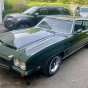 400 cui Pontiac YS engine (casting# 481988) with Comp Cam. 700R4 Automatic OD transmission. 10 bolt rear end. Painted factory color Wilderness Green (code 48) with Green Vinyl top and White GTO striping. Black vinyl bucket seat interior (code 276). Power front disc brakes. Power steering. Factory A/C. Dual exhaust with manifolds and Chrome exhaust tips. Front / Rear sway bar. Factory style hose clamps. Factory gauge cluster. Wood-grain dash / console accents. Front / Rear lap belts. Factory Delco... AM radio (non-op). Dual chrome mirrors. Dual hood scoops. 15? PMD wheels with BFGoodrich Radial T/A’s. Comes with PHS report proving to be a true factory ordered GTO.