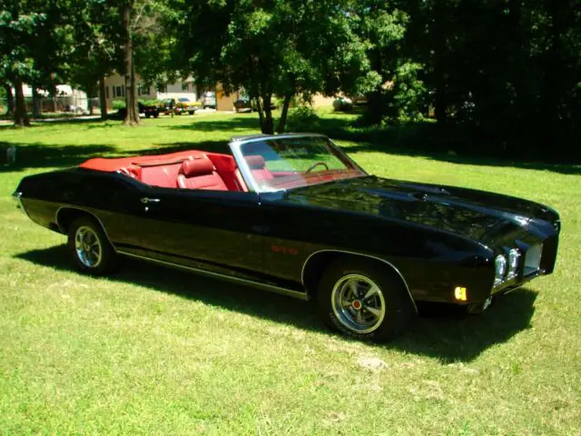 1970 GTO convertible. Unrestored survivor. This car is in amazing condition. A very desirable color combination of black, black top and red interior from the factory. Top is like new and works perfectly, interior is a very nice survivor condition (carpet may have been replaced). Body has had a base/clear repaint at some point. As you can see by the pictures the rubber nose has some cracking on it (not unusual) and a few blemishes here and there that will not show up in pictures. All original body panels, car has spent most of it's existence in California. You can see by the pictures of the floor that the R rear floor pan has been replaced with good workmanship and has fresher black paint on it. Original quarter panels are in fantastic condition. It looks like a small patch on both quarter's was put in the lowest corner behind the rear wheel where a lot of debris collect if the drain hole is plugged (not unusual). All body bushings look really good!
