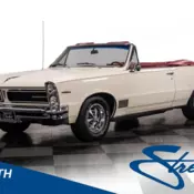 All too often we get caught up in pedigrees and values when we talk about old cars, losing sight of the core of the hobby: having fun in an old car. So I'll tell you up front that this 1967 Pontiac convertible is a GTO tribute, it doesn't have a matching numbers engine, and isn't a trailer queen that needs to be hermetically sealed away to shield it from the earth's atmosphere. However, it is a great V8-powered, 4-speed shifting... convertible with an awesome look and plenty of performance, all for a reasonable price, which really is what the hobby should be about. The slick silver paint was sprayed not too long ago and shines up very well, giving this droptop an elegant and commanding presence. It's a sophisticated silver, not too gray and not too bright, but a classic shade that demands attention wherever it goes. You will find it utterly impossible to keep a low profile in this car and every place you stop, you'll find people are anxious to talk to you. Sound like fun? It is. And when they get up close, they'll find a pretty darned nice car, too, with good gaps, straight bodywork, and a very blurry line between Lemans and GTO. Let them make up their own minds about it, because you'll be having too much fun driving to worry about it. The small hood scoop, mesh grille inserts, the hood tach, and, of course, the badges, all scream GTO and the 1967 models are arguably the best-looking of the '60s. The chrome and brightwork are all new, so it's all bright and shiny and complement the bodywork perfectly. It's got a lot of charisma. There's also new weather stripping on the doors and trunk, and that blue convertible power top is newer as well and in terrific condition. The freshly restored blue bucket seat interior looks pretty much the way the factory intended, with a grown-up look and feel that matches the silver paint wonderfully. Reproduction seat covers capture the tailored look that made Pontiacs of this era so special, and there are fresh door panels and new carpets to make it look like it did in 1967. The wood-rimmed wheel and handsome center console adorned with wood applique give it the sporting European feel that the GTO was trying to emulate, and that tall shifter is linked to a 4-speed manual gearbox, the only transmission you want in your performance Pontiac. The instruments appear to be original and in good condition, but if we have to pick nits, they only stand out because everything else is so beautifully done. A retro-style AM/FM/AUX radio was installed neatly in the dash, and while it's light on options, it certainly isn't lacking for style. The big trunk shows no signs of major surgery and carries a fresh mat to complete the period look. The 326 cubic inch V8 under the hood isn't original to the car, but it sure makes GTO-like sounds and enough performance to move all that Poncho curb weight with relative ease. Dressed in Pontiac Turquoise and wearing chrome dress-up parts, it has a performance look and it does indeed run extremely well. Topped with a Quadrajet 4-barrel carburetor and Holley aluminum intake, the small block snaps to attention with ease, and the MSD distributor makes sure it does so everytime. A big aluminum radiator keeps it cool and the brakes have been upgraded to a dual master cylinder with power assist and front discs for great stopping prowess, while power steering allows for laid-back cruises with one hand on the wheel. The chassis is very clean and features UMI front and rear sway bars and long-tube headers that feed a burbling Flowmaster X-pipe dual exhaust system for that unmistakable muscle car sound. Flashy 5-spoke chrome wheels finish the killer look and carry staggered 215/45/17 front and 225/45/18 rear performance radials. This car deserves consideration simply because it eliminates all the usual headaches for a potential buyer. It's just a clean, fast, fun vintage ragtop, and for a lot of guys, that's exactly the right choice. Call today!