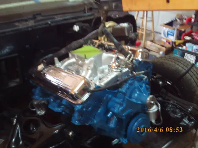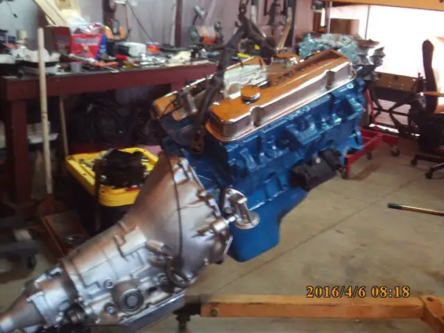 I WAS GOING TO START TO DRIVE IT. CHECKING THE FLUIDS I SAW RADIATOR NEEDED TO BE CLEANED OUT SO A GOOD COOLANT FLOW. REMOVED FAN SPACER SHROUD & RADIATOR.SAW WATER PUMP LEAKING AS WELL AS ENGINE BLOCK FREEZE PLUGS. HAD NEW ALUMINUM INTAKE AND HEADERS FOR THE MOTOR.SO LIFTED MOTOR AND TRANSMISSION OUT TO REGASKET THEM THERE IS ONLY ABOUT 12,000 MILES ON THE REBUILDS. NEW MOTOR GASKET SET NEW FRONT REAR SEALS FILTER PAN GASKET AND CHROME TRANSMISSION PAN .TIMING CHAIN AND GEARS. I WENT TO TOWN