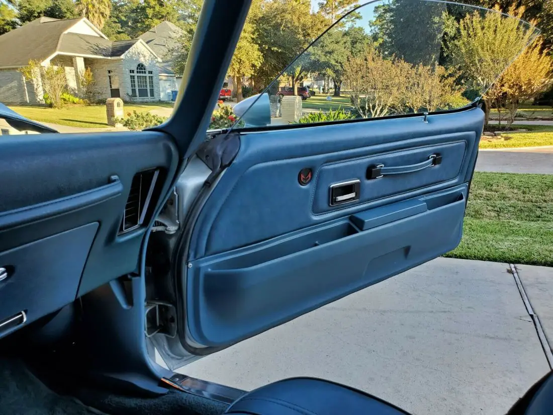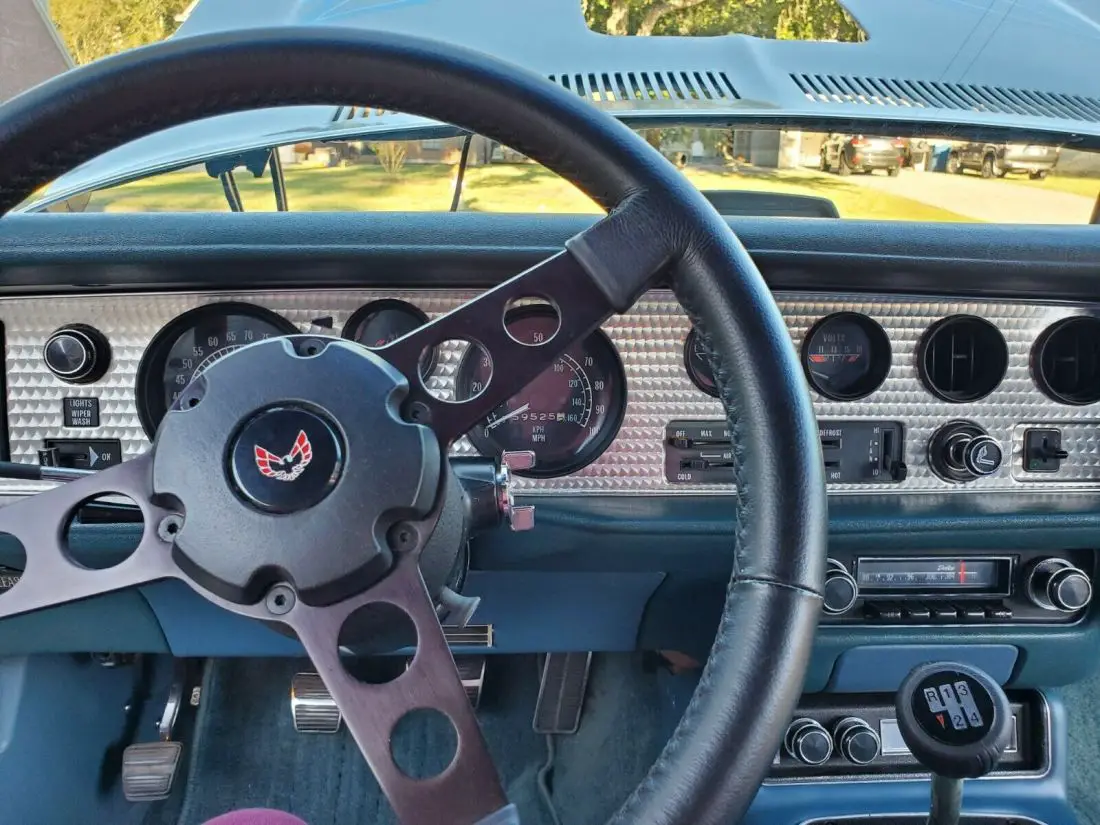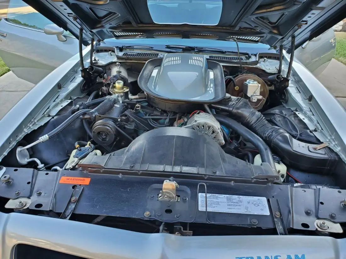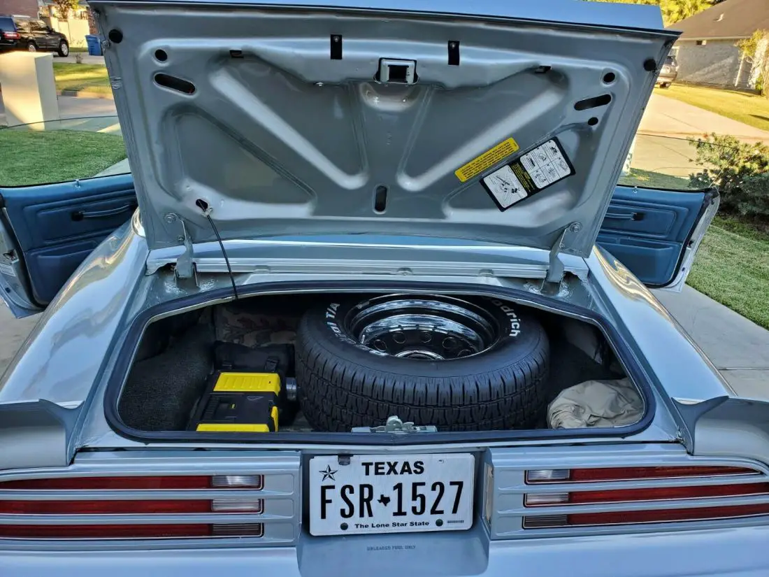 This 1976 Sterling Silver Trans Am is very unusual as it has a blue interior in excellent condition. Most Sterling Silver Trans Am were equipped with a black interior. It has a 4 speed transmission, power windows, radio, 8 track stereo, air conditioning, tilt steering wheel, front and rear seat belts. The tires have approximately 300 miles on them, full size spare tire in trunk. the vehicle is mechanically sound.