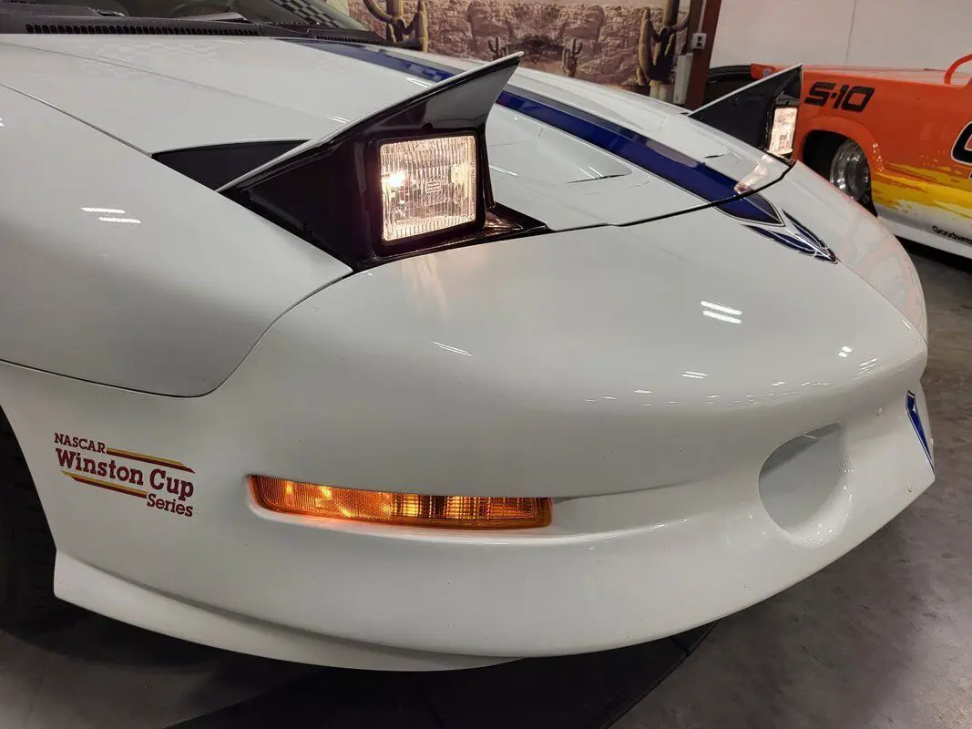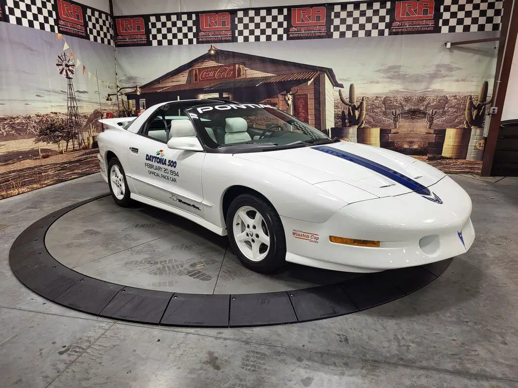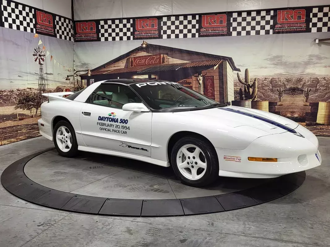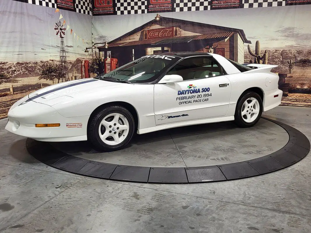 LRA Auto is pleased to present this stunning bright white 1 Of 91 1994 Pontiac Firebird Trans Am 25th Anniversary Daytona 500 Pace Car Edition. 2000 25th anniversary cars were built and this is No. 108, 91 of these were Manual with t-tops. Very few were outfitted with the Daytona 500 emblems. Equipped with the 5.7L LT1 V-8, 6-speed manual transmission and only 14,566 original miles. It features all the unique options to the last generation Firebird. Immaculate white leather interior, removable T-Tops, Five-spoke 16" white-finished wheels feature 25th Anniversary-branded center caps, a rear spoiler, pop-up headlights, fog lamps, quad exhaust outlets, and power-operated side mirrors. This car is all original with an unblemished history. Original window sticker and clean car fax included. Sold new at Community Chevrolet in Oak Forest, Illinois. It is ready for its next owner to drive and show with pride. Contact LRA Auto Sales if you wish to own a piece of history in the automotive world. 866-719-3360