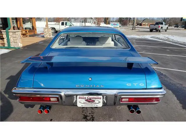 This is a "Super Cool" 455 GTO, nice clean body, done in Medium Blue Metallic, basecoat clearcoat, sanded and wheeled smooth, new tinted windshield,; all other glass is factory original softray tint in very good condition, retains all original window stainless in excellent condition, new weather stripping and window felts, factory dual sport mirrors - driver side is remote, original grills in excellent condition; as well as headlight bezels, endura front bumper in very good condition, original wheel well and rocker moldings in excellent condition, re-chromed original rear bumper, judge wing.