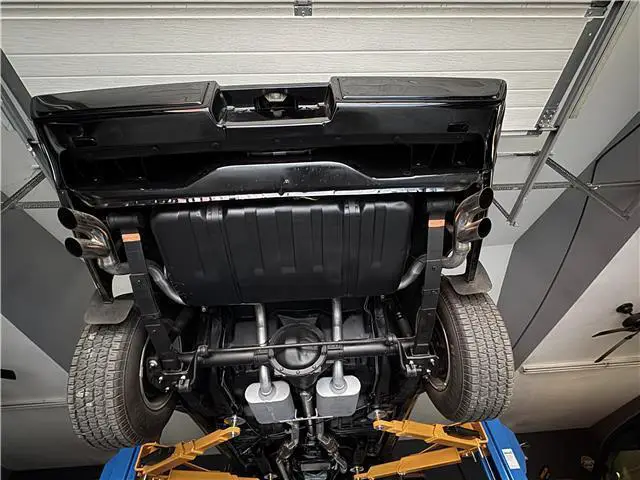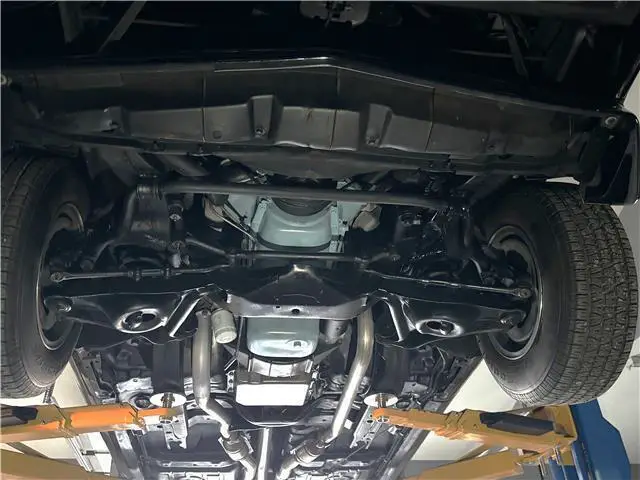 The undercarriage is all clean metal. All the suspension and steering components look good as well as all of the bushings. Looking up at the motor, it is spotless as well as the Turbo 350 automatic transmission. The floors are all clean and original. It has a dual exhaust system with Flowmaster mufflers and correct splitter exhaust tips. It has a 2:41 Safe-T-Trac positraction rear end. The undercarriage is very clean.