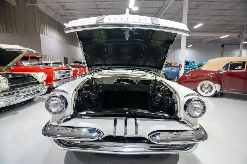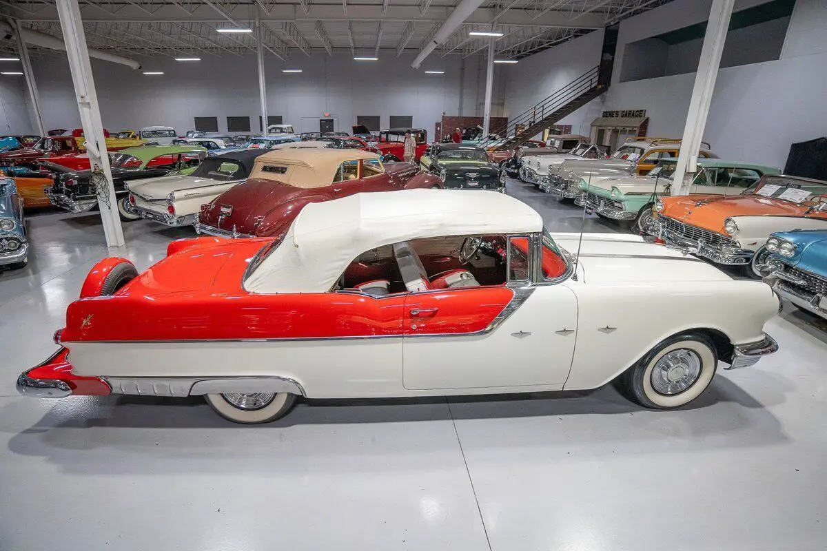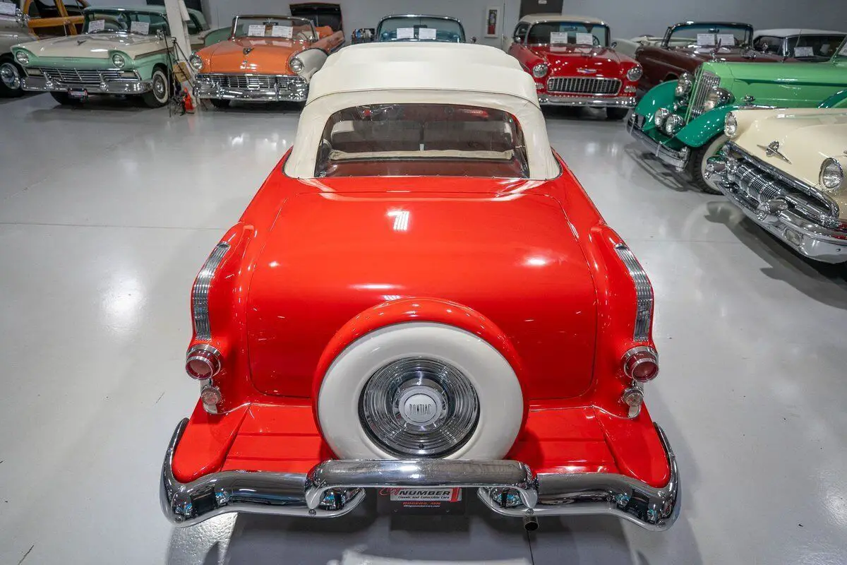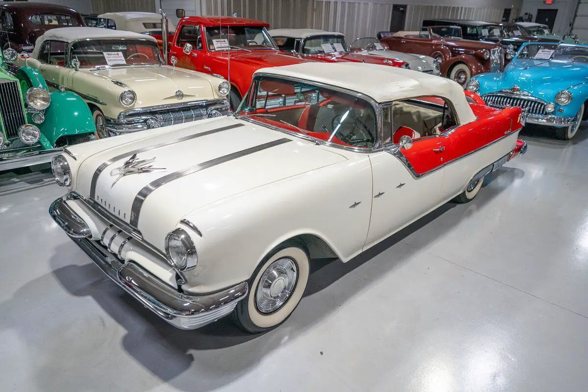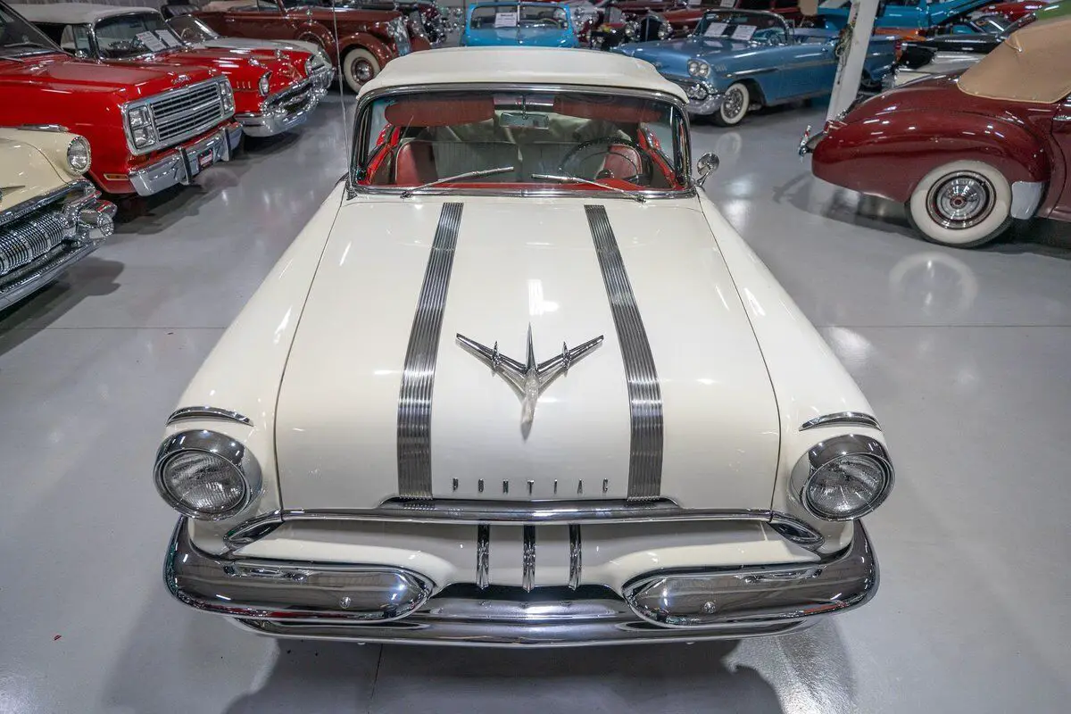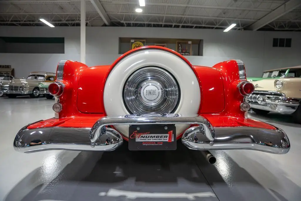 This 1955 Pontiac Star Chief Convertible is a beautiful 50s cruiser that comes to us from the cherished hands of southern based collectors. 1955 was a banner year for the Pontiac Motor Division, which, for the first time in the GM marque's illustrious history, produced over 500,000 vehicles. The nearly 93% uptick in Pontiac's 1955 sales is likely attributable to two primary factors. First of all, Pontiac completely redesigned its entire passenger car line, opting for a more modern looking car while simultaneously building a car that was undeniably a Pontiac. The new-look '55 Pontiacs sported lower, flatter hoods that modernized the front end profile of the car. These new hoods were also adorned with the iconic Pontiac Chief light hood ornament that were prominent Pontiac identifiers. In addition, Pontiac would revive its "Silver Streaks" hood trim that was another iconic Pontiac design element but had been shelved by Pontiac designers for a number of years. Other design improvements up front included a wraparound windshield, redesigned chrome split bumper along with chrome headlight trim and accents that elevated the luxurious look of the new Pontiacs. Down the sides, a trifecta of chrome stars and sweeping chrome beltline molding highlighted the modernized straight body lines that replaced the older-looking swooping lines. In the rear, the 1955 Pontiacs received a major "facelift" with more pronounced tailfins that were topped with "Silver Streaks" and incorporated a new round taillight design. The second major improved for Pontiac in 1955 was the addition of a new overhead valve V-8, that was lauded for its durability and simplistic design and replaced Pontiac's old workhorse straight 8. Sitting atop Pontiac's hierarchy in 1955 was the Star Chief that sported additional trim and more factory standard options. The most expensive Star Chief was the convertible model, of which less than 20,000 were produced, which makes this particular vehicle a rare piece of automotive history. Powering this '55 Star Chief is a numbers matching 287.3 Cubic Inch "Strato-Streak" V8 engine fed by a single 4 barrel carburetor that was said to have pushed out 200 horsepower when new. The 287 Strato-Streak engine is backed by a Hydra-Matic Automatic transmission that makes this classic Pontiac an easy car for anybody to enjoy. Riding on a set of wide whitewall bias-ply tires each paired with a full Pontiac wheelcover, this 1955 Star Chief has a truly classy look cruising down the road. The rear wheels are tucked behind a set of fender skirts that add to this Pontiac Star Chief's gorgeous look. A rear mounted continental kit further adds to the luxurious look of this classic 50s cruiser. The white vinyl power convertible top goes up and down with ease all with the simple pull or push of a button mounted neatly under the dash. Of course, when the convertible top is in its down position, it tucks neatly under a matching vinyl "boot" tonneau cover. A chrome side mirror is mounted on the driver's side, which makes squeezing into a tight space at a local car show or ice cream parlor much easier. The chrome and brightwork around the exterior of this 1955 Pontiac is another highlight of the car and is in wonderful condition. Correctly refinished in Bolero Red over Castle Gray, this Pontiac Star Chief looks just how it came back in 1955. The interior of this 1955 Pontiac Star Chief Convertible is gorgeous! The front and rear bench seats have been correctly reupholstered in two-tone Red and Ivory vinyl. The Bolero Red painted dash, red and ivory upholstered door panels, red carpeting and steering wheel are all in great shape and appear to be in their stock configuration. The instrument cluster is outfitted with a 120 MPH speedometer, temperature gauge, battery gauge, oil pressure gauge and fuel gauge, along with the heater controls. The remainder of the dash is equipped with a locking glovebox, push-button AM radio, and clock. Whether you're buying your first classic convertible or you're adding to an existing collection of Pontiacs, this 1955 Pontiac Star Chief Convertible would make an excellent choice. Give Ellingson's a call today at 763-428-7337!