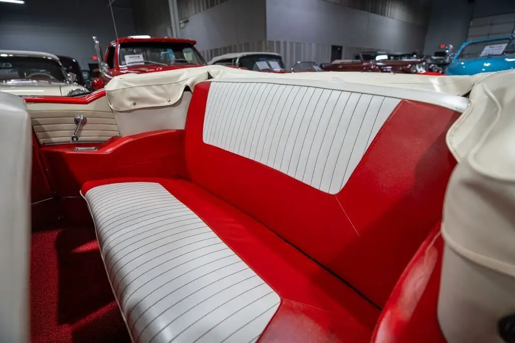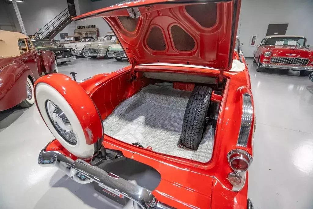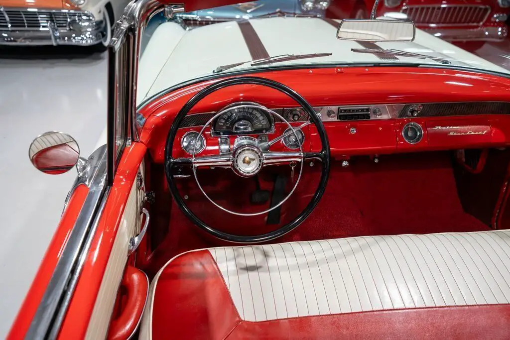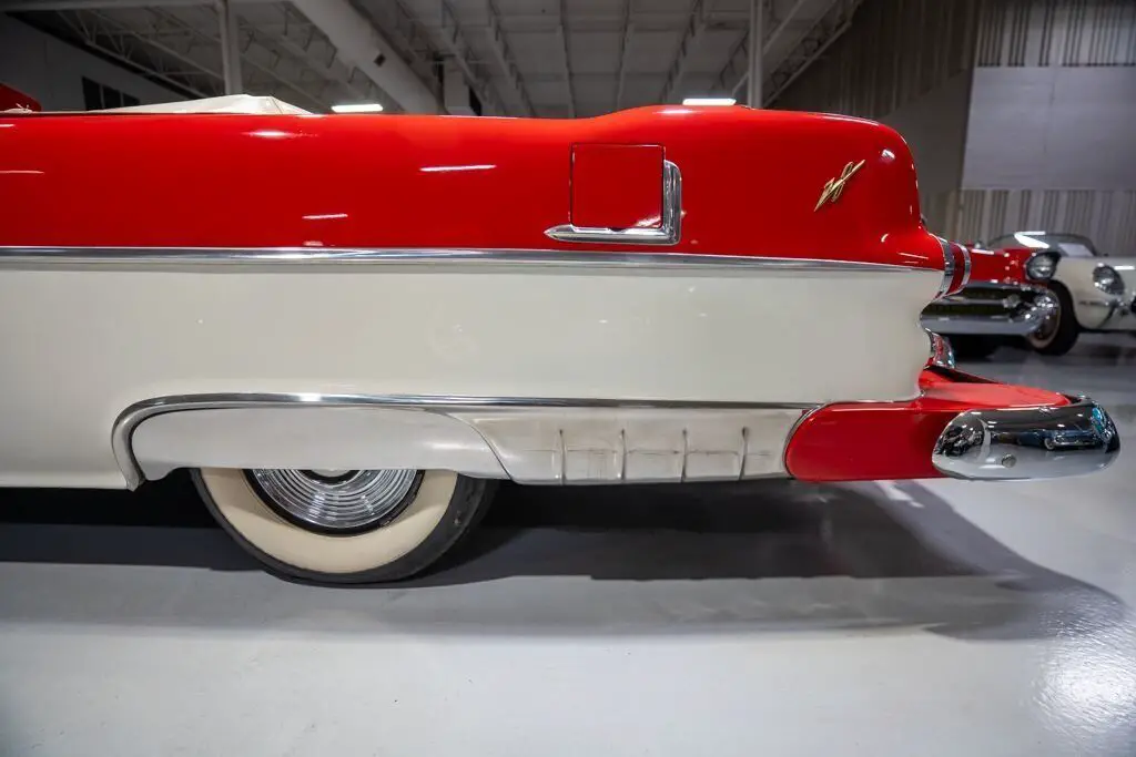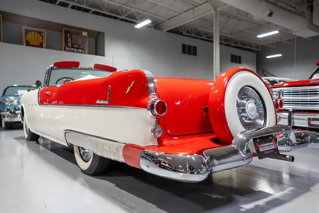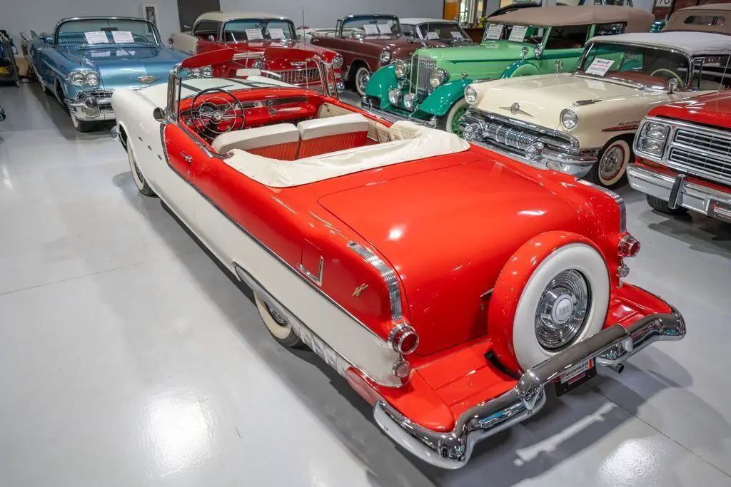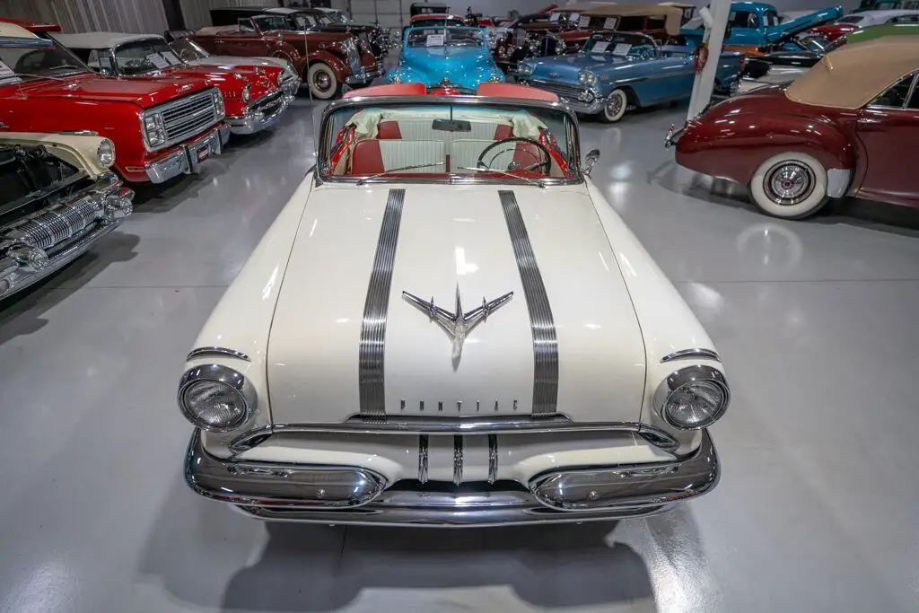 This 1955 Pontiac Star Chief Convertible is a beautiful 50s cruiser that comes to us from the cherished hands of southern based collectors. 1955 was a banner year for the Pontiac Motor Division, which, for the first time in the GM marque's illustrious history, produced over 500,000 vehicles. The nearly 93% uptick in Pontiac's 1955 sales is likely attributable to two primary factors. First of all, Pontiac completely redesigned its entire passenger car line, opting for a more modern looking car while simultaneously building a car that was undeniably a Pontiac. The new-look '55 Pontiacs sported lower, flatter hoods that modernized the front end profile of the car. These new hoods were also adorned with the iconic Pontiac Chief light hood ornament that were prominent Pontiac identifiers. In addition, Pontiac would revive its "Silver Streaks" hood trim that was another iconic Pontiac design element but had been shelved by Pontiac designers for a number of years. Other design improvements up front included a wraparound windshield, redesigned chrome split bumper along with chrome headlight trim and accents that elevated the luxurious look of the new Pontiacs. Down the sides, a trifecta of chrome stars and sweeping chrome beltline molding highlighted the modernized straight body lines that replaced the older-looking swooping lines. In the rear, the 1955 Pontiacs received a major "facelift" with more pronounced tailfins that were topped with "Silver Streaks" and incorporated a new round taillight design. The second major improved for Pontiac in 1955 was the addition of a new overhead valve V-8, that was lauded for its durability and simplistic design and replaced Pontiac's old workhorse straight 8. Sitting atop Pontiac's hierarchy in 1955 was the Star Chief that sported additional trim and more factory standard options. The most expensive Star Chief was the convertible model, of which less than 20,000 were produced, which makes this particular vehicle a rare piece of automotive history. Powering this '55 Star Chief is a numbers matching 287.3 Cubic Inch "Strato-Streak" V8 engine fed by a single 4 barrel carburetor that was said to have pushed out 200 horsepower when new. The 287 Strato-Streak engine is backed by a Hydra-Matic Automatic transmission that makes this classic Pontiac an easy car for anybody to enjoy. Riding on a set of wide whitewall bias-ply tires each paired with a full Pontiac wheelcover, this 1955 Star Chief has a truly classy look cruising down the road. The rear wheels are tucked behind a set of fender skirts that add to this Pontiac Star Chief's gorgeous look. A rear mounted continental kit further adds to the luxurious look of this classic 50s cruiser. The white vinyl power convertible top goes up and down with ease all with the simple pull or push of a button mounted neatly under the dash. Of course, when the convertible top is in its down position, it tucks neatly under a matching vinyl "boot" tonneau cover. A chrome side mirror is mounted on the driver's side, which makes squeezing into a tight space at a local car show or ice cream parlor much easier. The chrome and brightwork around the exterior of this 1955 Pontiac is another highlight of the car and is in wonderful condition. Correctly refinished in Bolero Red over Castle Gray, this Pontiac Star Chief looks just how it came back in 1955. The interior of this 1955 Pontiac Star Chief Convertible is gorgeous! The front and rear bench seats have been correctly reupholstered in two-tone Red and Ivory vinyl. The Bolero Red painted dash, red and ivory upholstered door panels, red carpeting and steering wheel are all in great shape and appear to be in their stock configuration. The instrument cluster is outfitted with a 120 MPH speedometer, temperature gauge, battery gauge, oil pressure gauge and fuel gauge, along with the heater controls. The remainder of the dash is equipped with a locking glovebox, push-button AM radio, and clock. Whether you're buying your first classic convertible or you're adding to an existing collection of Pontiacs, this 1955 Pontiac Star Chief Convertible would make an excellent choice. Give Ellingson's a call today at 763-428-7337!