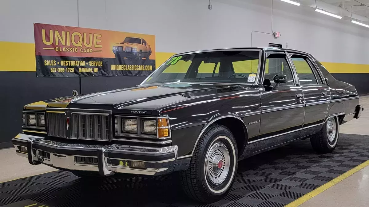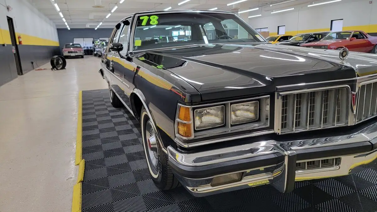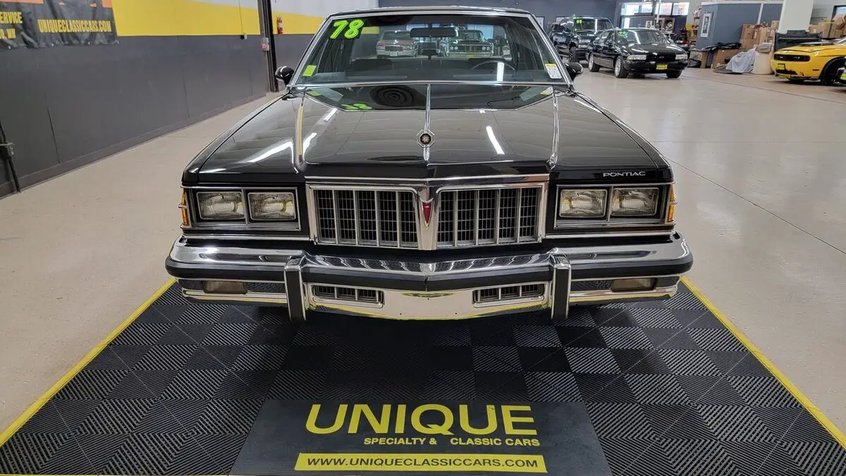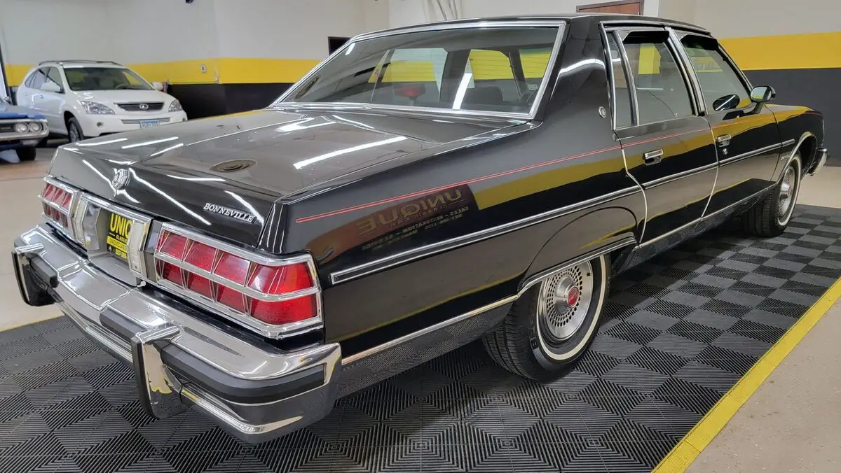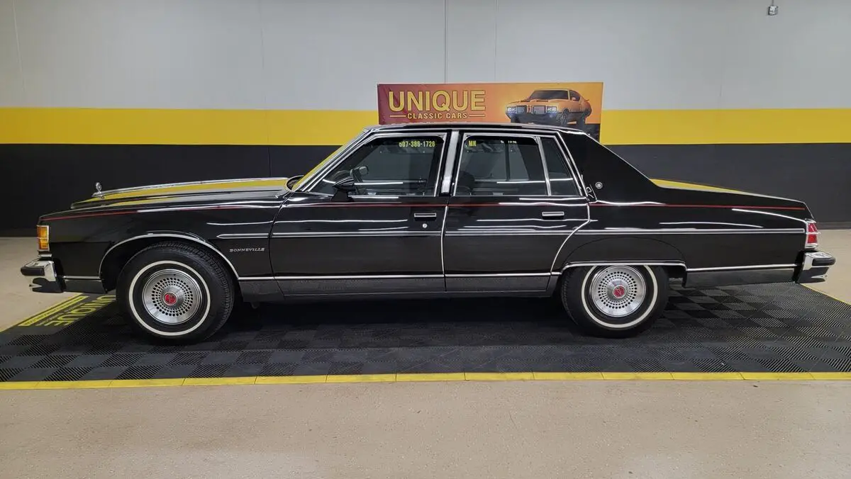 1978 Pontiac Bonneville in Black paint with red pinstriping. This is an original mile car with 26,874 on the odometer! the Pontiac 350 V8 under the hood with a TH350 auto transmission. Equipped with power steering, power brakes, and a/c. A/C BLOWS COLD! Paint has a nice shine overall and does show some imperfections in areas. This one has been undercoated along the line as well as rust inhibitor applied to the doors/lower rockers. Riding on Pontiac wheel covers and white wall radial tires. The tires are getting old, may need to be addressed before longer trips. Black cloth bench seat interior is in great shape. Recent service: coolant done and new exhaust cat back. Aftermarket am/fm/cd stereo has been installed in the dash.