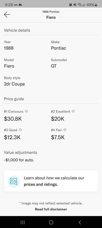Experience the nostalgic charm of the 1988 Pontiac Fiero, a quintessential symbol of the era with its sleek red exterior and manual transmission for a hands-on driving experience. This two-seat wonder is a prime example of Pontiac's craftsmanship, offering a clean vehicle title and a manageable mileage of 52K to ensure a smooth and reliable journey. Under the hood, you'll find a gasoline engine ready to ignite the spirit of the late '80s. The Fiero's interior is a classic homage to its time, perfectly complementing the exterior styling that made a statement on the road. With two doors for easy access, this model is not just a collectors' item but a potential new adventure for the enthusiast at heart.CLASSIC GM FIERO G.T. MID ENGINE 2. 8 cubic inch Collector Item. 1988 Pontiac Fiero GT · Coupe · Driven 51,000 miles. 1988 Fiero GT. Recent light mechanical restoration includes fuel and brake systems, alternator, battery, tires, headlight motors and more. Paint shows decently - 7.5/10. Interior is very nice with no warping or other issues. Mileage is original and accurate at 51xxx. 5 speed manual. Quarter windows are brand new GM parts. Runs and drives very nicely. California car since new, no rot. New AC compressor converted to R134 Ice cold. Just needs left,right outer window sweeps installed. Provided Here. and Fresh paint = 25-30K car. Collector Quality . Since 1988,all paperwork All recites, including Window Sticker from the dealer. Price sheet .is include, and repair Book. On fiero repair exec. Extra Rim for spare, tire and lots of New parts. Hose, gasket sets .belts. G.M. Got the1988 G.T. fiero right.