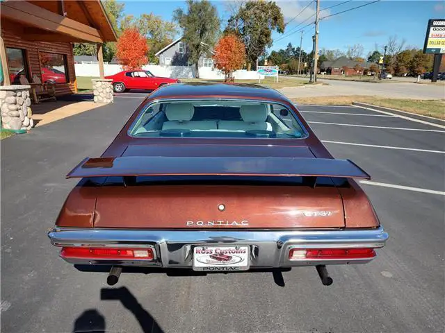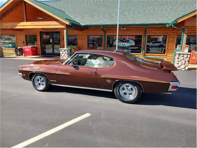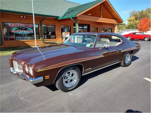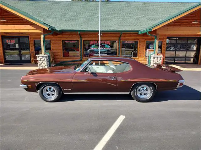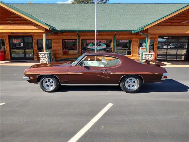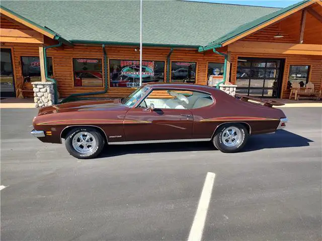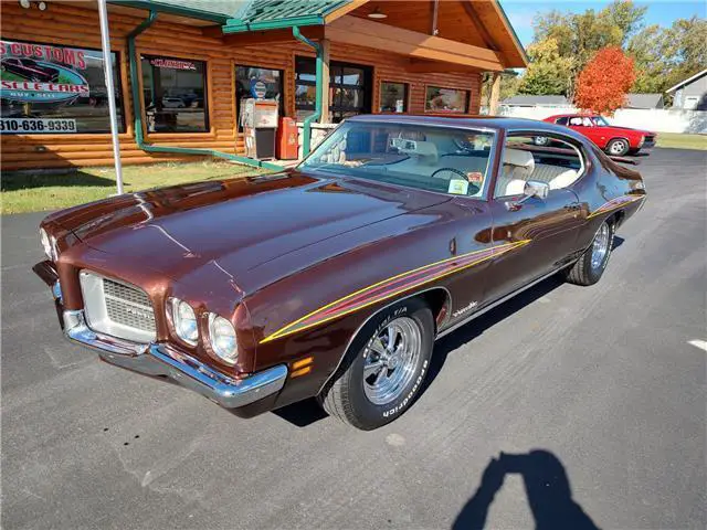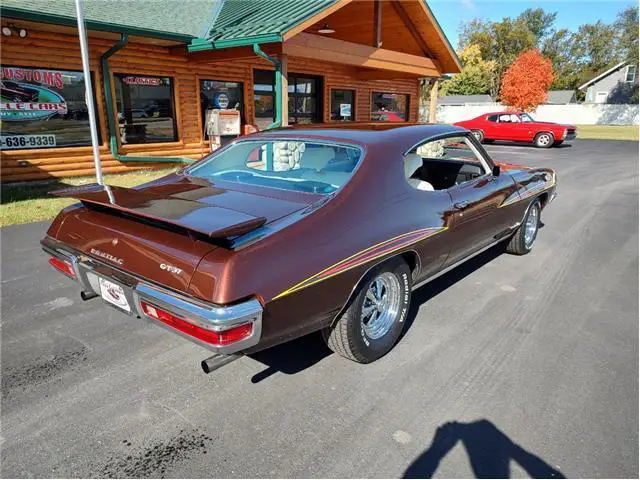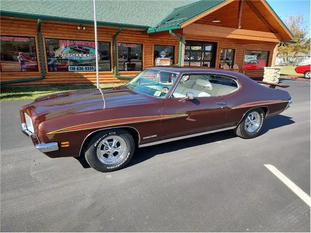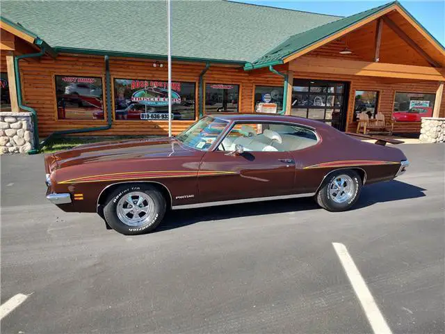 Vehicle Original VIN : 235371Z107This is a rust free 71 LeMans GT 37 with lots of upgrades, clean California built car; which spent most of its life in Arizona, has had 1 repaint its factory Metallic Brown, at time of repaint had new tinted windshield; all other glass is factory original softray tint in excellent condition, all window stainless is original in excellent condition, new weather stripping and window felts, appears door handles have been replaced, factory original driver side remote mirror in good condition, new passenger side mirror, original grills and headlight bezels in excellent condition, retains original front bumper (does show a little age), wheel well and rocker moldings are original in excellent condition, rear bumper is original in excellent condition; as well as taillights, at time of repaint had Judge wing added and Judge strips for that cool look.Factory parchment white interior, original dash in excellent condition - no cracks, dash bezels looks like new, original instrument cluster - showing 69,000 miles, nicely updated with factory in dash tach, original radio; also has AM/FM/CD stereo with remote nicely mounted in glovebox, trio of gauges nicely mounted under dash, new headliner and visors, new package shelf, front and rear door panels are original in excellent condition, rear seat is also original in excellent condition, front seat has had lower section replaced, factory front and rear seat belts with shoulder straps, carpet, deluxe floor mats, original sill plates.Under the hood we have a professionally built 455, 60 over, forged pistons, Butler Performance upper end, hydraulic roller cam, Edelbrock aluminum cylinder heads, Edelbrock performance RPM aluminum intake, Holley dual feed carb with electric choke, aluminum Pontiac performance valve covers, updated with high out put electronic ignition, K&N breather, Edelbrock aluminum high flow water pump, heavy duty radiator with correct cooling fan and shroud, AC has been converted to 134R - which blows cold, power steering, power disc brakes, factory RamAir cast iron headers into 2 1/2 inch stainless exhaust out the back with Dynomax mufflers, front suspension has been updated with Hotchkis 1 inch sway bar, this strong running 455 is backed up with a professionally build 200R4 overdrive automatic trans, new Hotchkis springs all around; also Hotchkis rear sway bar and boxed control arms, factory 10 bolt Auburn posi rear with 373 gear.Rides on a set of Vintage Cragar SS wheels and BF Goodrich TA radials all around.Factory jack and space, car cover, folder and box of receipts.This cool LeMans is ready to cruise and enjoy.