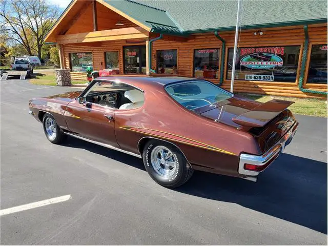 This is a rust free 71 LeMans GT 37 with lots of upgrades, clean California built car; which spent most of its life in Arizona, has had 1 repaint its factory Metallic Brown, at time of repaint had new tinted windshield; all other glass is factory original softray tint in excellent condition, all window stainless is original in excellent condition, new weather stripping and window felts, appears door handles have been replaced, factory original driver side remote mirror in good condition, new passenger side mirror, original grills and headlight bezels in excellent condition, retains original front bumper (does show a little age), wheel well and rocker moldings are original in excellent condition, rear bumper is original in excellent condition; as well as taillights, at time of repaint had Judge wing added and Judge strips for that cool look.