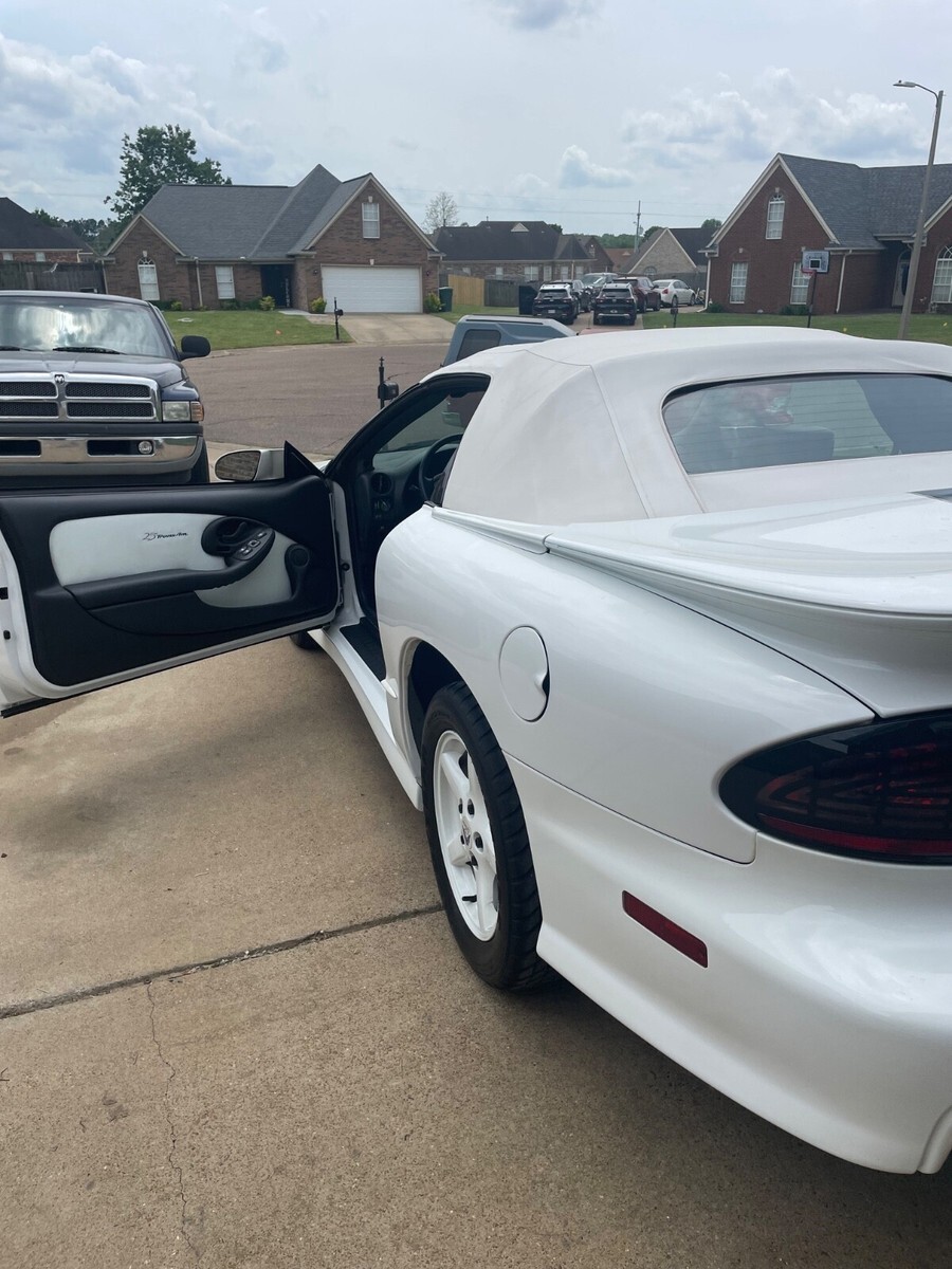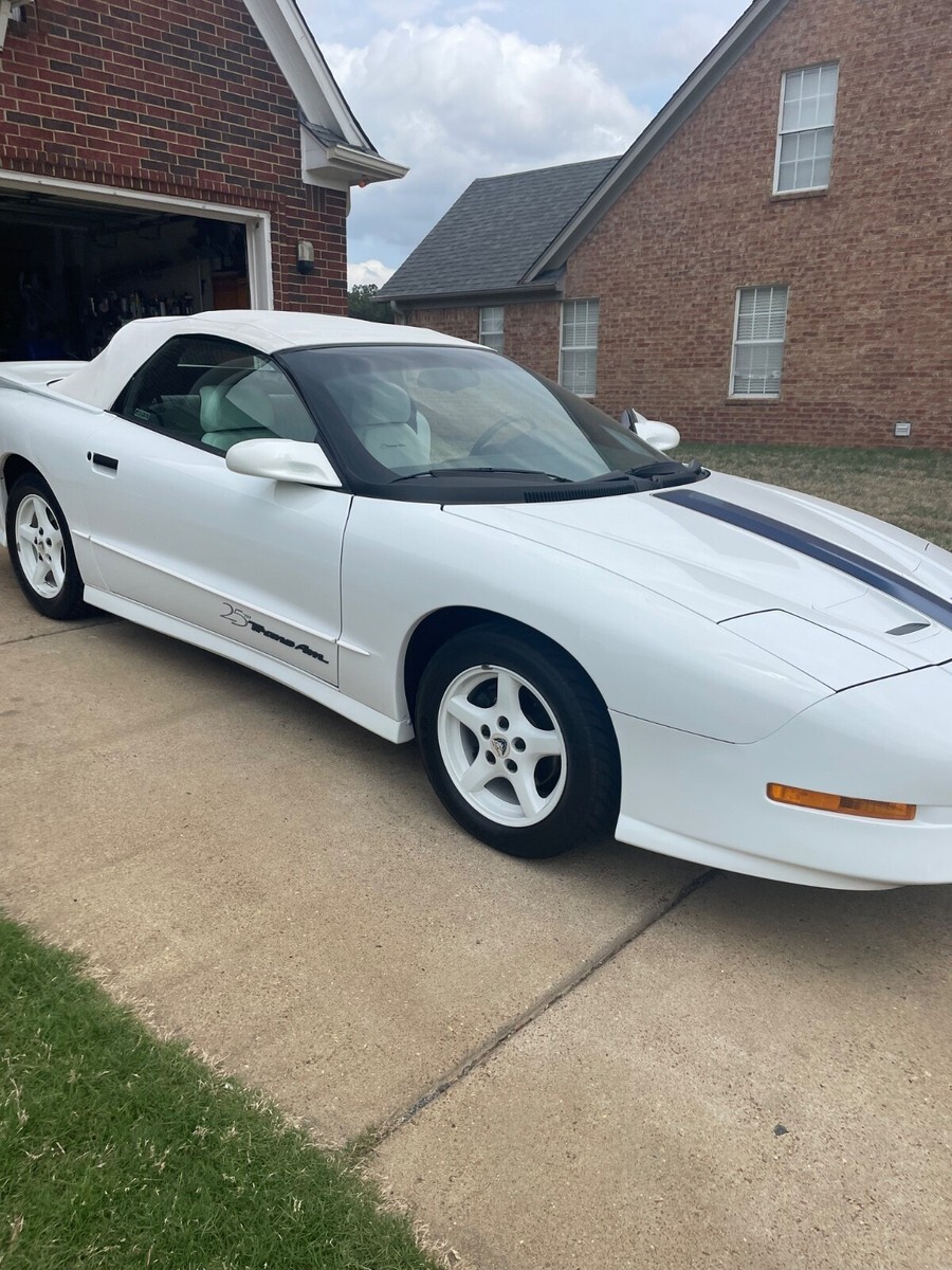 The 1994 Pontiac Firebird Trans Am 25th Anniversary is a stylish convertible with a white interior and exterior. This classic car has a 5.7 liter LT1 V8 engine, automatic transmission, and 2 doors for easy access. It features power windows, cruise control, leather seats, air conditioning, and alloy wheels, making it a desirable collector's item for enthusiasts of Pontiac vehicles. With only 2 previous owners and 19,450 miles on the odometer, this Firebird is sure to provide a thrilling driving experience for anyone looking to own a piece of automotive history.