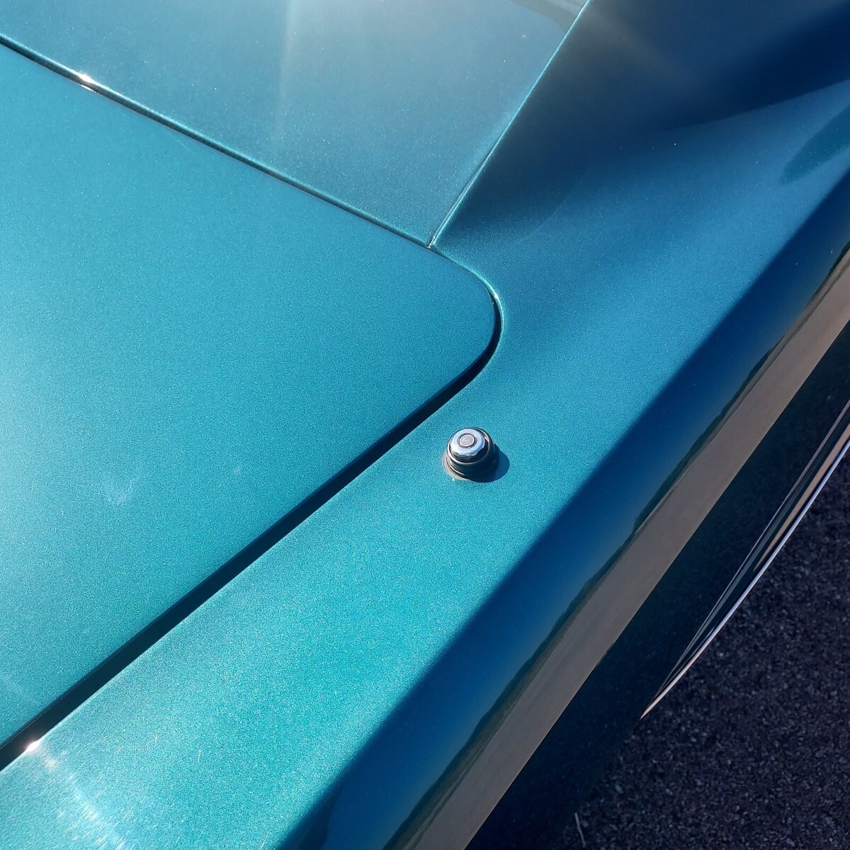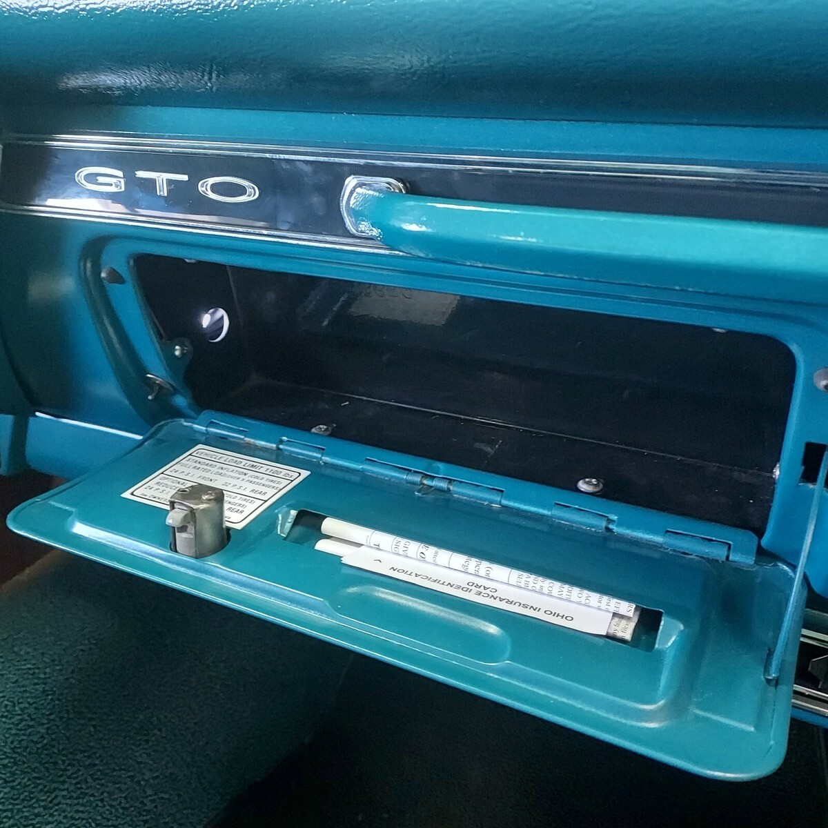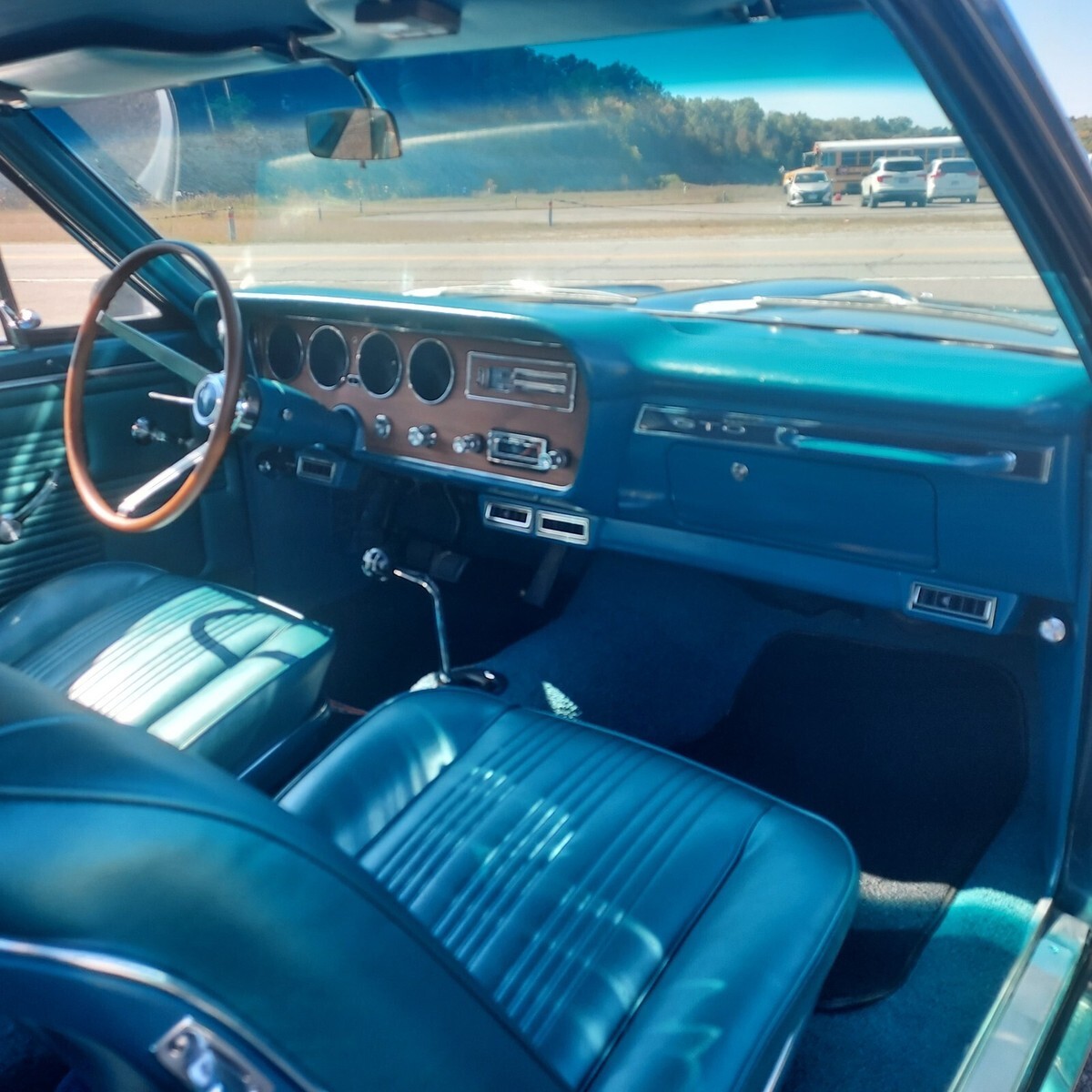 The interior was redone with Legendary upholstery in factory turquoise. I installed a factory rallye gauge package with LED lighting as well as the rallye steering wheel. The Vintage air was integrated into the dash to look original. The car has an upgraded AM/FM radio with power rear antenna but the original radio (dead) comes with the car. No cutting has been done there. Front and rear glass is new, as are the 4 position Julianos seat belts.