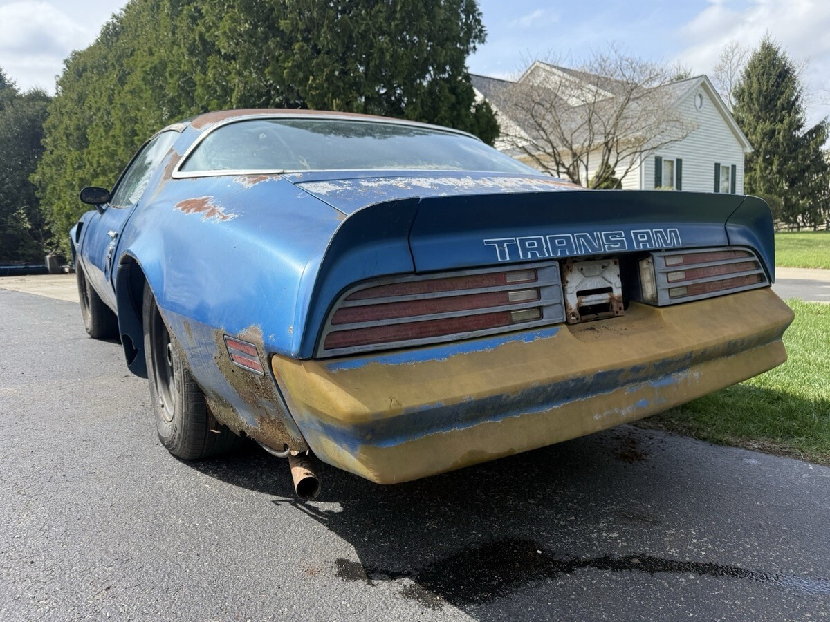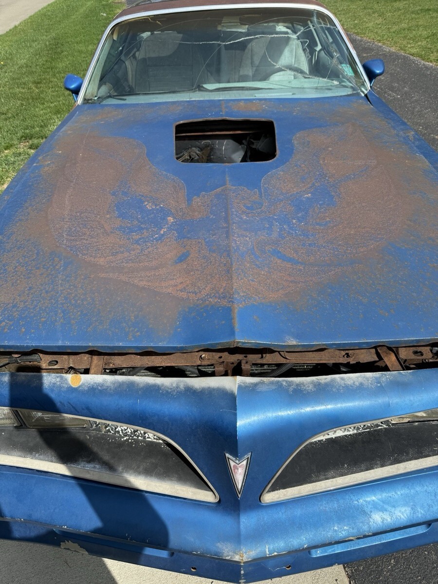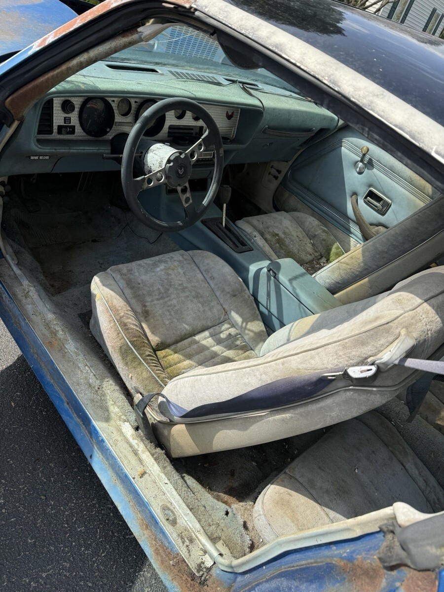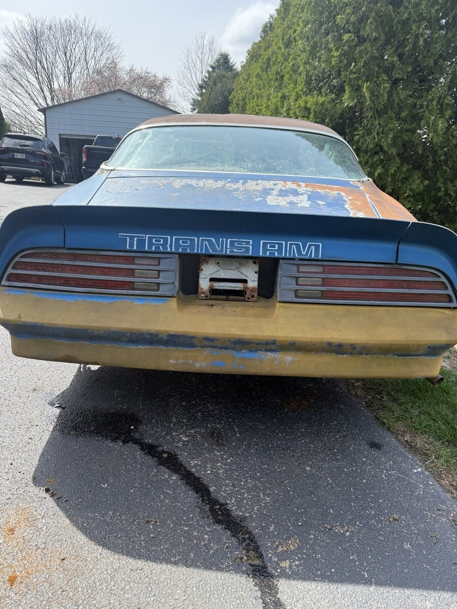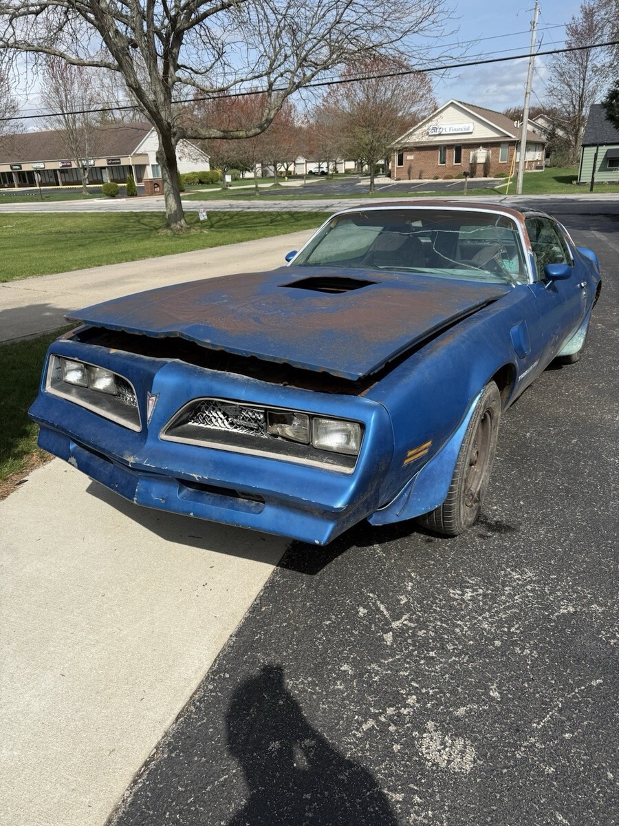 1978 Pontiac Trans Am 400 6.6 Auto Martinique Blue T-tops. Rare one year only color. Fisher t-tops. 400 Pontiac 6.6 L automatic. One owner car. Still have the original title. Car has been sitting for decades. Currently has GTO Ram AIR number 13 heads and a holly intake. Original heads and intake are in the trunk. Original spare tire and various brand new gaskets and parts are in the trunk as well. Numbers matching engine. Car is rough. Needs a complete restoration. Floor is rotted, trunk is rotted. Comes with keys as well. Located in Temperance, MI 48182 near Toledo, Ohio. Rolls and steers easy to put onto a trailer. Pontiac Rally wheel and Tires are in great shape. Any questions please ask. Thank you.