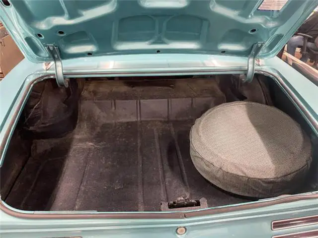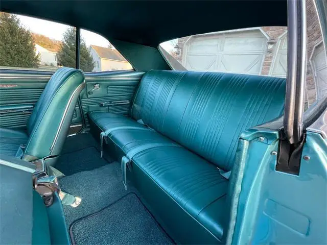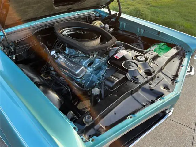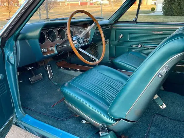 This 1967 Pontiac GTO is wearing its factory color, Gulf Turquoise, code K, with Dark Turquoise interior. The paint has a nice glossy clear coat finish. It has a nice fit and finish and is straight down both sides. All of the chrome and trim is new or really nice. In the front; the headlight bezels, front bumper and grill are nice, shiny and in great shape. All brightwork has been replaced or polished. Glass is in good condition, all windows roll up and down with ease. In the back; the trim, rear bumper, moldings and taillights look new. It sits on a set of American Racing Wheels with a set of BFG T/A radial raised white letter tires.