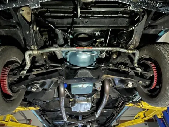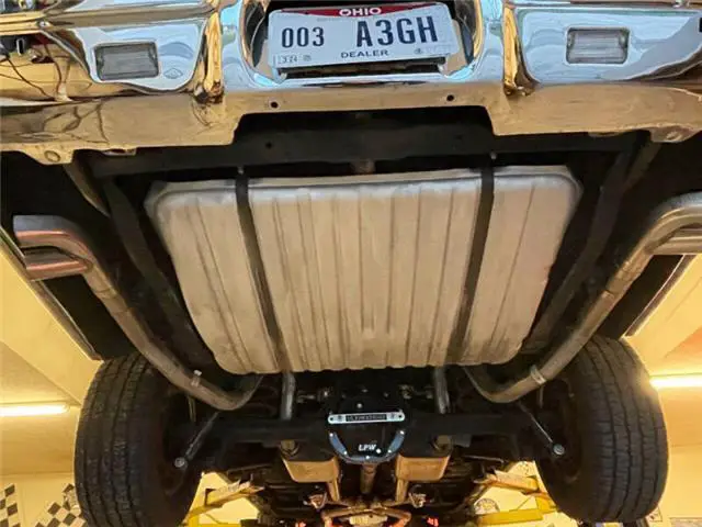 The undercarriage has very solid original floors that are painted in a satin black finish. The front suspension and steering components look to be in good shape. The bottom of the motor and transmission are clean. It has a correct 400 turbo transmission, 3:36 Safe-T-Track rear end, newer fuel tank, sending unit and fuel tank straps. All E-brake cables are hooked up and working. There is a nice Pypes stainless steel exhaust with electric cutouts.