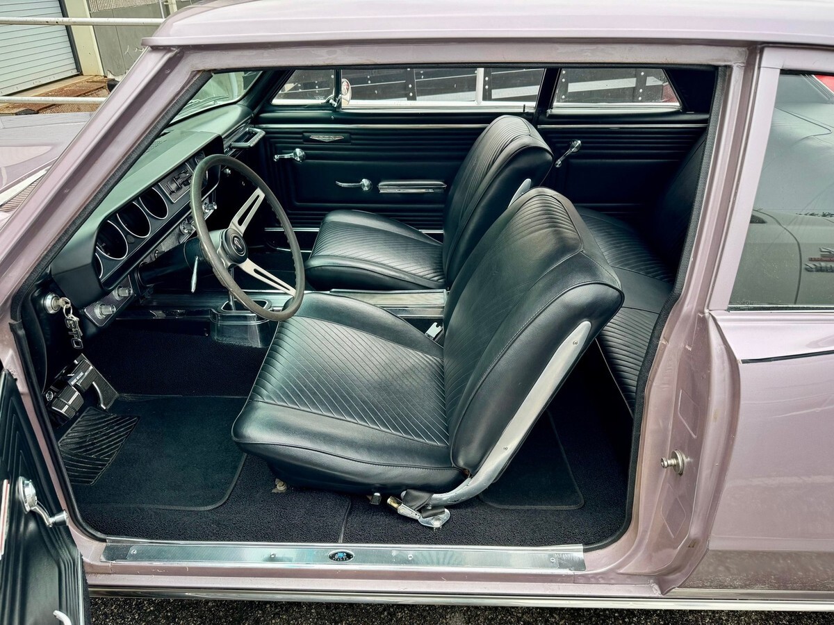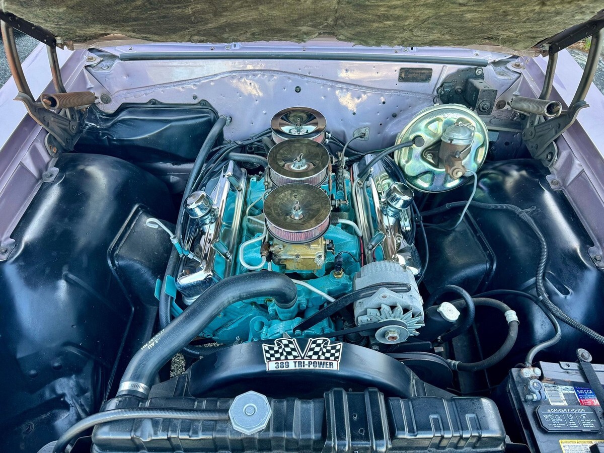 Our Lemans was subject to a frame off restoration a fewyears back and still shows well. The body is nice and straight and features beautiful Iris Mist paint that truly sets it apart from most muscle cars. All appropriate GTO badging is in place and the chrome and brightwork show well. A set of American Racing wheels wrapped in radial tires finish off the look.