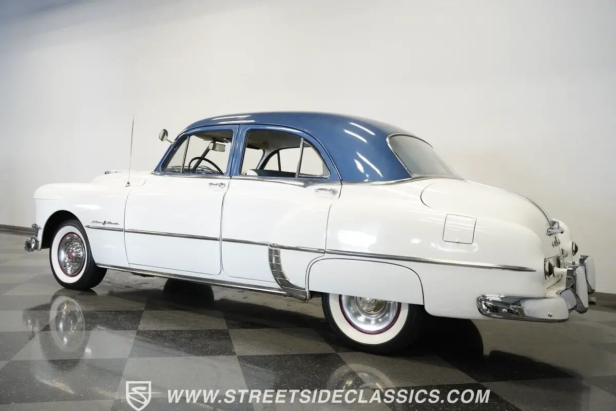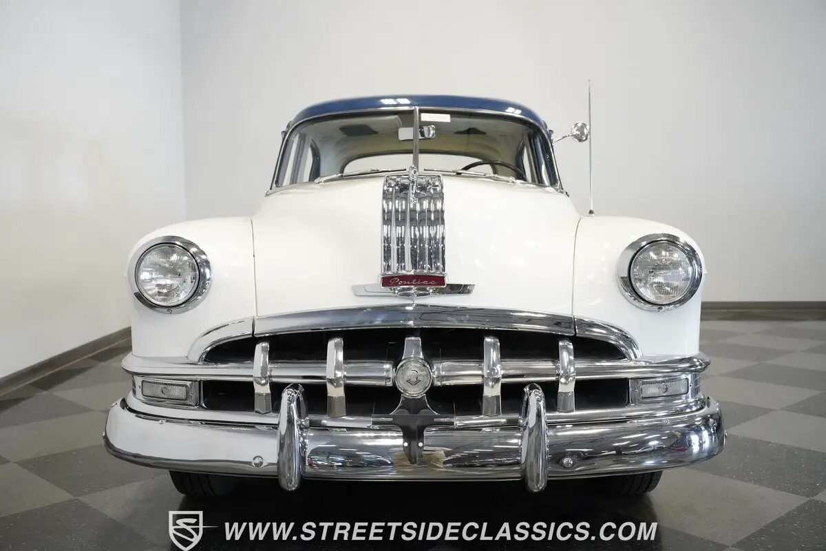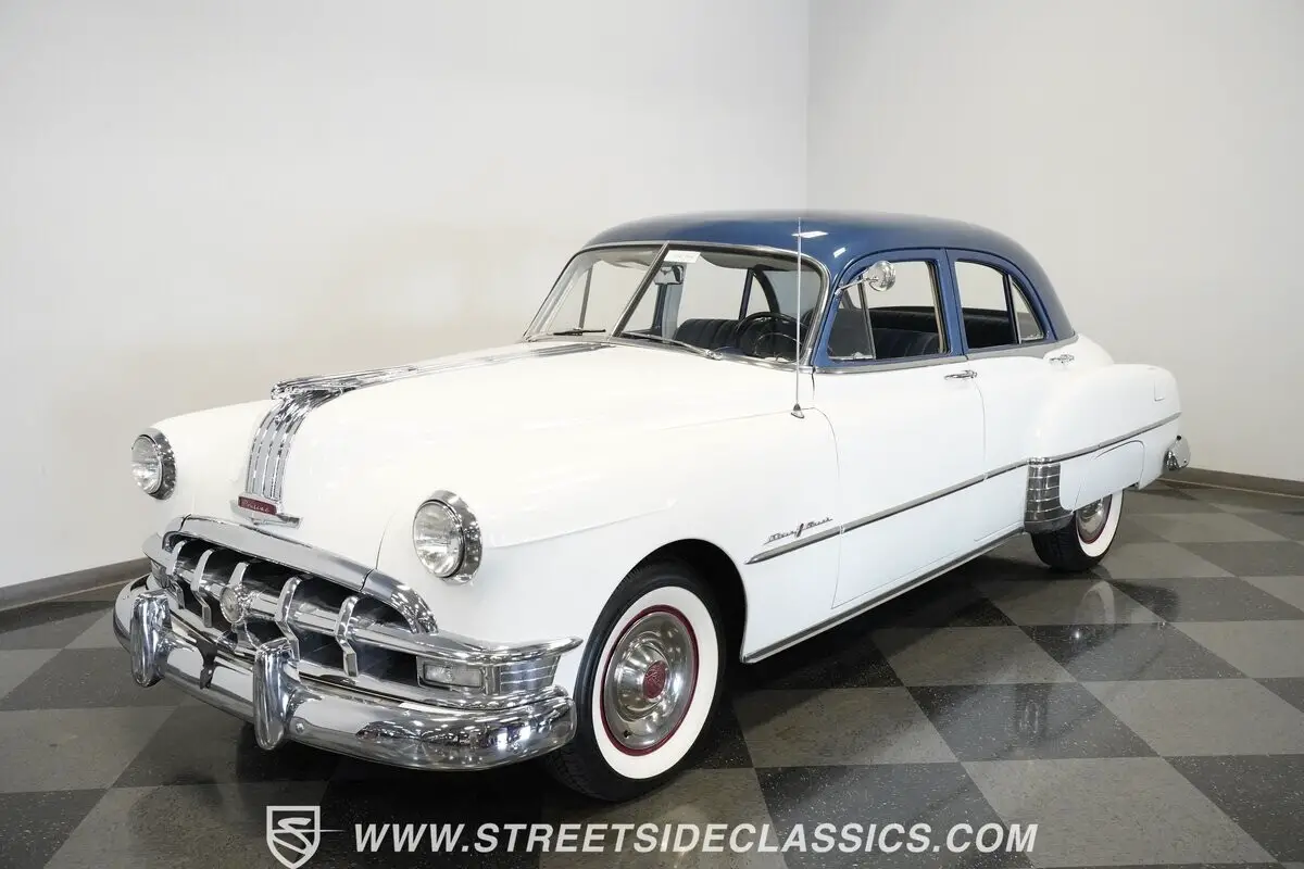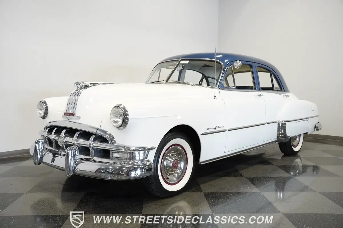 Vehicle Original VIN : P8TH543054347-PHX 1950 PONTIAC CHIEFTAIN Two-tone white and blue paint flows across this 1950 Pontiac Chieftain's body panels, creating distinct color zones that define the sedan's profile. Chrome trim pieces frame the split front windshield and accent the body lines, while additional chrome details highlight the grille, bumpers, and window surrounds. Silver Streak styling cues complement the extensive brightwork throughout the exterior design. Red-painted 15" steel wheels wear full wheel covers and mount Coker Classic 215/75R15 whitewall tires at all four positions. Blue and white vinyl bench seating creates a comfortable interior environment with the column shifter positioned within easy reach. The AM radio provides audio entertainment during drives, while front seatbelts add important safety equipment. Blue interior color coordinates with the exterior accent trim, and white detailing balances the overall color scheme throughout the cabin space. Pontiac's 268 cubic inch straight-eight engine generates power through eight cylinders, working with a 4-speed Hydromatic transmission for smooth gear changes. Carter 2-barrel carburetor feeds the engine, while independent front suspension uses control arms and coil springs. Solid rear axle with leaf springs handles the back end, and drum brakes at all four wheels provide stopping power. Single exhaust system routes through an aftermarket muffler, plus an electric radiator fan assists cooling. HIGHLIGHTS: • 268 Cubic Inch Straight-8 Engine • 4-Speed Hydromatic Transmission • Carter 2-Barrel Carburetor • Independent Front Suspension with Control Arms and Coil Springs • Solid Rear Axle with Leaf Springs • 4-Wheel Drum Brakes • Single Exhaust System with Aftermarket Muffler • Electric Radiator Fan • Two-Tone White and Blue Paint • Split Front Windshield • Extensive Chrome Trim and Brightwork • Chrome Grille and Bumpers • Silver Streak Styling Accents • 15" Steel Wheels Painted Red with Wheel Covers • 215/75R15 Coker Classic Whitewall Tires • Blue and White Interior with Bench Seating • Column Shifter • AM Radio • Front Seatbelts • Owner's Manual Early production 1950 Pontiac Chieftain with reliable straight-eight power, Hydromatic transmission, and classic two-tone styling that made these cars popular family transportation. The combination of period-correct features and dependable mechanical components makes this Pontiac ready for weekend drives. Call today!