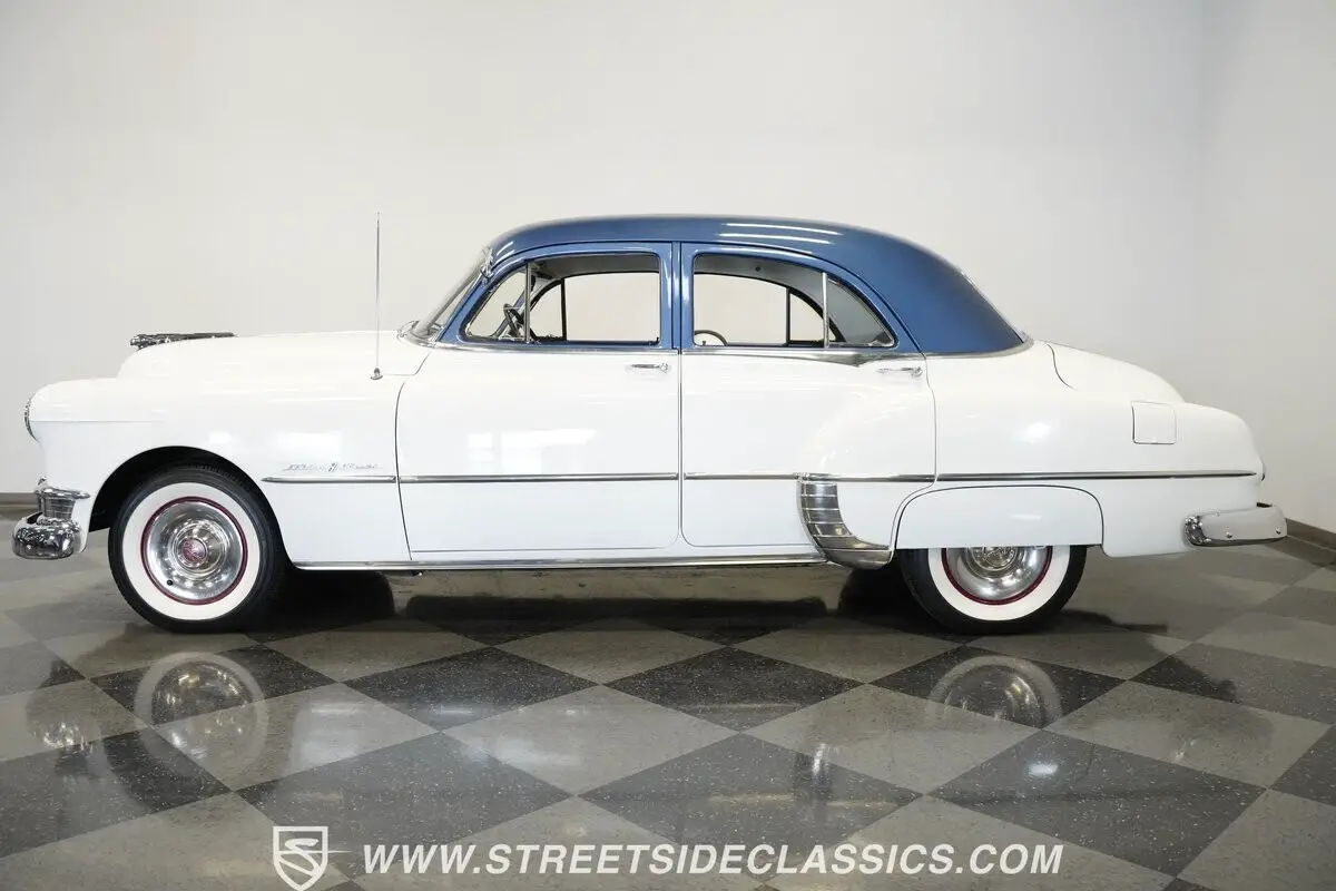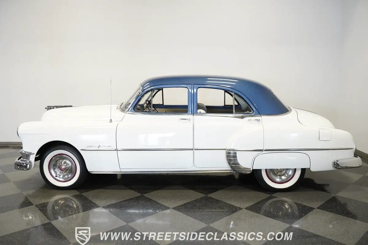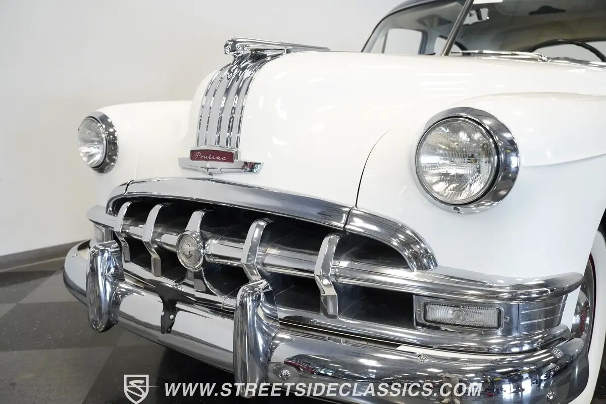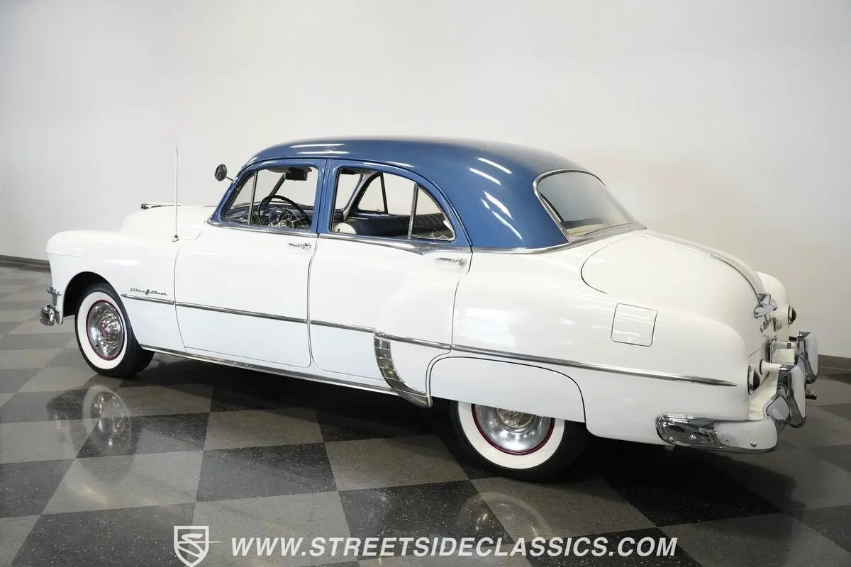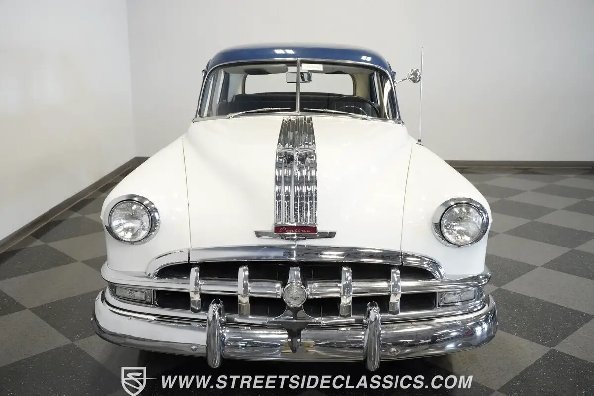 Vehicle Original VIN : P8TH543054347-PHX 1950 PONTIAC CHIEFTAIN Two-tone white and blue paint flows across this 1950 Pontiac Chieftain's body panels, creating distinct color zones that define the sedan's profile. Chrome trim pieces frame the split front windshield and accent the body lines, while additional chrome details highlight the grille, bumpers, and window surrounds. Silver Streak styling cues complement the extensive brightwork throughout the exterior design. Red-painted 15" steel wheels wear full wheel covers and mount Coker Classic 215/75R15 whitewall tires at all four positions. Blue and white vinyl bench seating creates a comfortable interior environment with the column shifter positioned within easy reach. The AM radio provides audio entertainment during drives, while front seatbelts add important safety equipment. Blue interior color coordinates with the exterior accent trim, and white detailing balances the overall color scheme throughout the cabin space. Pontiac's 268 cubic inch straight-eight engine generates power through eight cylinders, working with a 4-speed Hydromatic transmission for smooth gear changes. Carter 2-barrel carburetor feeds the engine, while independent front suspension uses control arms and coil springs. Solid rear axle with leaf springs handles the back end, and drum brakes at all four wheels provide stopping power. Single exhaust system routes through an aftermarket muffler, plus an electric radiator fan assists cooling. HIGHLIGHTS: • 268 Cubic Inch Straight-8 Engine • 4-Speed Hydromatic Transmission • Carter 2-Barrel Carburetor • Independent Front Suspension with Control Arms and Coil Springs • Solid Rear Axle with Leaf Springs • 4-Wheel Drum Brakes • Single Exhaust System with Aftermarket Muffler • Electric Radiator Fan • Two-Tone White and Blue Paint • Split Front Windshield • Extensive Chrome Trim and Brightwork • Chrome Grille and Bumpers • Silver Streak Styling Accents • 15" Steel Wheels Painted Red with Wheel Covers • 215/75R15 Coker Classic Whitewall Tires • Blue and White Interior with Bench Seating • Column Shifter • AM Radio • Front Seatbelts • Owner's Manual Early production 1950 Pontiac Chieftain with reliable straight-eight power, Hydromatic transmission, and classic two-tone styling that made these cars popular family transportation. The combination of period-correct features and dependable mechanical components makes this Pontiac ready for weekend drives. Call today!
