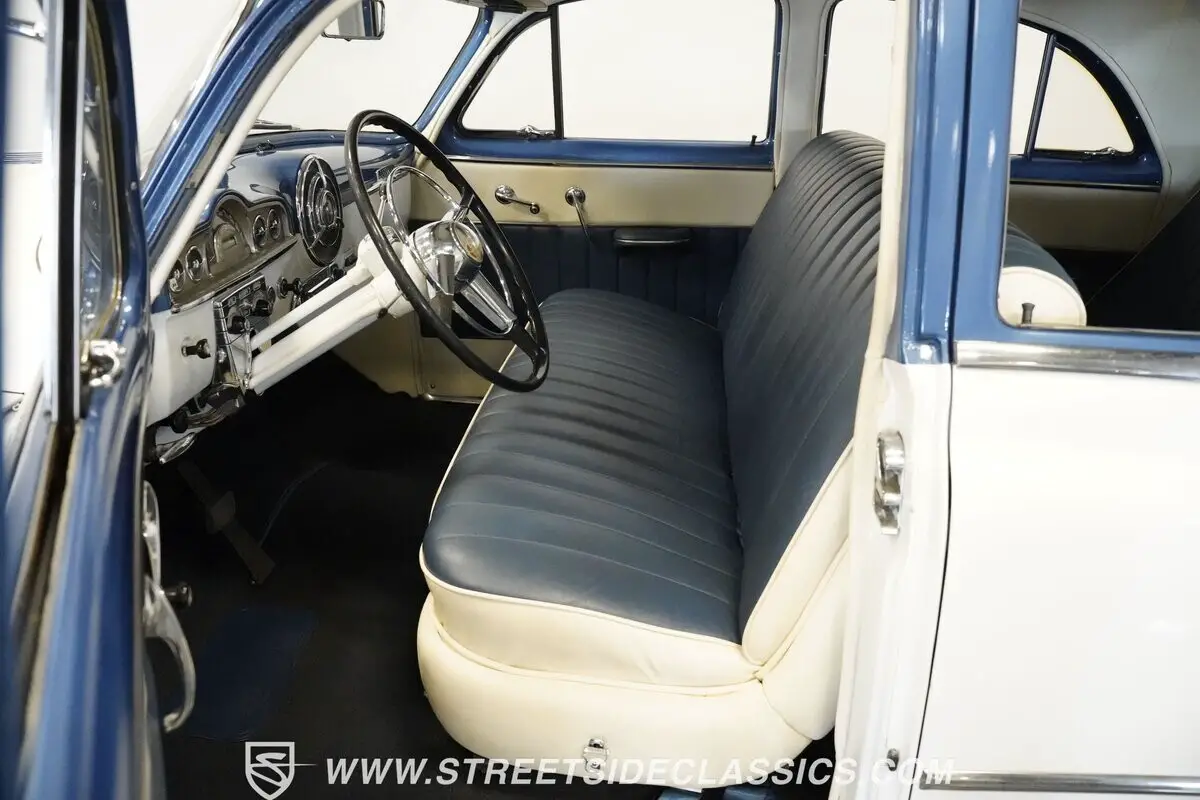 Blue and white vinyl bench seating creates a comfortable interior environment with the column shifter positioned within easy reach. The AM radio provides audio entertainment during drives, while front seatbelts add important safety equipment. Blue interior color coordinates with the exterior accent trim, and white detailing balances the overall color scheme throughout the cabin space.
