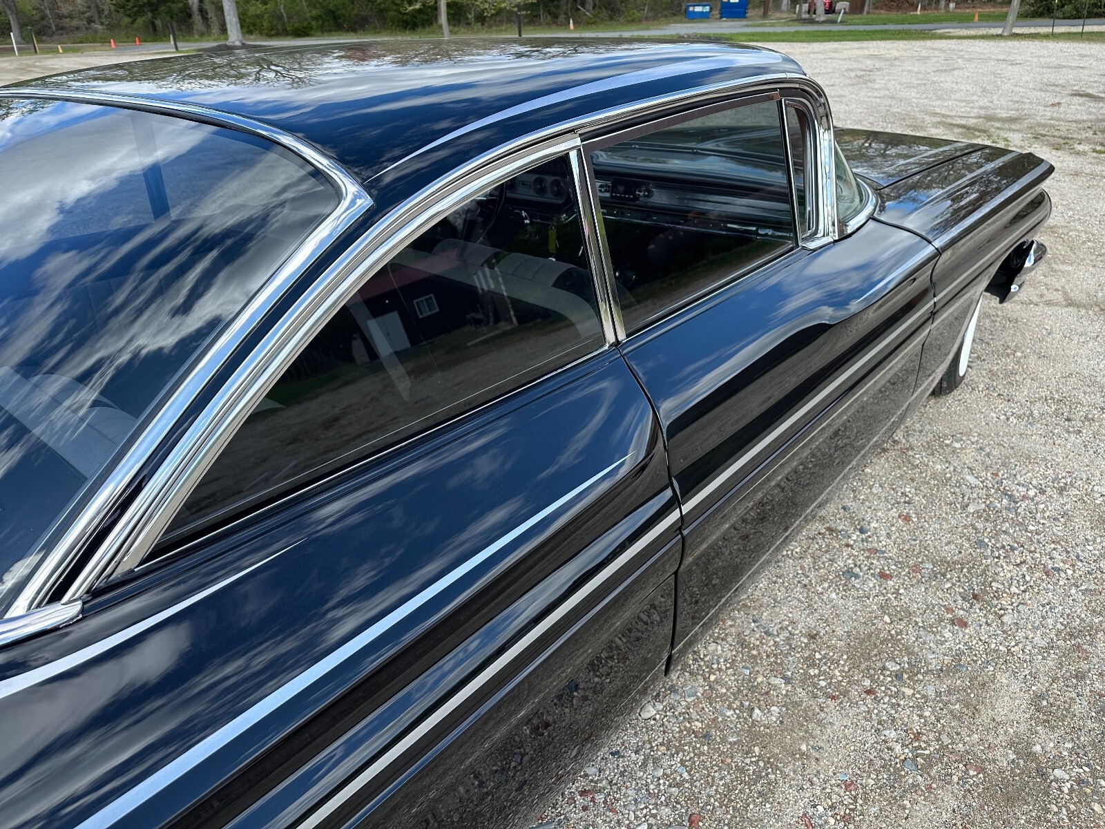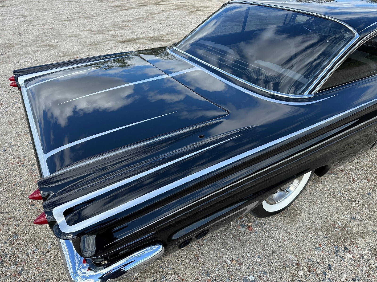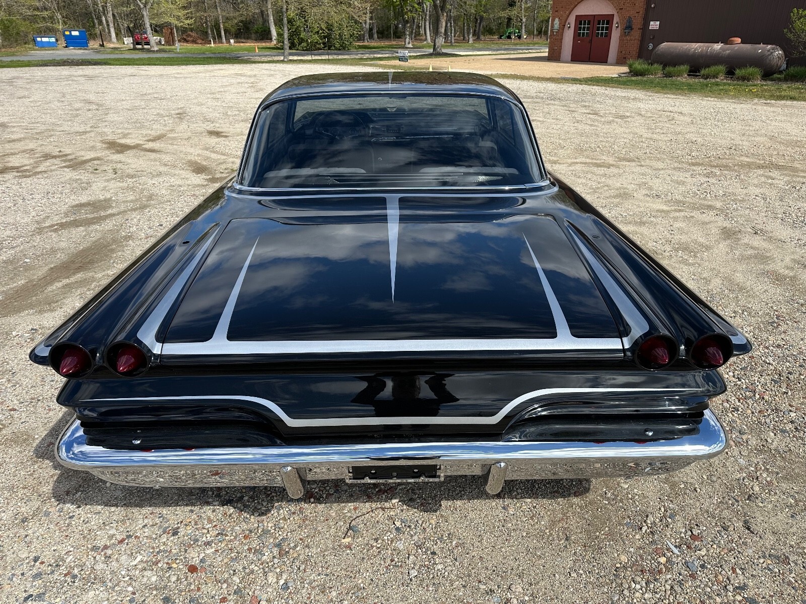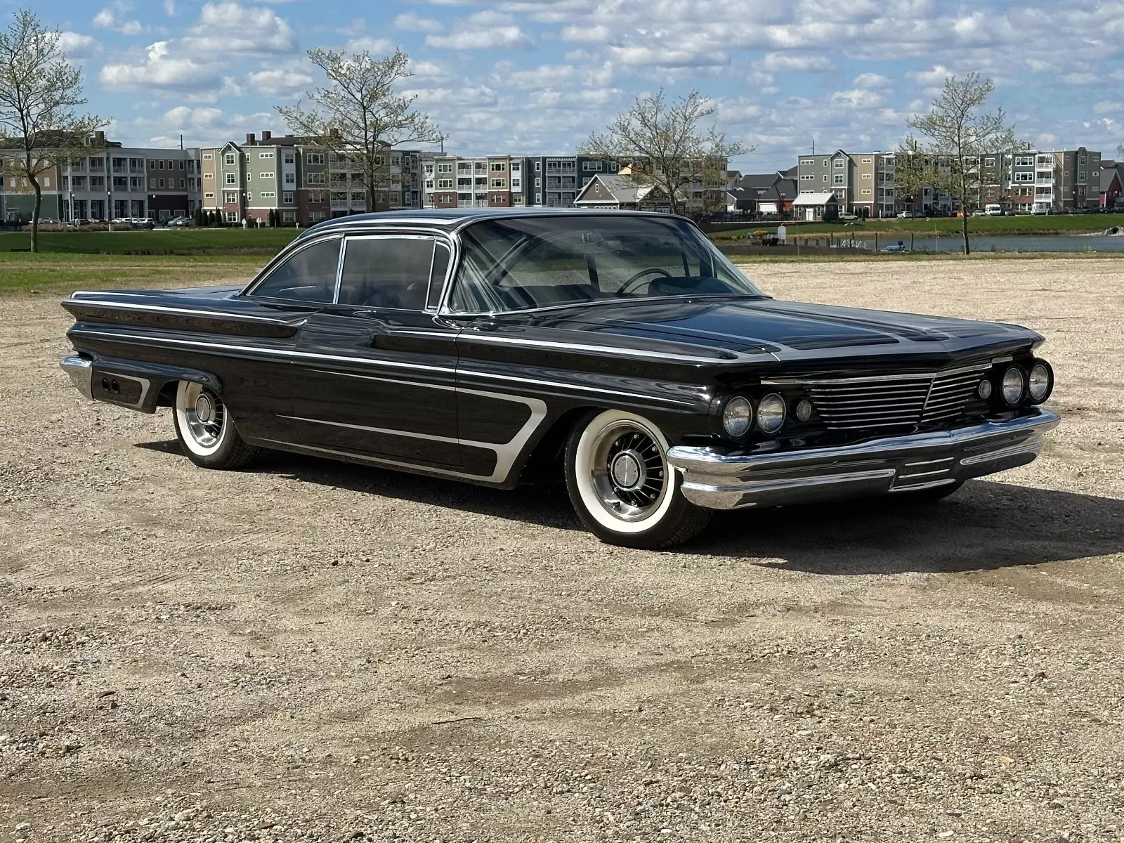 This 1960 Pontiac Catalina was purchased by the current owner in 2000 and underwent eight years of modification and refurbishment work that was completed in 2022. Power is provided by a tri-power-topped replacement 389ci V8 and mated to a four-speed manual transmission, and it is refinished in metallic black over black and gray leather interior. Bodywork involved lengthening the quarter panels, shaving the door handles and trim, and adding 1959 Cadillac tail lights. The suspension was lowered and a custom interior was installed. Additional equipment includes 14″ eight-lug steel wheels, power-assisted brakes, power steering, power windows, and an aftermarket stereo system.The car is refinished in metallic black with silver stripes, and bodywork involved lengthening the quarter panels, shaving the door handles, adding Frenched antennas, painting the headlight bezels, removing the reverse lights, emblems, stainless trim, and hood trim, and filling the package tray joints. The fuel filler was relocated behind the license plate, exhaust outlets through the rear quarter panels were added, 1959 Cadillac tail lights were installed, and the glass and window trim were replaced.