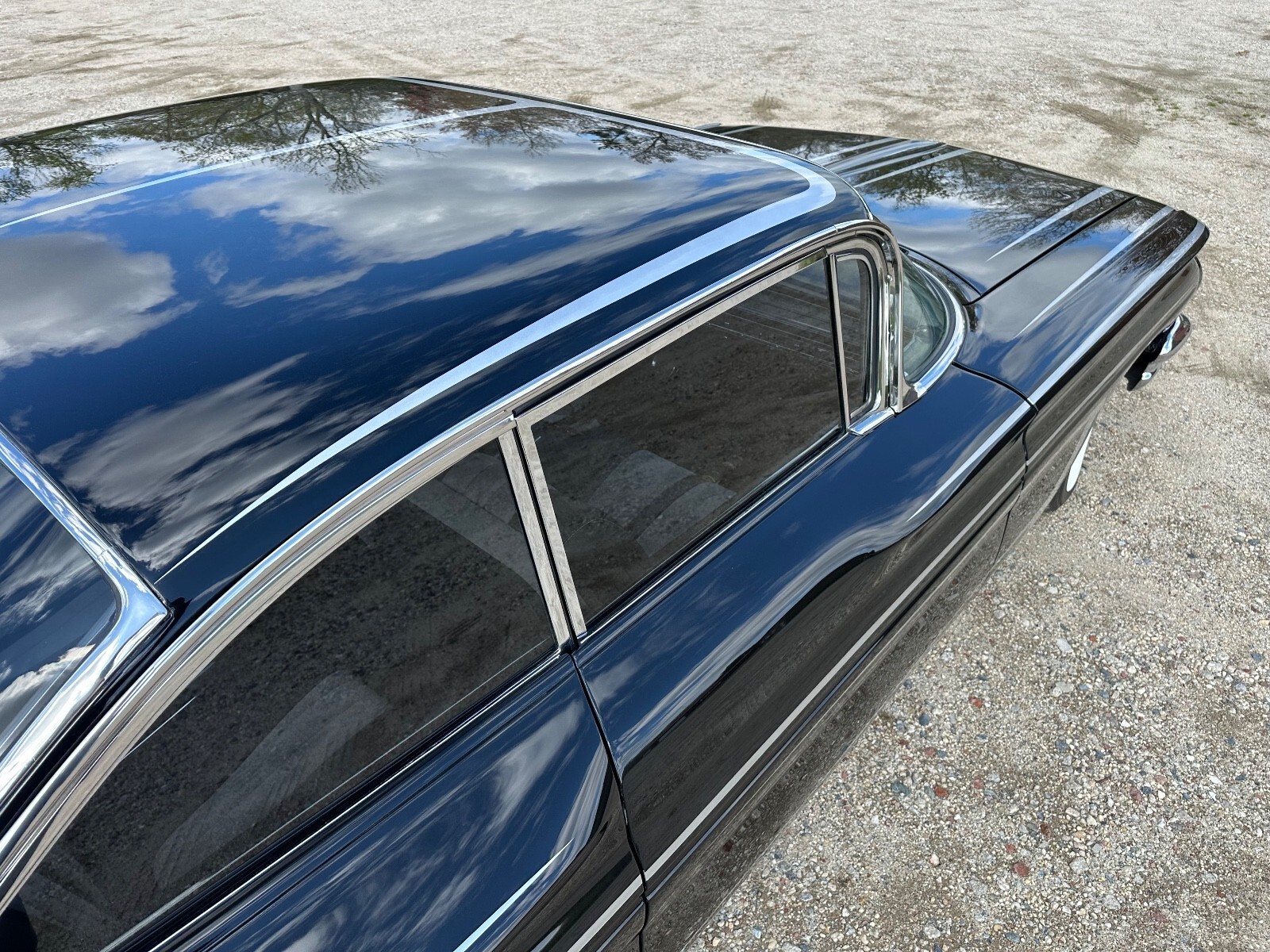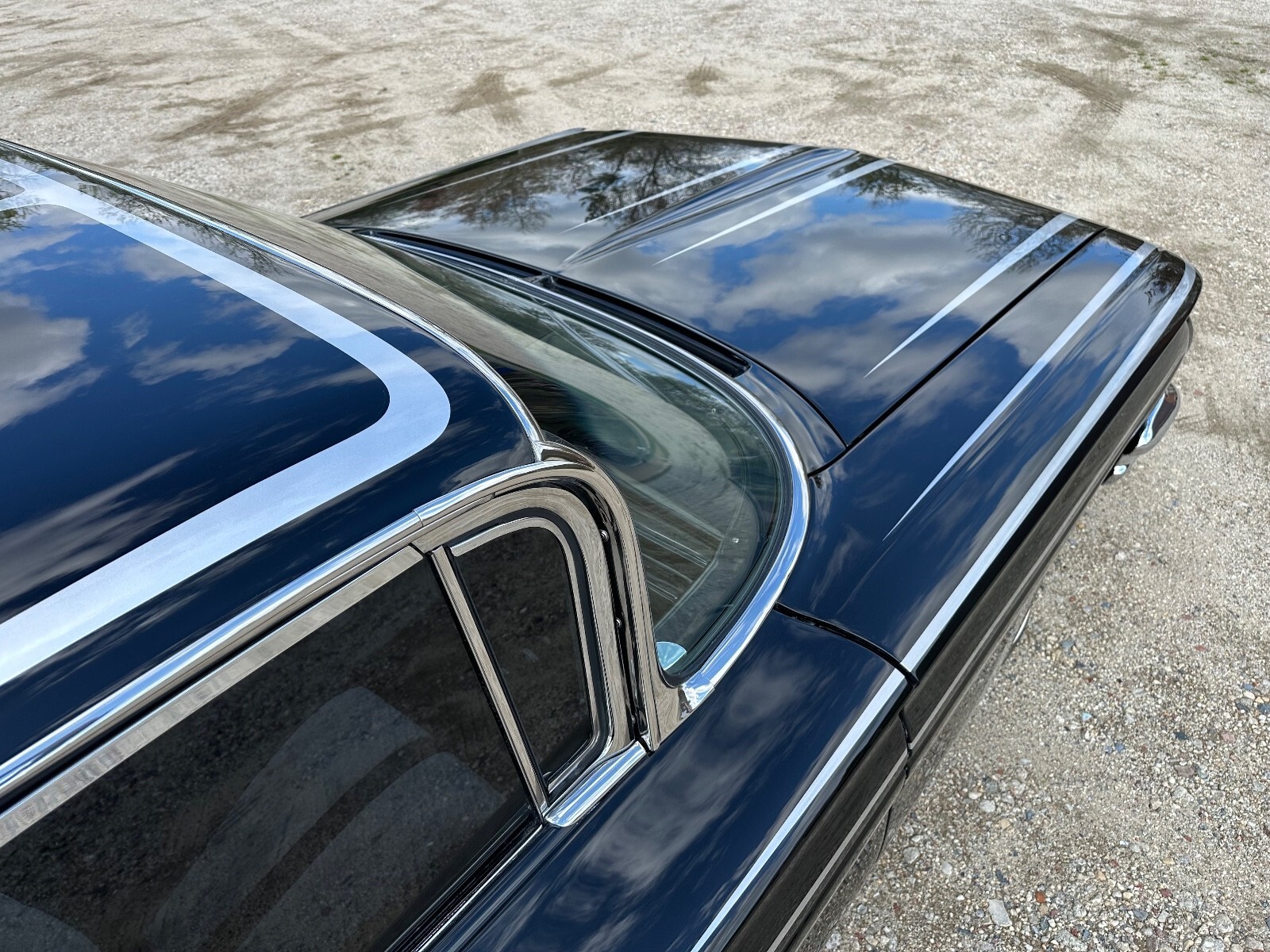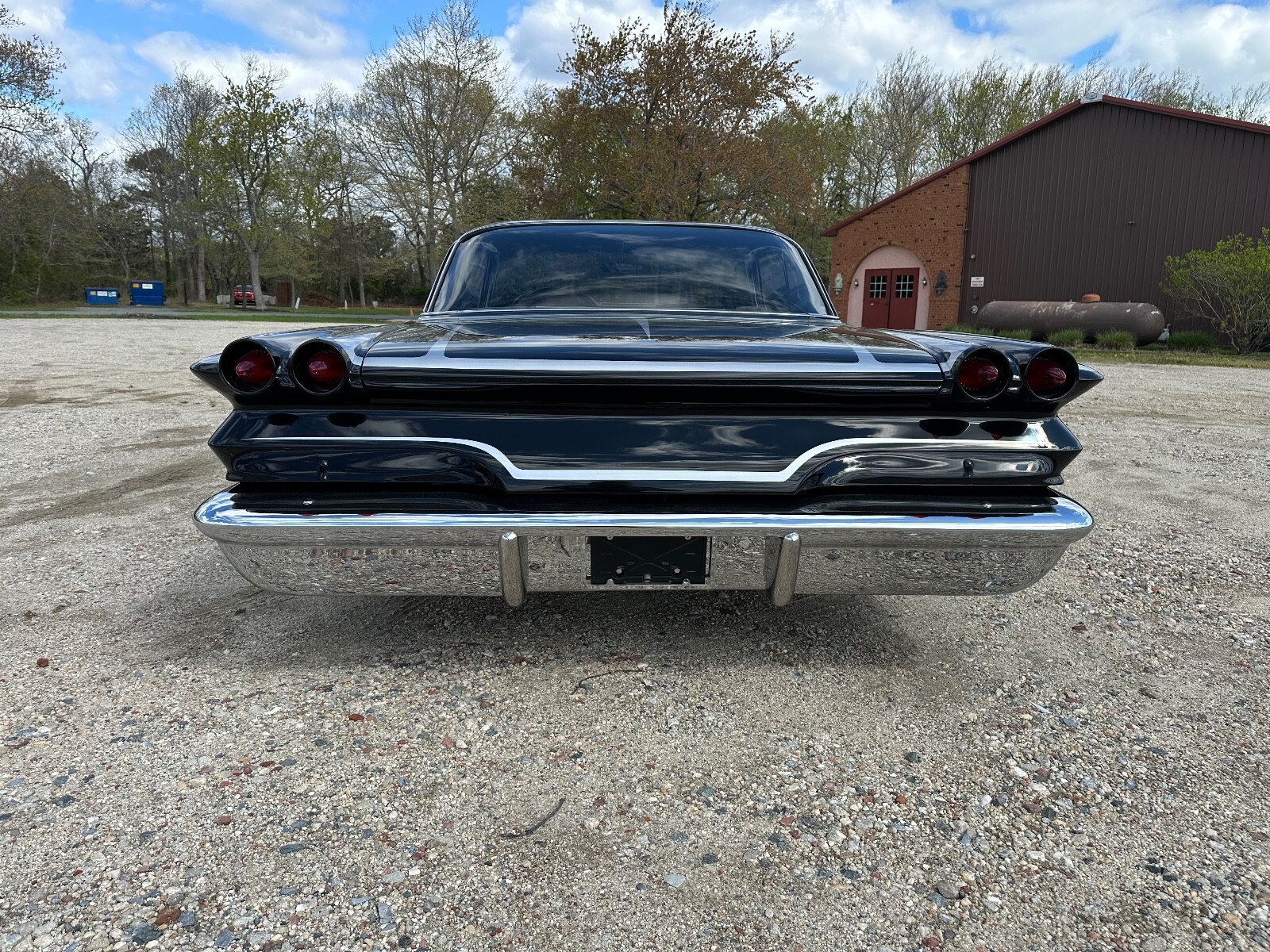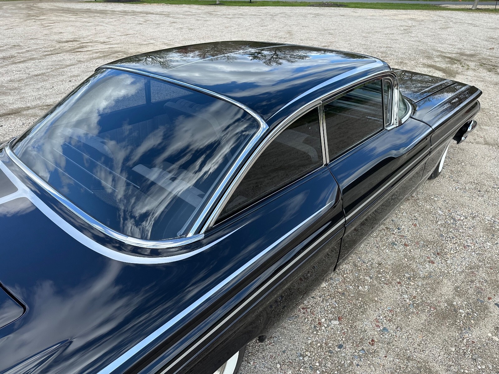 This 1960 Pontiac Catalina was purchased by the current owner in 2000 and underwent eight years of modification and refurbishment work that was completed in 2022. Power is provided by a tri-power-topped replacement 389ci V8 and mated to a four-speed manual transmission, and it is refinished in metallic black over black and gray leather interior. Bodywork involved lengthening the quarter panels, shaving the door handles and trim, and adding 1959 Cadillac tail lights. The suspension was lowered and a custom interior was installed. Additional equipment includes 14″ eight-lug steel wheels, power-assisted brakes, power steering, power windows, and an aftermarket stereo system.The car is refinished in metallic black with silver stripes, and bodywork involved lengthening the quarter panels, shaving the door handles, adding Frenched antennas, painting the headlight bezels, removing the reverse lights, emblems, stainless trim, and hood trim, and filling the package tray joints. The fuel filler was relocated behind the license plate, exhaust outlets through the rear quarter panels were added, 1959 Cadillac tail lights were installed, and the glass and window trim were replaced.