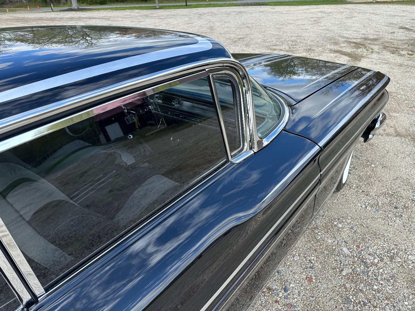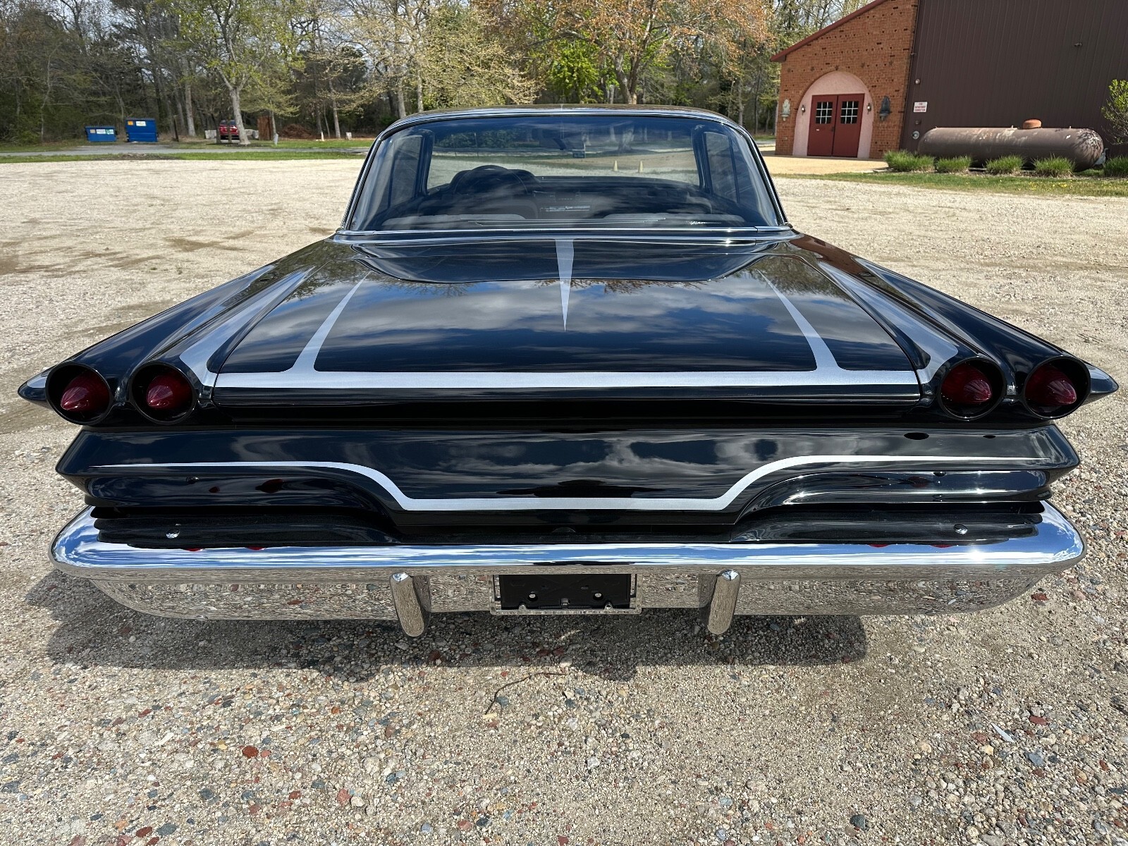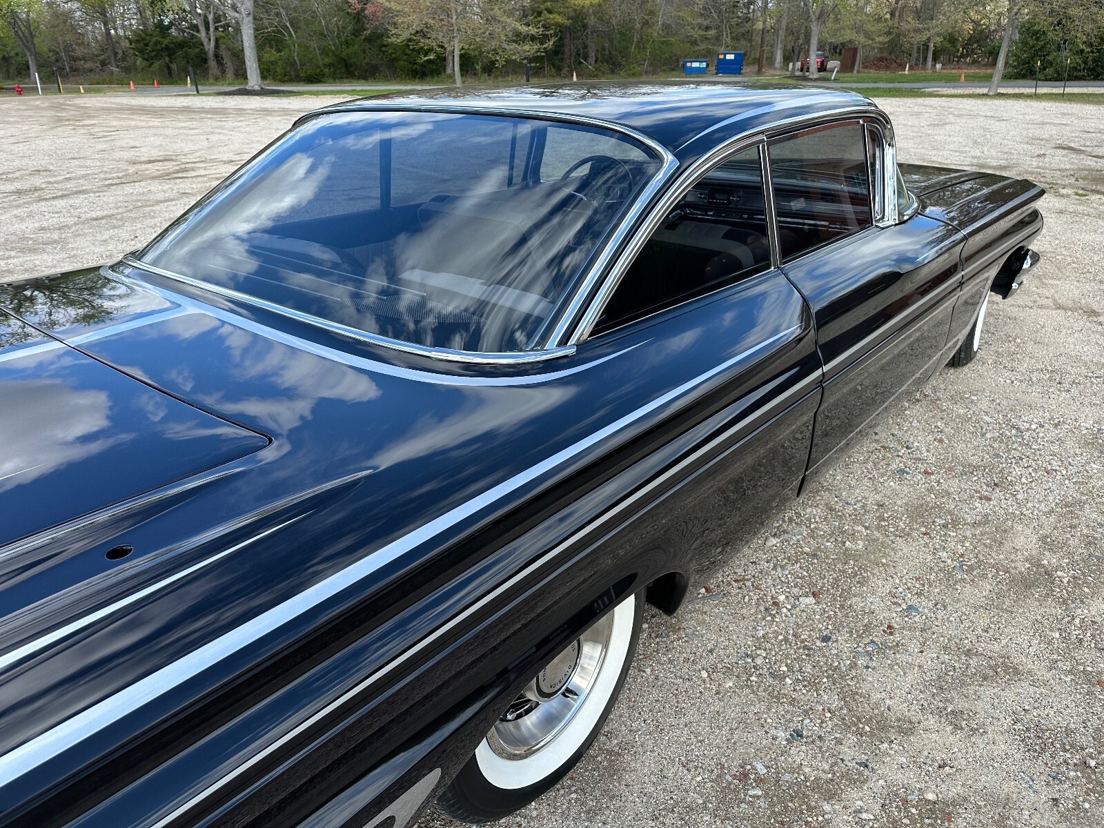 The 14″ eight-lug steel wheels are mounted with whitewall tires. The suspension is lowered, and the front springs and the steering components are chromed. The car is equipped with power steering, and braking is provided by four-wheel power-assisted drum brakes.
