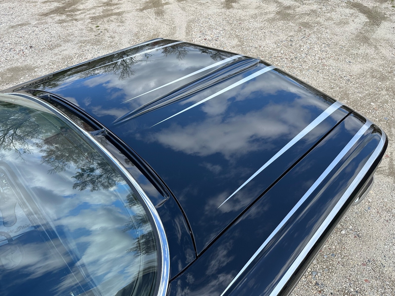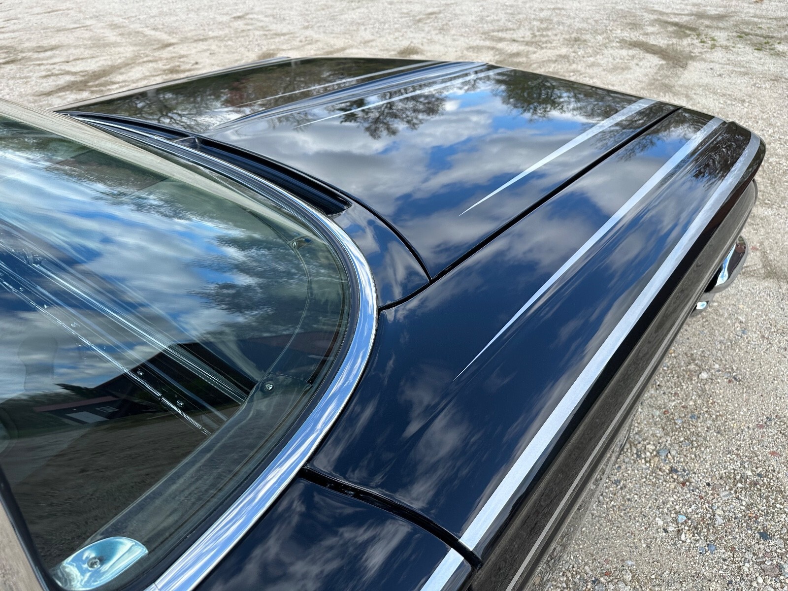 The replacement 389ci V8 is said to be bored .030″ over, and it features three chrome-finished two-barrel carburetors accompanied by a matching intake manifold, valve covers, and accessories. The firewall was smoothed, the frame rails were covered, and the inner fenders were painted black with silver graphics. An electric fan and replacement wiring harness were installed, and the battery was relocated behind the grille.