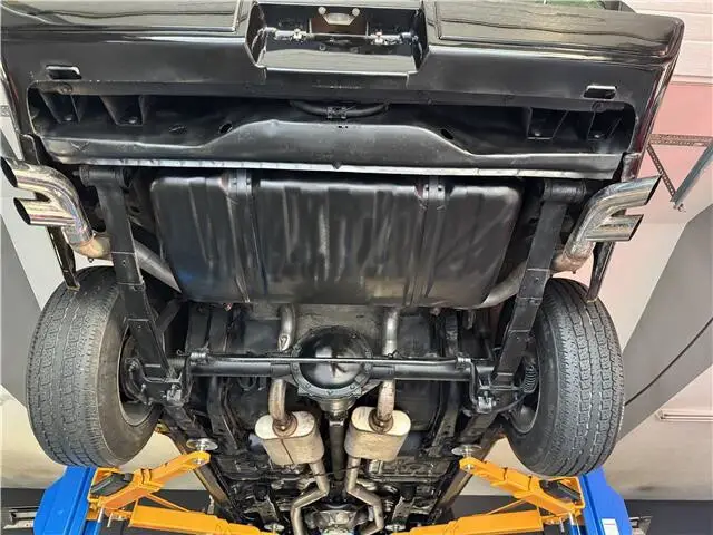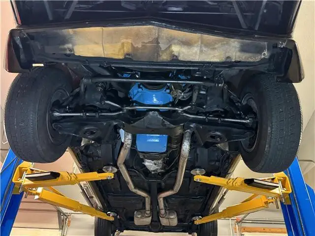 The undercarriage is all clean metal. All the suspension and steering components look good as well as all of the bushings. Looking up at the motor, it is spotless as well as the Borg Warner T-10 4-speed transmission. The floors are all clean and original. It has a dual exhaust system with Flowmaster mufflers and correct splitter exhaust tips. It has a Safe-T-Trac Posi traction rear end. The undercarriage is very clean.