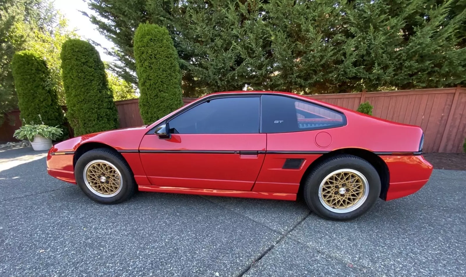This 1988 bright red Fiero is a rare spoiler delete order. I have an original Fiero spoiler that I had painted at a reputable Auto painter with Pontiac red correct paint and it looks amazing so the buyer can decide to either keep it spoiler delete or put on one of the big wings . The car shifts immaculately and the five speed transmission is easy and fun to drive. I have very wide feet and have difficulty with the clutch and brake being so close but this car is a cinch. If you know anything about Fiero GT‘s, they are a blast. This one has the original tan interior with the original floor mats that are rolled up in the trunk, it comes with a car cover. The tires are in excellent condition. I put a battery disconnect on it because I go weeks and weeks without driving it and the battery disconnect is pictured in one of the photos. The car has a seat and it works just fine. At one point it had a vintage Clifford, alarm, but I’ve torn most everything out, including the little siren and the wiring in the back. The only thing that is an issue is the radio, sometimes it works sometimes it doesn’t and sometimes it’s just the left speaker I would go under the dash but I’m way too old and I’m not limber enough so I’m gonna leave it for the buyer to deal with. Questions are welcome and I will take additional photos upon request.