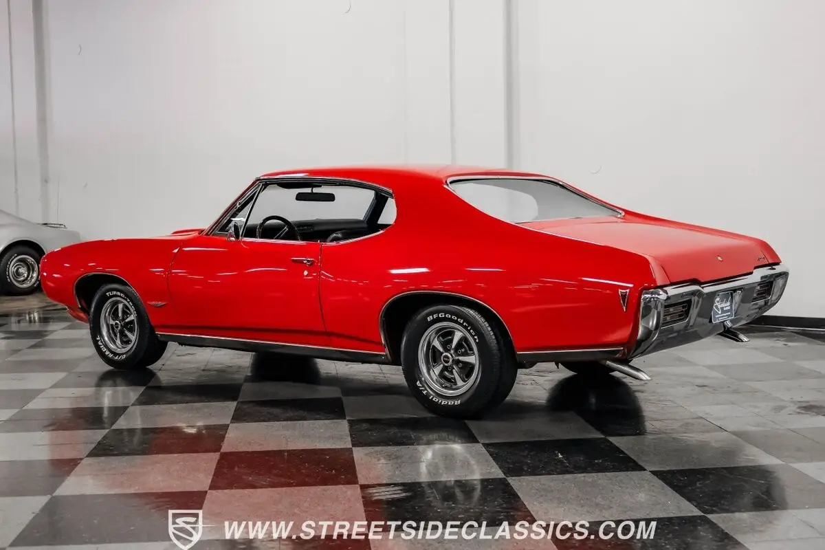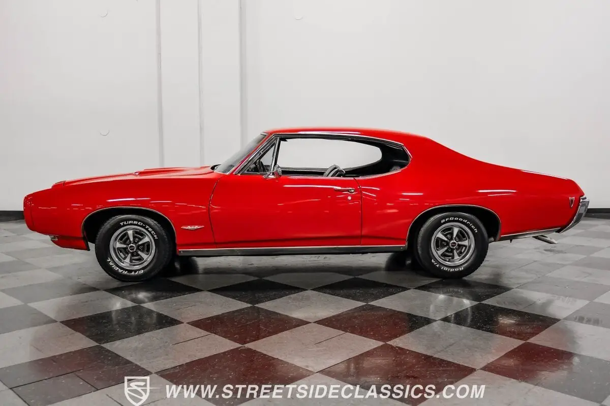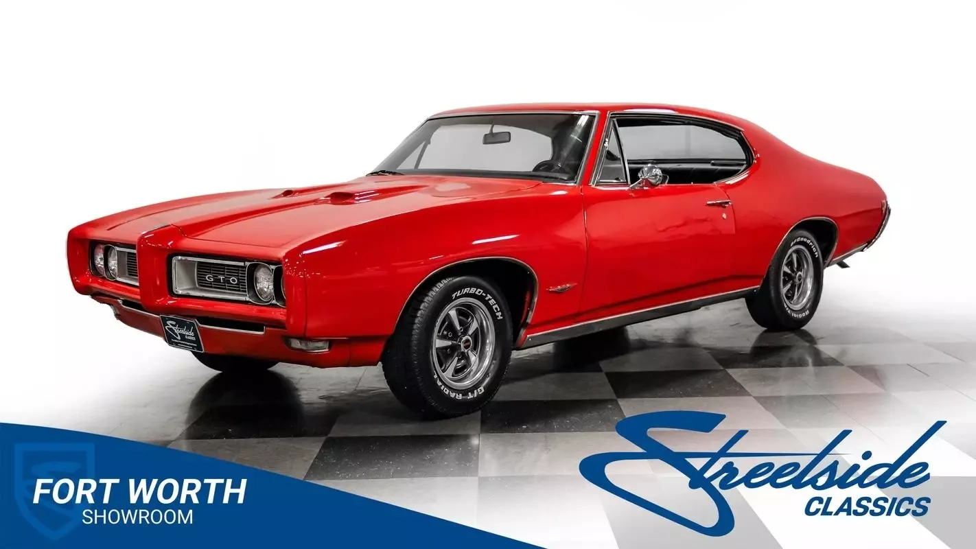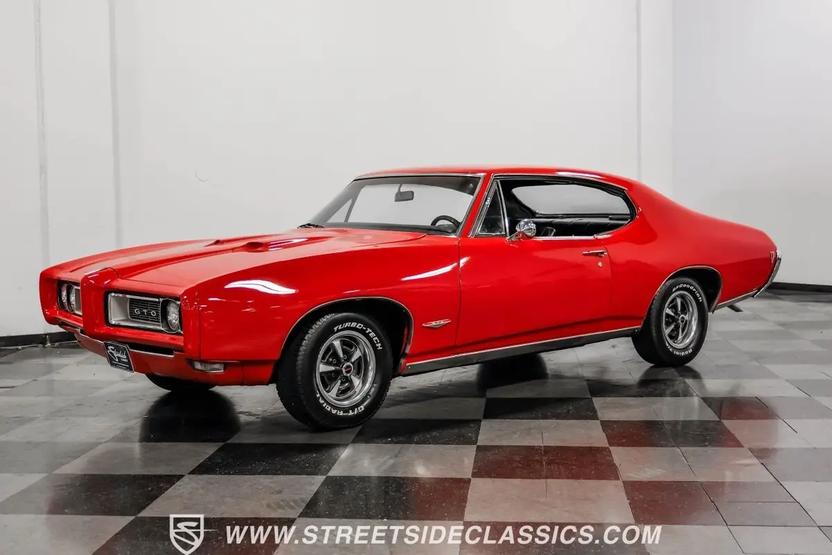 This 1968 Pontiac GTO, all muscle clad in an exciting Red color that seems to stretch into infinity, asserts its dominance with more than just its color. Its distinctive hood, crowned with dual scoops add to its muscle car allure. Mounted on stock 14-inch Pontiac Rally wheels that anchor it firmly to the asphalt, its road presence is undeniable. The car's classic stance is all muscle, with 225/70R14 BF Goodrich Radial T/A tires ensuring that every bit of power is translated directly to the road. This GTO makes an entrance with the unmistakable allure of American muscle.