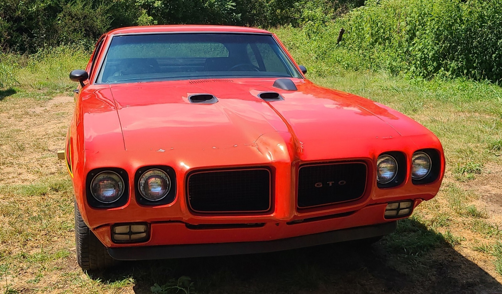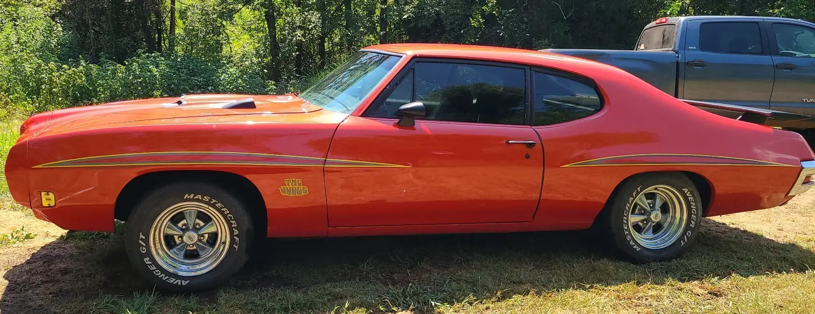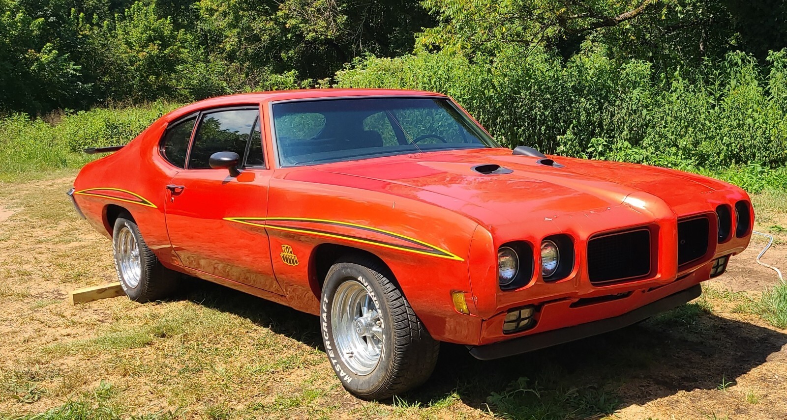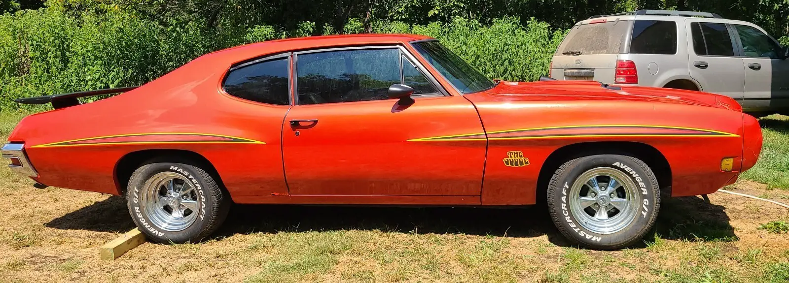 1970 Pontiac LeMans GTO Judge Tribute. a strong Pontiac 455 V8 with Edelbrock carburetor, paired to a Muncie 4-speed transmission with M22 “Rock Crusher” gear set. Detroit Locker limited slip rear end. Cooling system upgraded with aluminum radiator, dual electric fans, and high-volume water pump. Judge stripe and badge package. Runs and drives, solid driver quality with some cosmetic needs (paint cracking and minor rust spots). Clean title in hand.