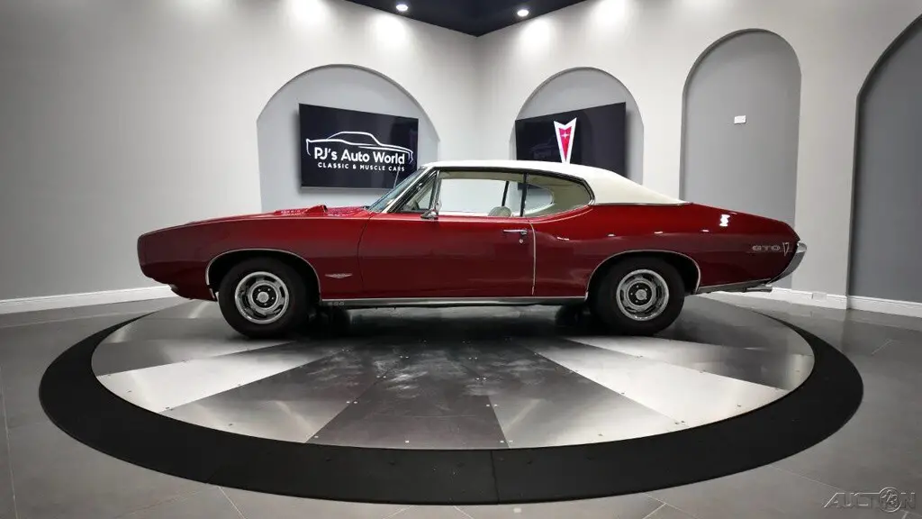 PJ's Auto World is pleased to offer this 1968 Pontiac GTO for Sale. Numbers Matching 400 Cu In (WT engine block factory rated at 360 horsepower), Quadrajet 4 barrel carburetor, dual exhaust, Muncie 4 speed manual transmission, power steering, front power disc brakes, 14" Pontiac Rally Wheels with BF Goodrich red line radial tires, beautiful Code R Solar Red exterior, painted-on pin stripe, scooped hood, hood mount tachometer, white vinyl top, chrome mirrors, Code 224 Parchment bucket seat interior, center console, 3 spoke wood steering wheel, tilt steering column, detailed dash and instruments, in-dash tachometer, working factory AM radio and hidden Custom Autosound remote radio tuner, day night mirror, embroidered floor mats. This is a quality car that drives amazing and guaranteed to p