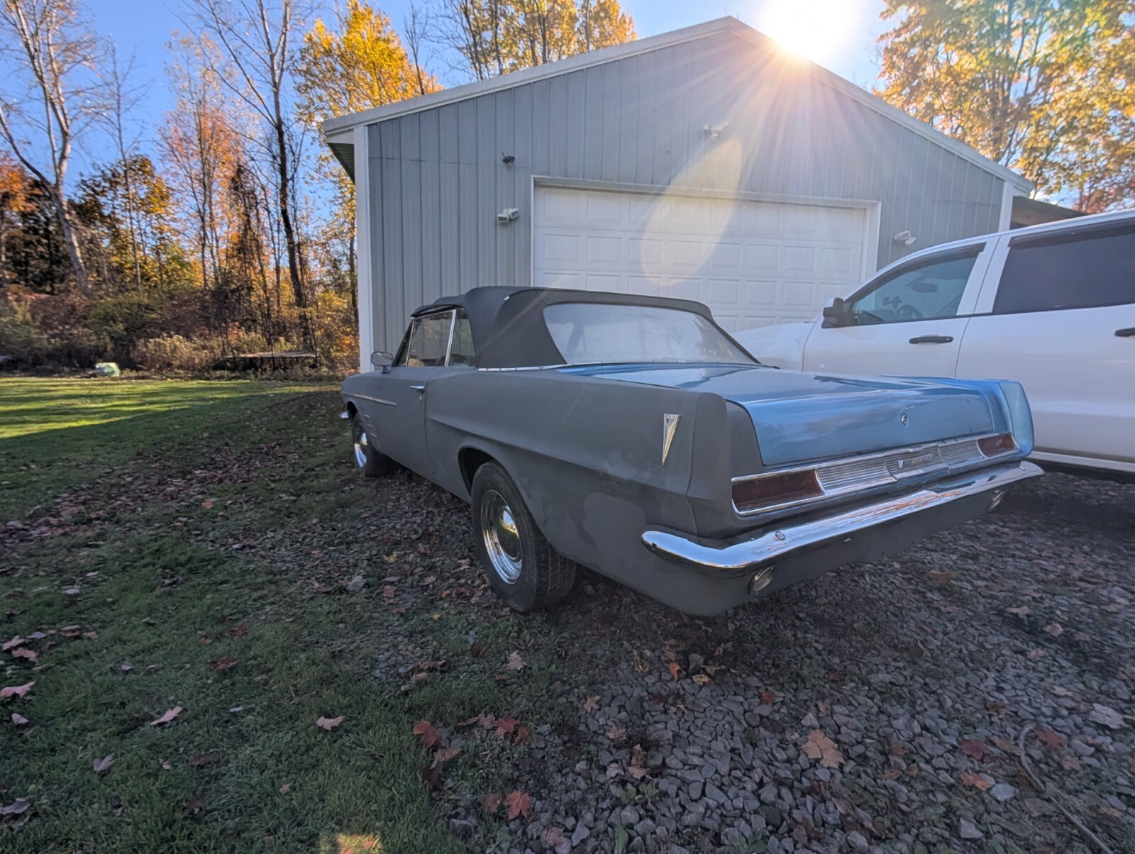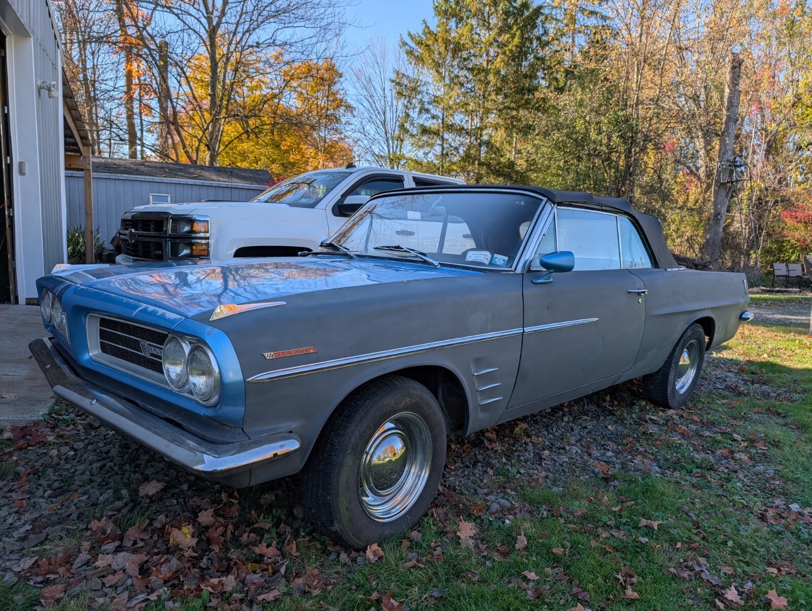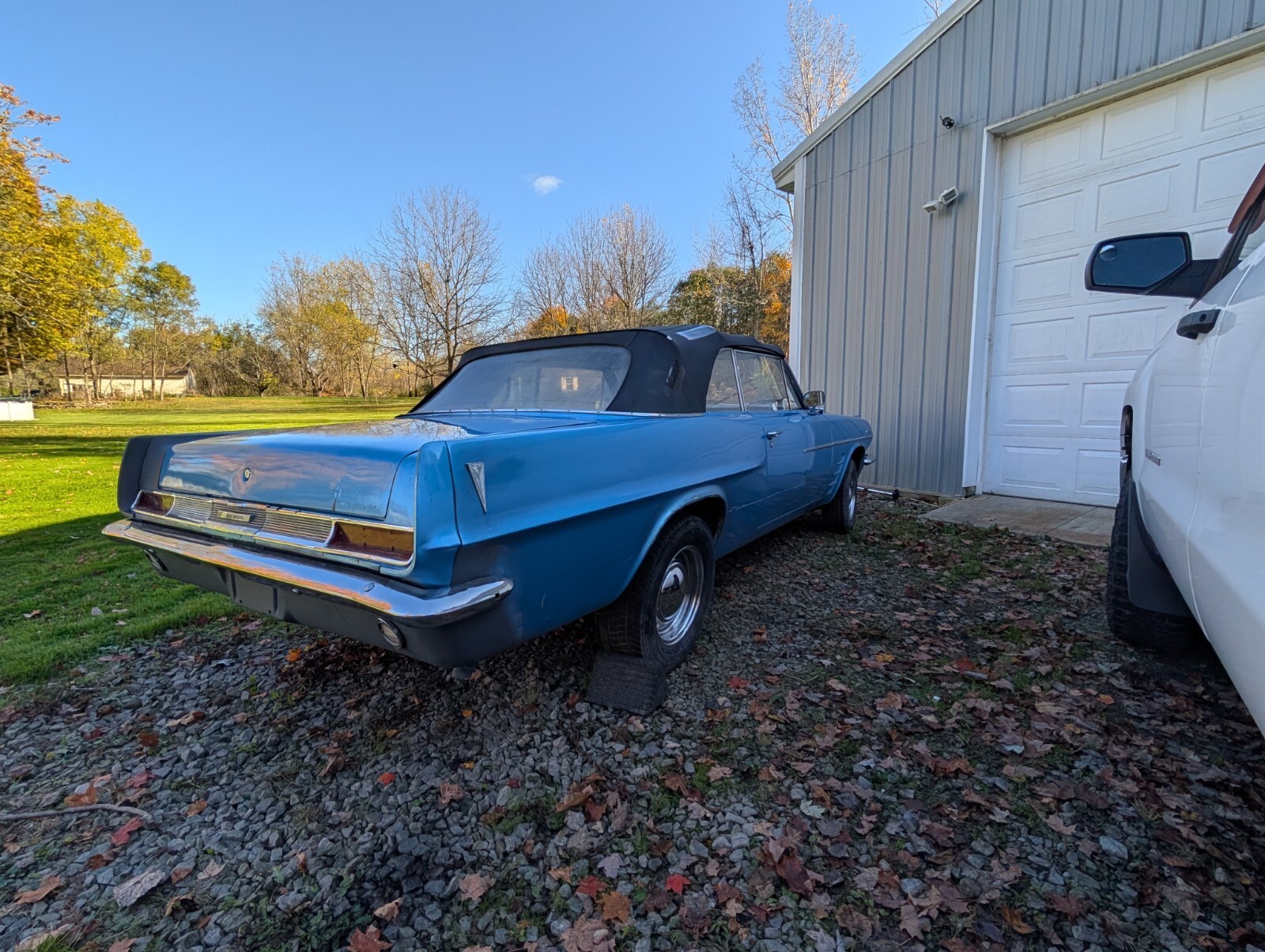• Year/Make/Model: 1963 Pontiac LeMans Convertible 28k on odometer could be 128k • Engine: 326 V8 (336) (said to be rebuilt before purchase in 2013) • Transmission: 2-Speed Automatic with original Rope Drive and Transaxle • Steering: Power Steering • Shifter: Automatic with Floor Shifter • Top: Power Convertible Top