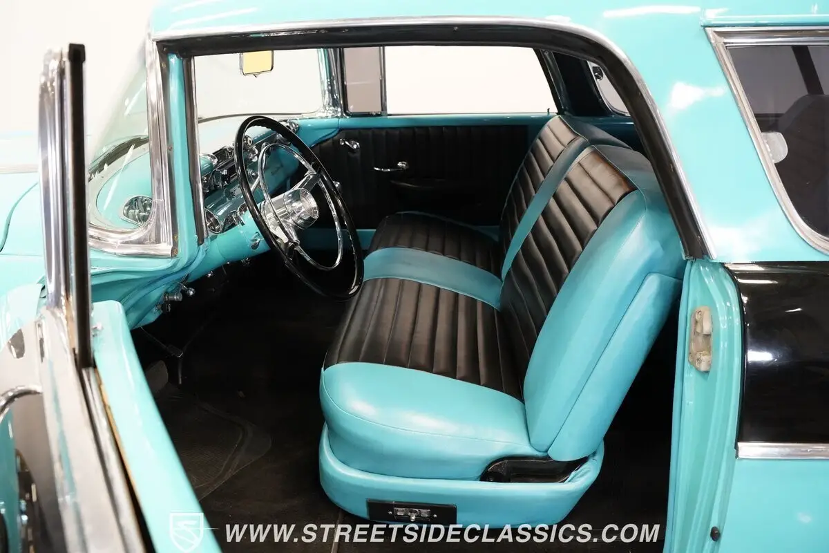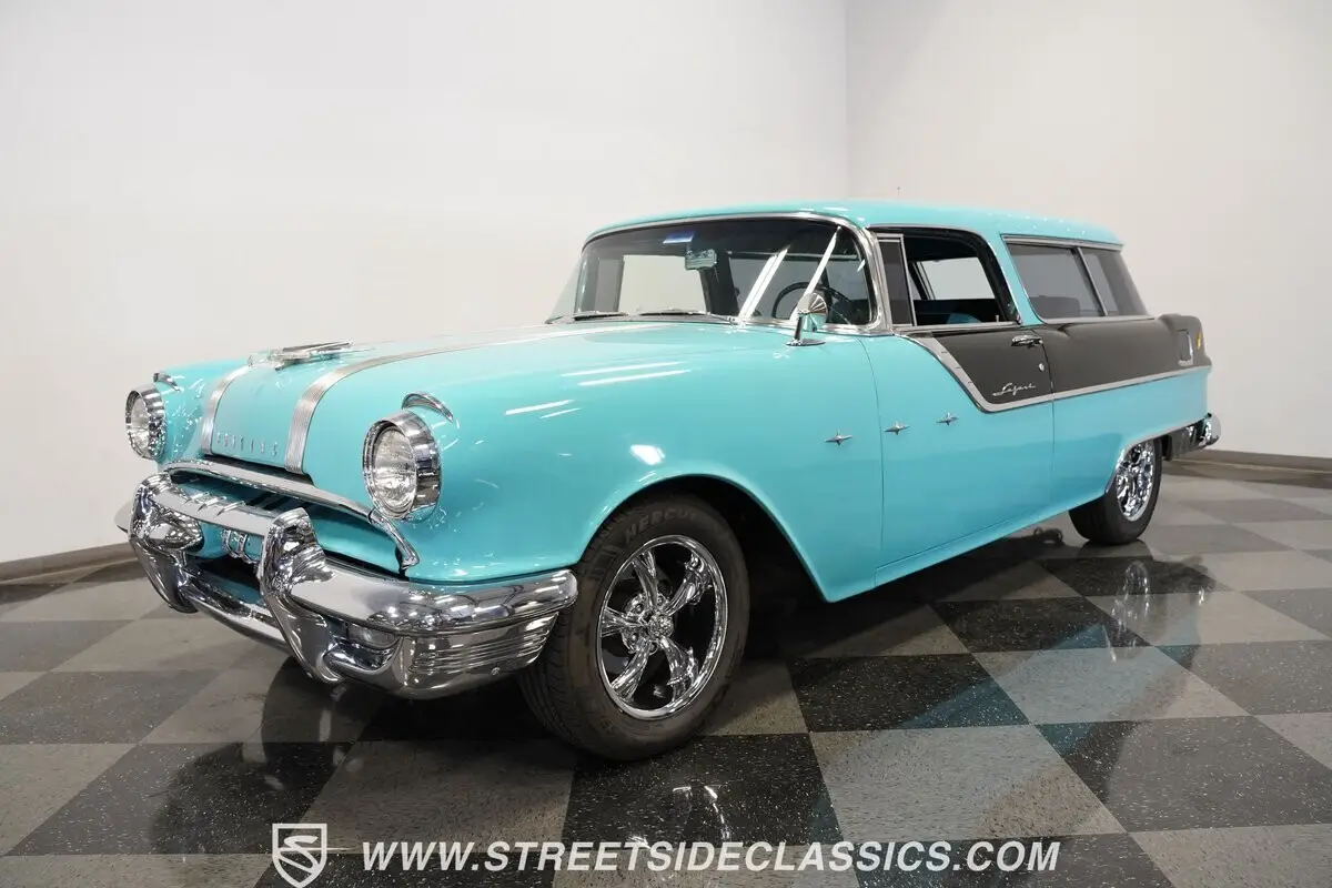 Exceptionally rare with only 3,760 produced, this 1955 Pontiac Safari displays a spectacular two-tone Teal and Black paint scheme that highlights its distinctive wagon profile. The exterior lines pay homage to Chevy's Nomad styling while maintaining Pontiac's unique identity. Chrome Riddler 17-inch wheels add to this Safari's appearance, wrapped in Hercules 215/65R17 tires. Additional exterior features include an illuminating hood ornament, front bumper overrider, and dual exhaust outlets that exit beneath the rear bumper – all adding to this Safari's road presence.