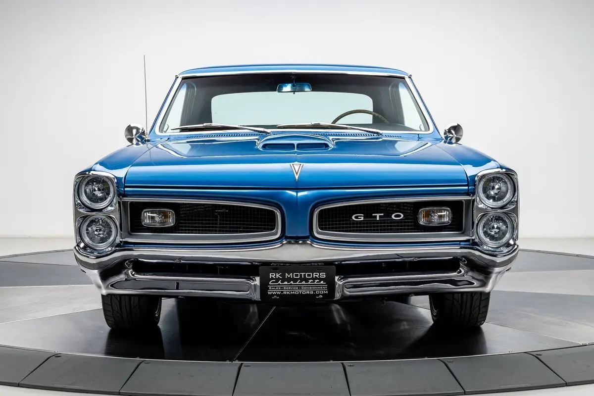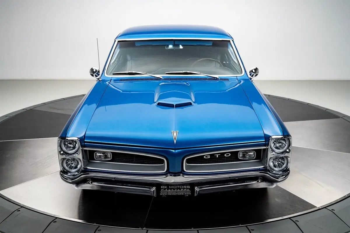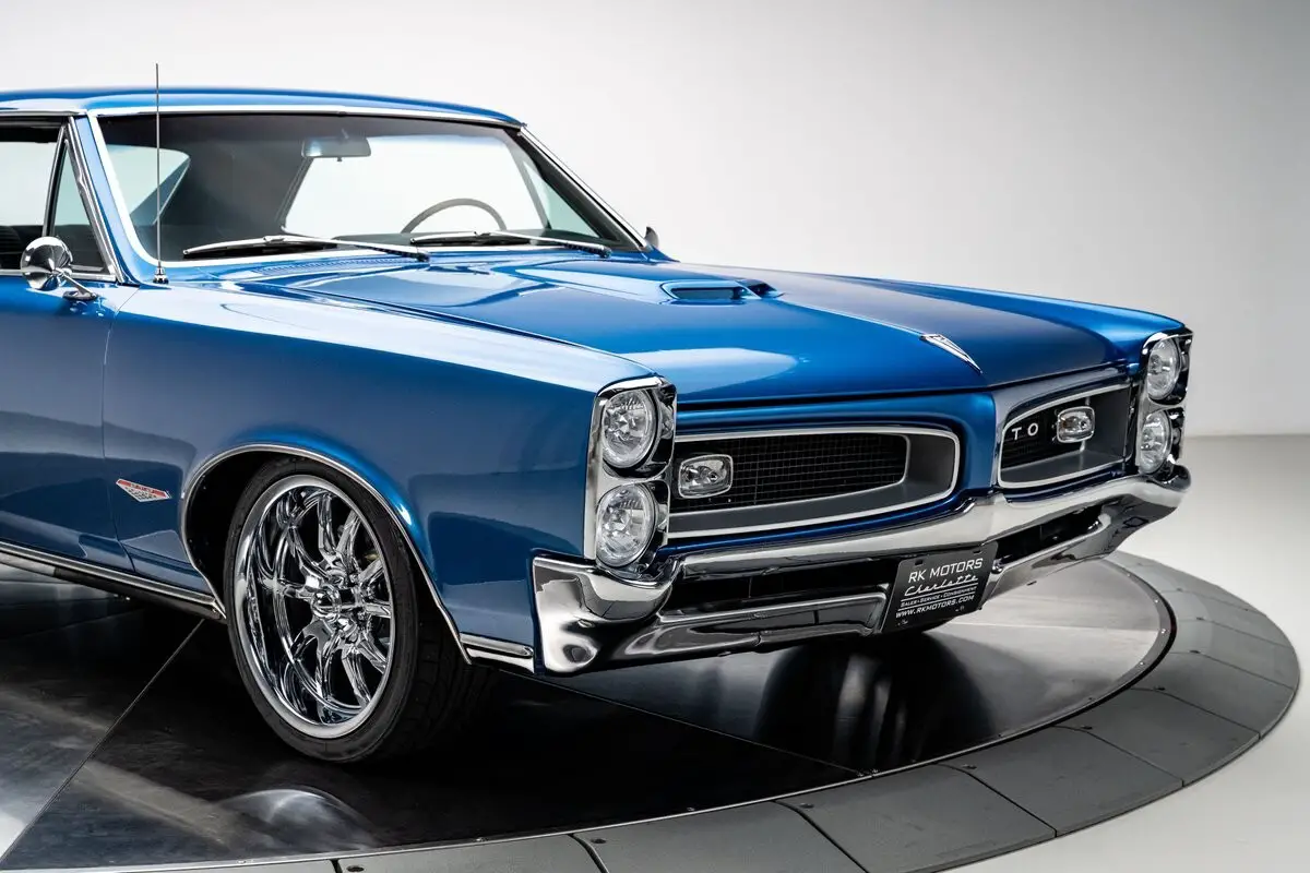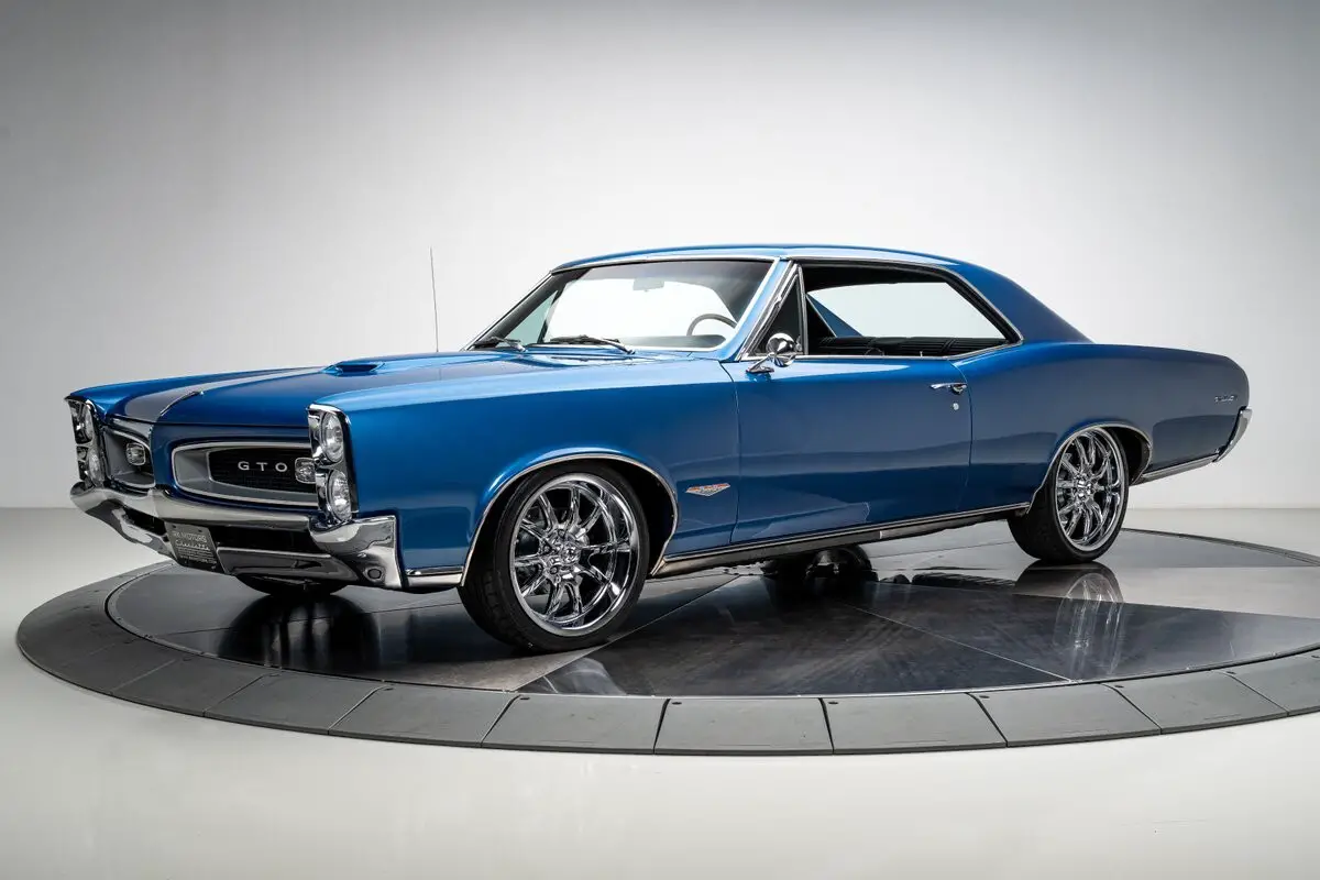 Built to perform as good as it looks, this 1966 Pontiac GTO restomod brings vintage attitude and modern capability together in one sharp package. Finished in a vivid blue hue inspired by Barrier Blue, it keeps its factory shape and stacked headlights but adds LED lighting, chrome Ridler wheels, and a confident, low stance that sets the tone before the key even turns. Under the hood, a 6.0L LS crate engine from The Hot Rod Company delivers reliable power through CNC-ported aluminum heads and FiTech fuel injection. The bay is finished to show quality, with blue engine paint, black hardware, billet accessories, and a carbon-fiber Carbon X brake booster. A Tremec T56 six-speed feeds a 10-bolt rear with 3.23 gears and Positraction, while tubular control arms, Aldan coilovers, MP four-wheel power disc brakes, and power steering make the car handle and stop like something far newer. Inside, classic GTO style meets subtle modern upgrades. Black vinyl upholstery, stainless trim, and a wood-rim steering wheel keep it period-correct, while Dakota Digital gauges, modern air conditioning, and a Custom Autosound Bluetooth stereo with Kicker speakers add comfort and tech. This GTO blends muscle and refinement with purpose. It looks vintage, drives modern, and proves the Goat still has plenty of bite.
